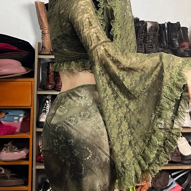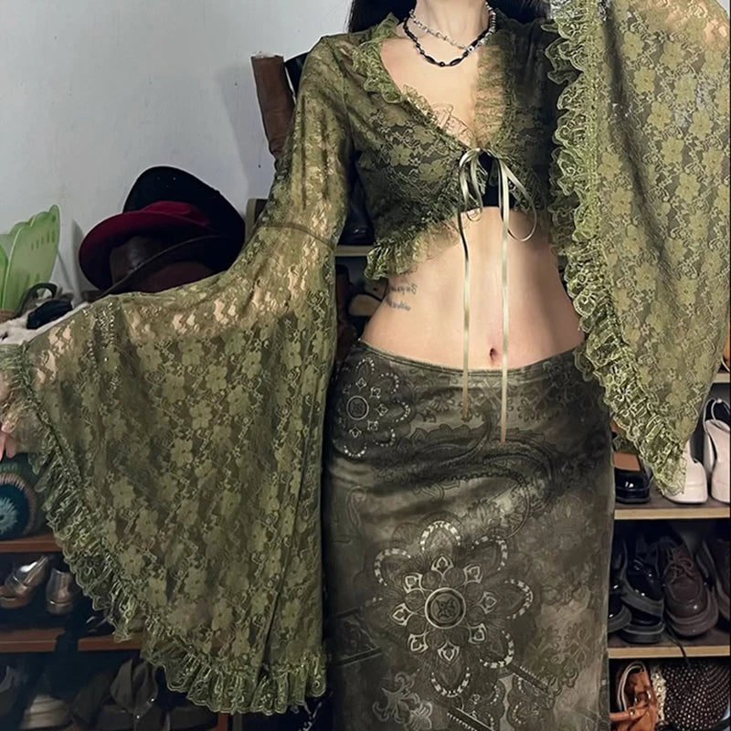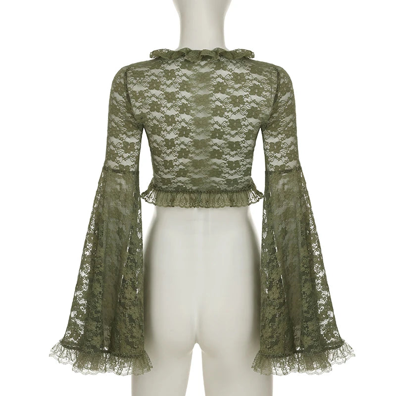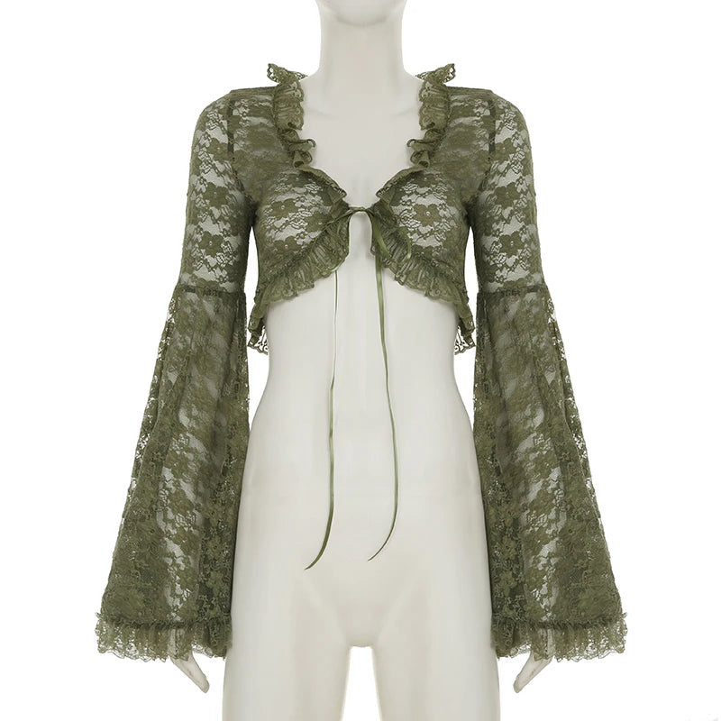 GETADME Green Y2K Mori Girl Flared Sleeve Cardigan For Women Tie-up Lace Cover-Ups Perspective Ruffes Cropped Shirts Coquette
