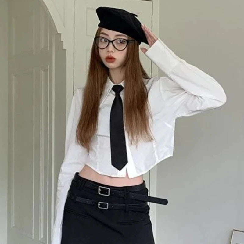 Getadme Preppy White Crop Shirts Women Korean Fashion Jk Tie Long Sleeve Blouse Student College Retro Solid Slim All Match Tops