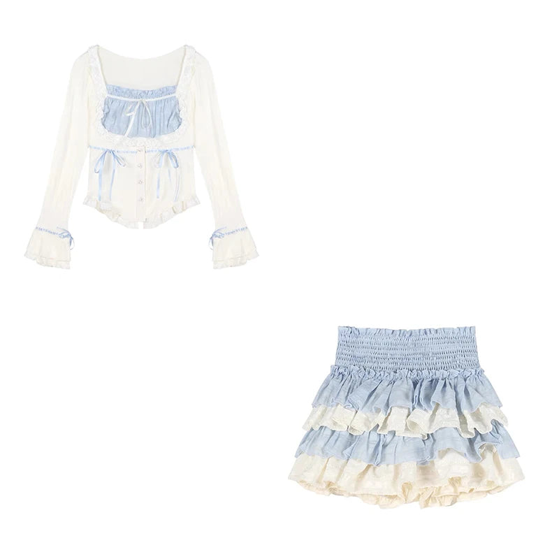 Getadme Kawaii Clothing 2 Piece Skirts Sets Autumn Casuall Japanese Style Y2k Crop Tops Blouse + Mini Skirts Vintage Lolita Suits