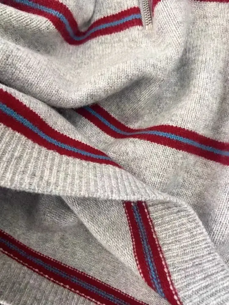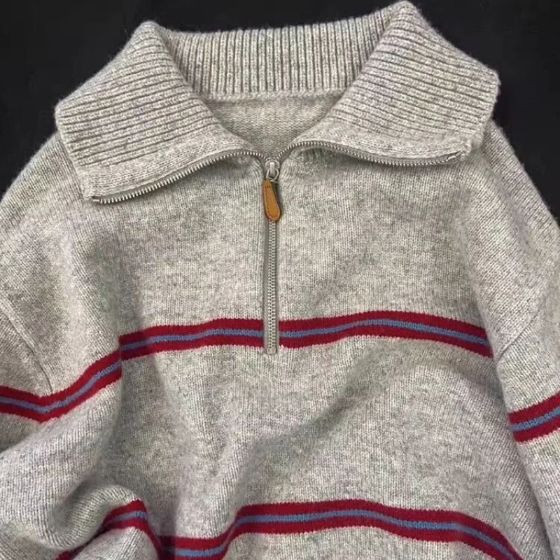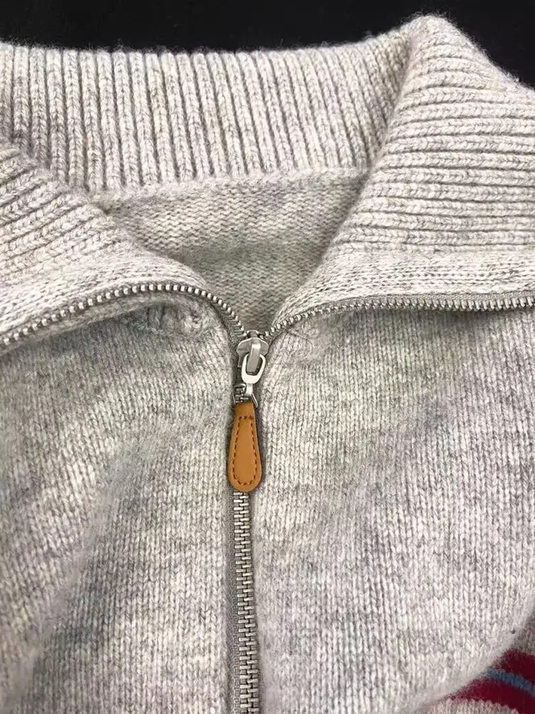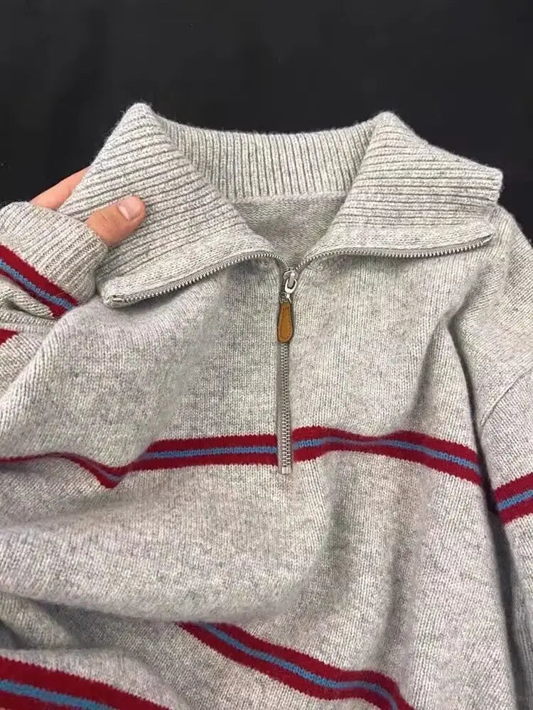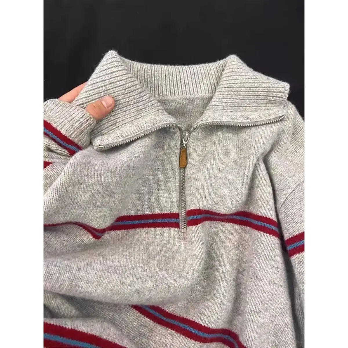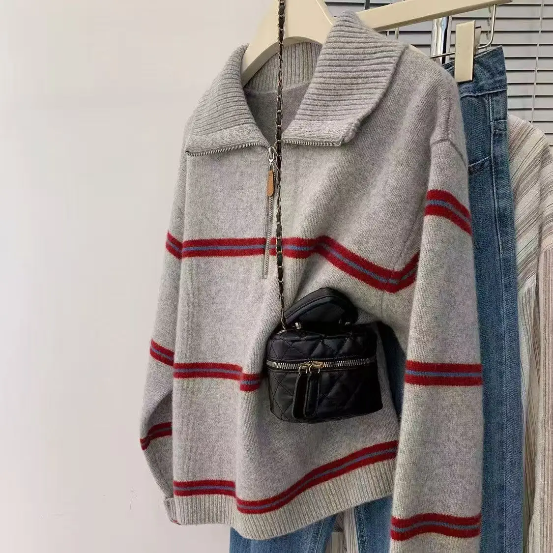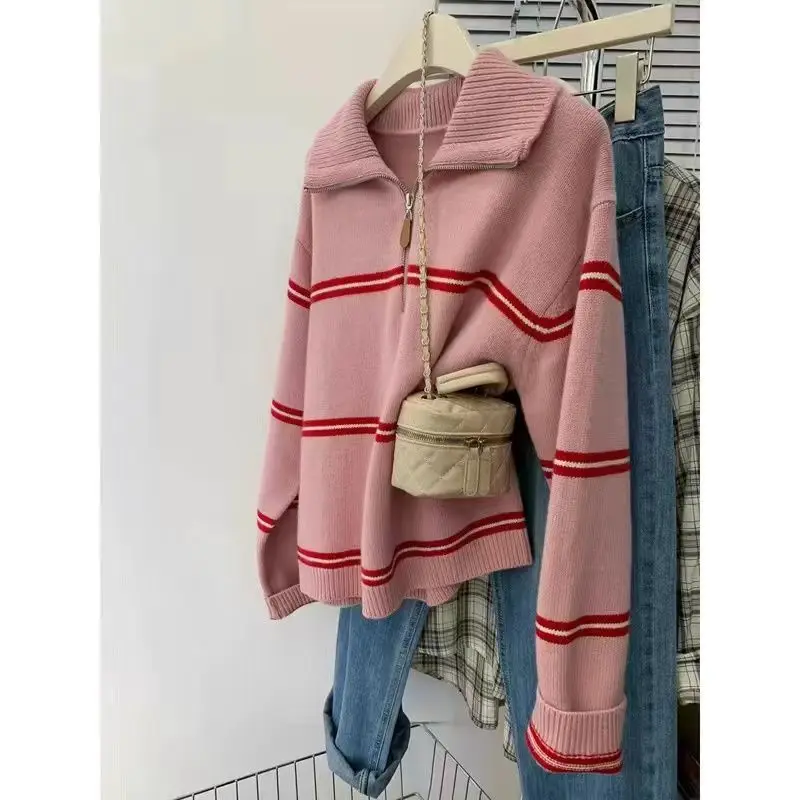 GETADME New autumn and winter zipper striped lapel women sweater loose lazy casual contrast sweater pullover men and women knitted tops