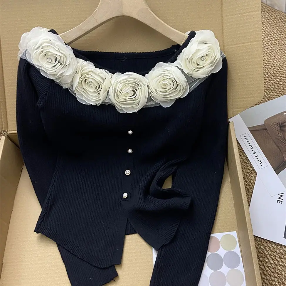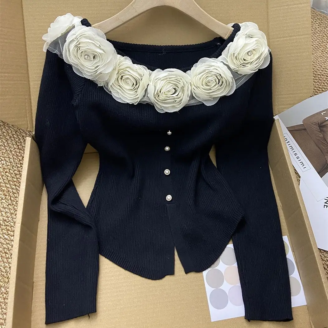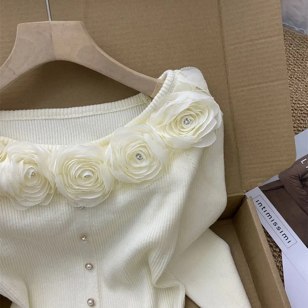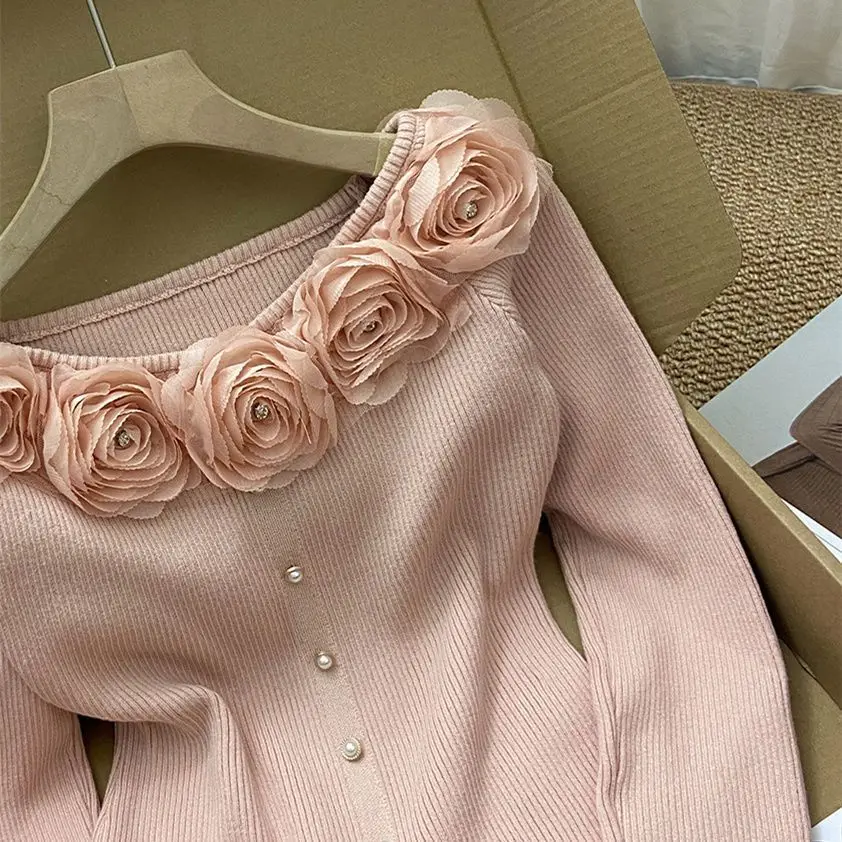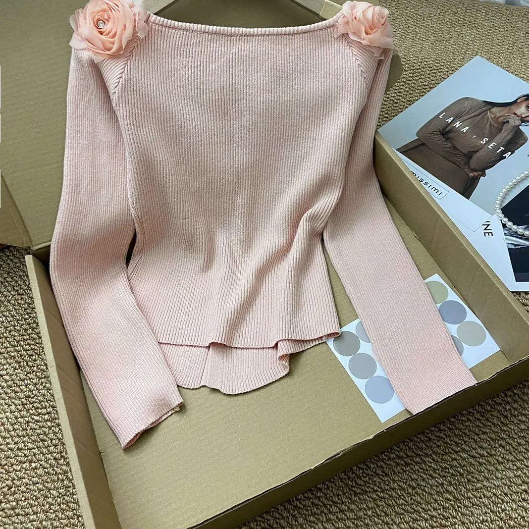 GETADME New Year's Pink Three-dimensional Flower Long-sleeved Slim Top French One-line Base Short Sweater