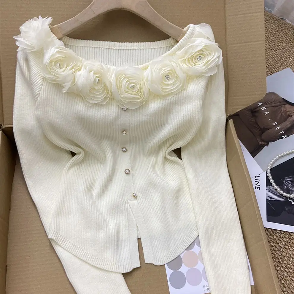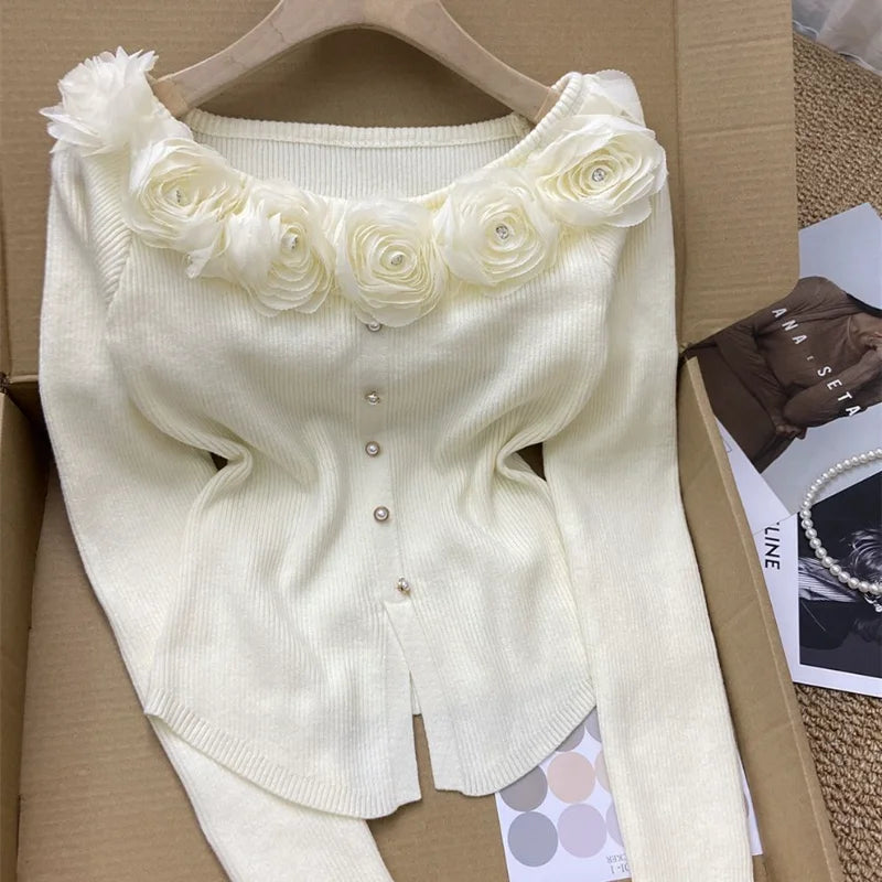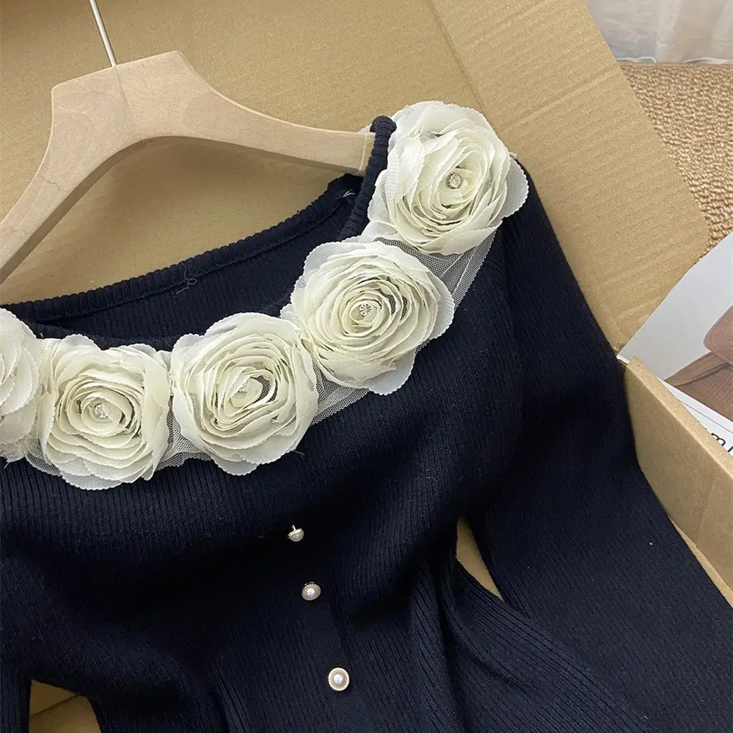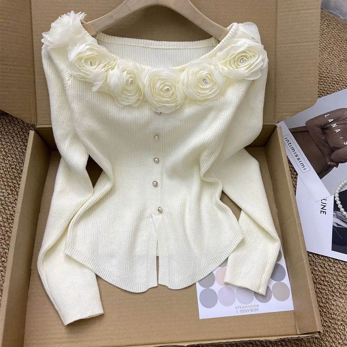 GETADME New Year's Pink Three-dimensional Flower Long-sleeved Slim Top French One-line Base Short Sweater
