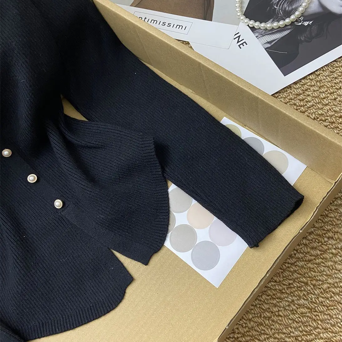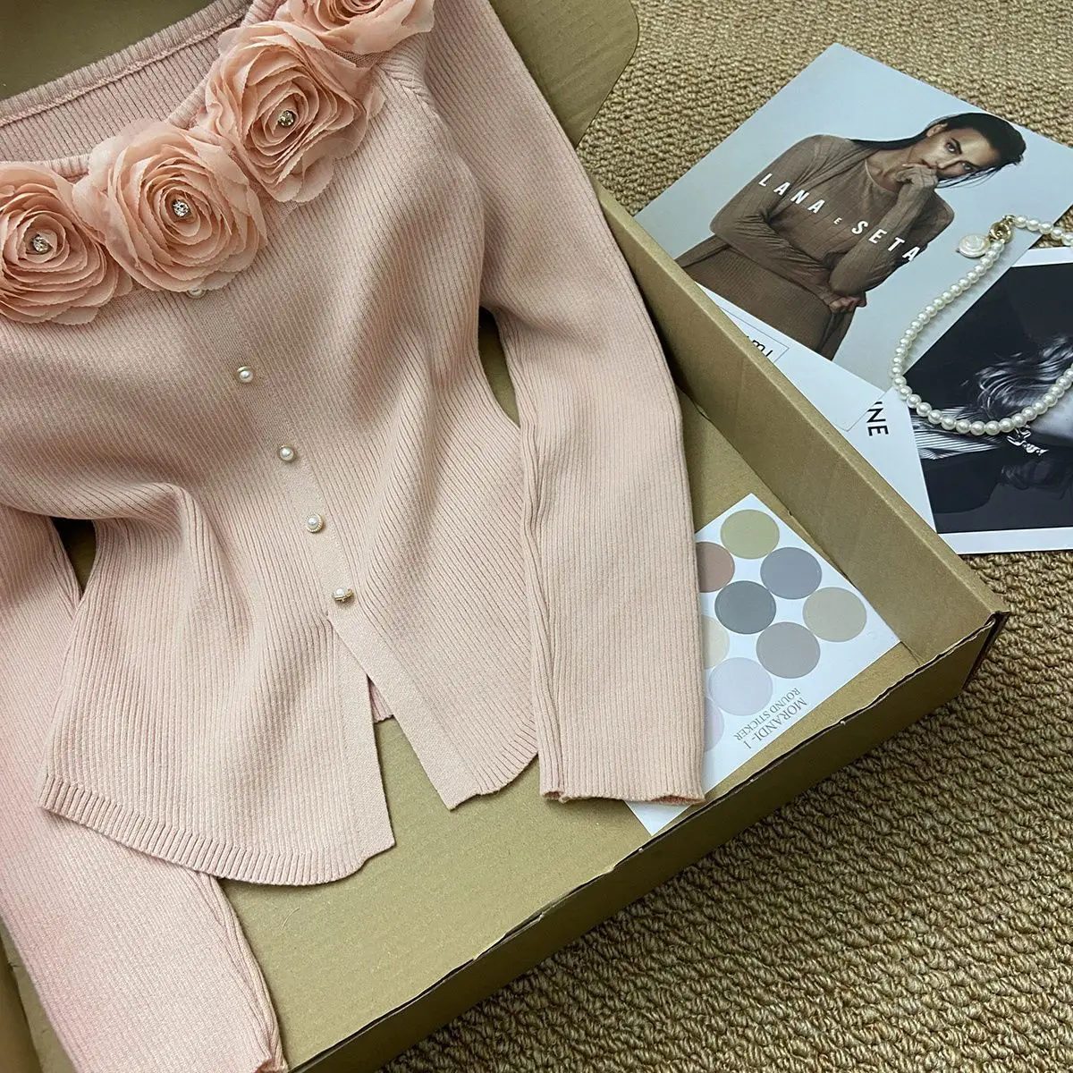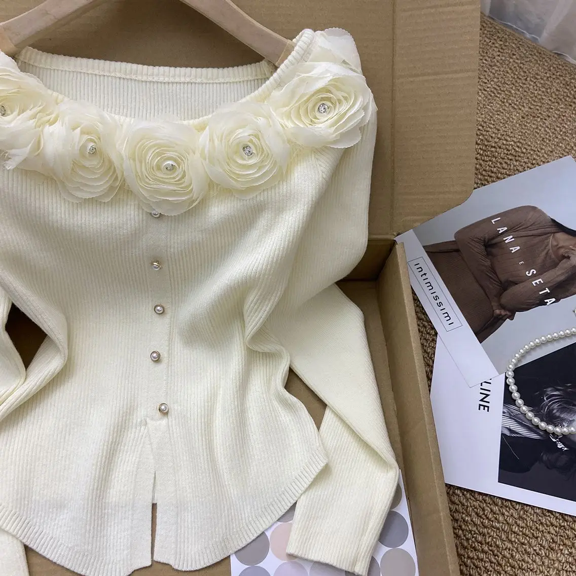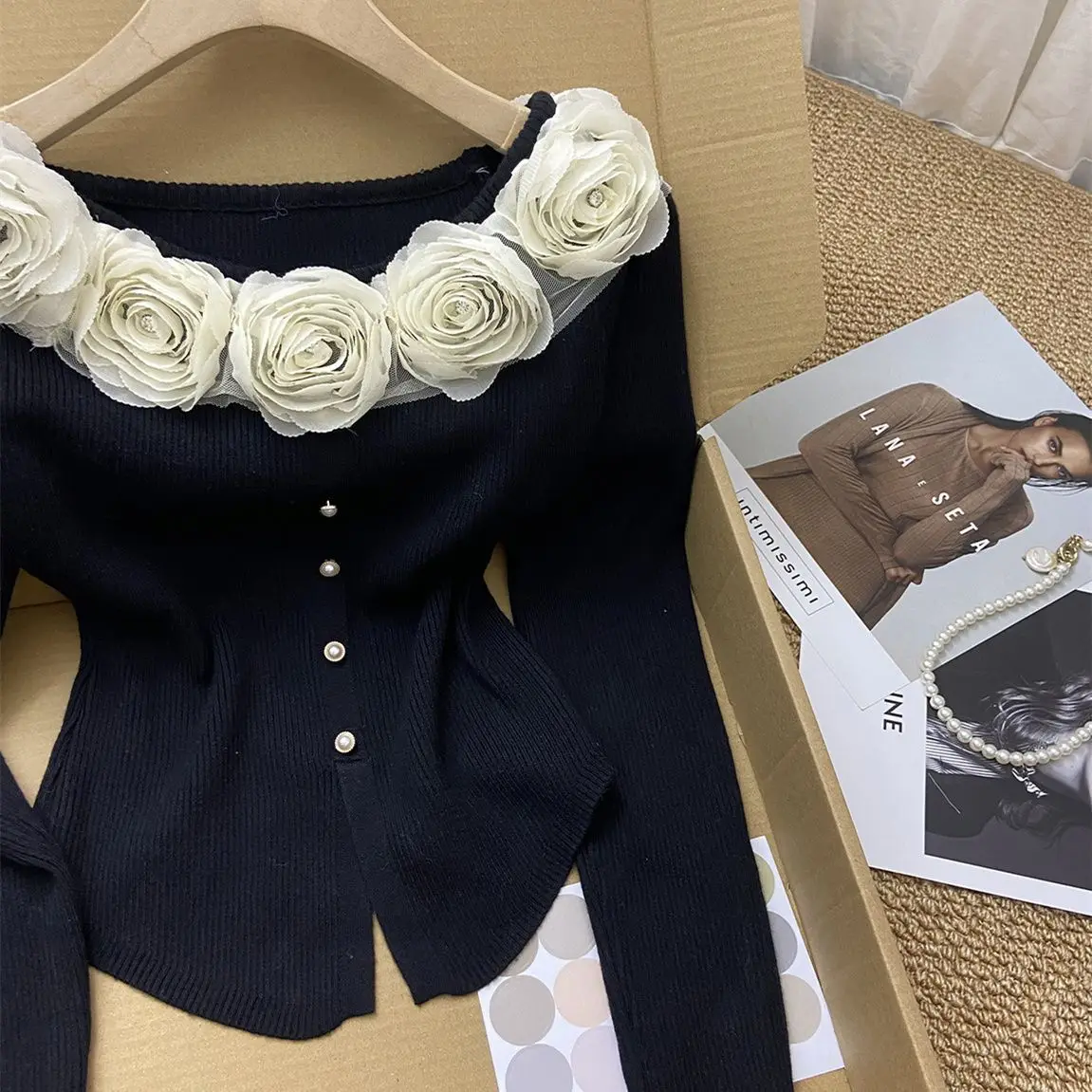 GETADME New Year's Pink Three-dimensional Flower Long-sleeved Slim Top French One-line Base Short Sweater