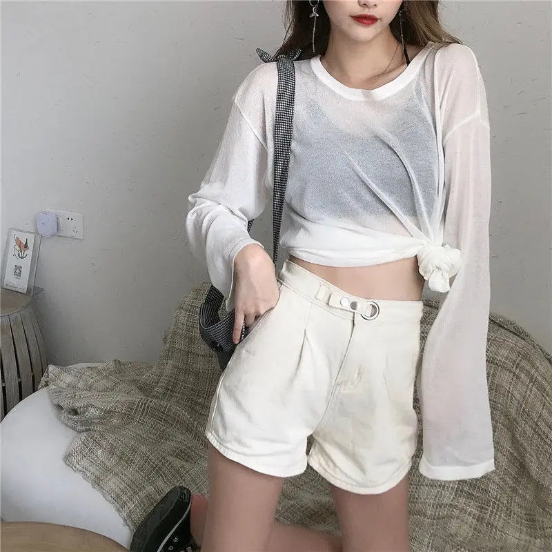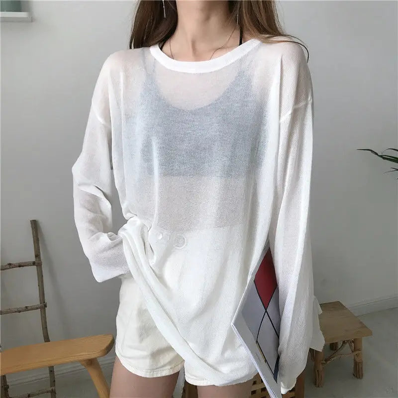 T-shirts à manches longues respirants avec protection solaire pour femmes, col rond, unis, sexy, transparents, noirs et blancs, coupe ample, unisexes, hauts décontractés