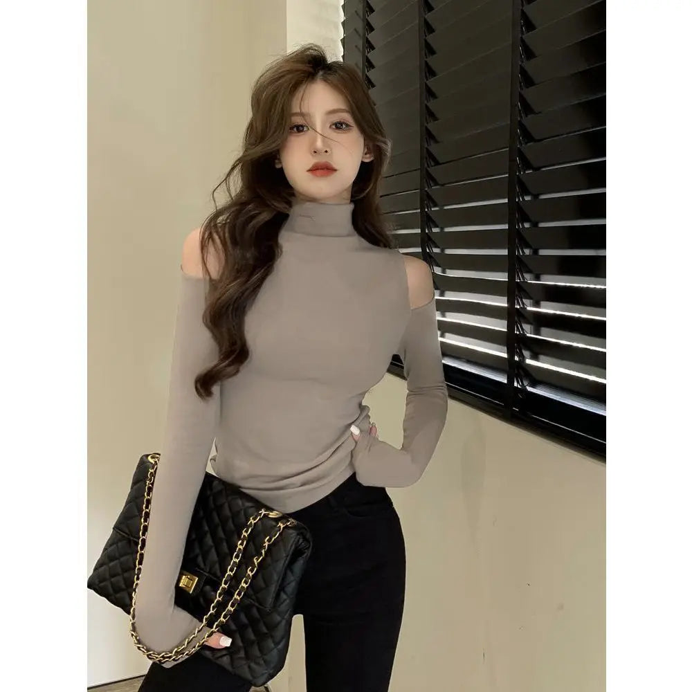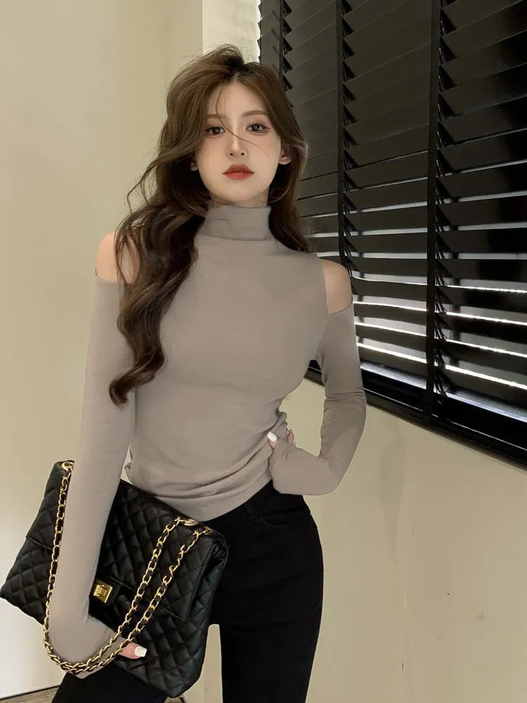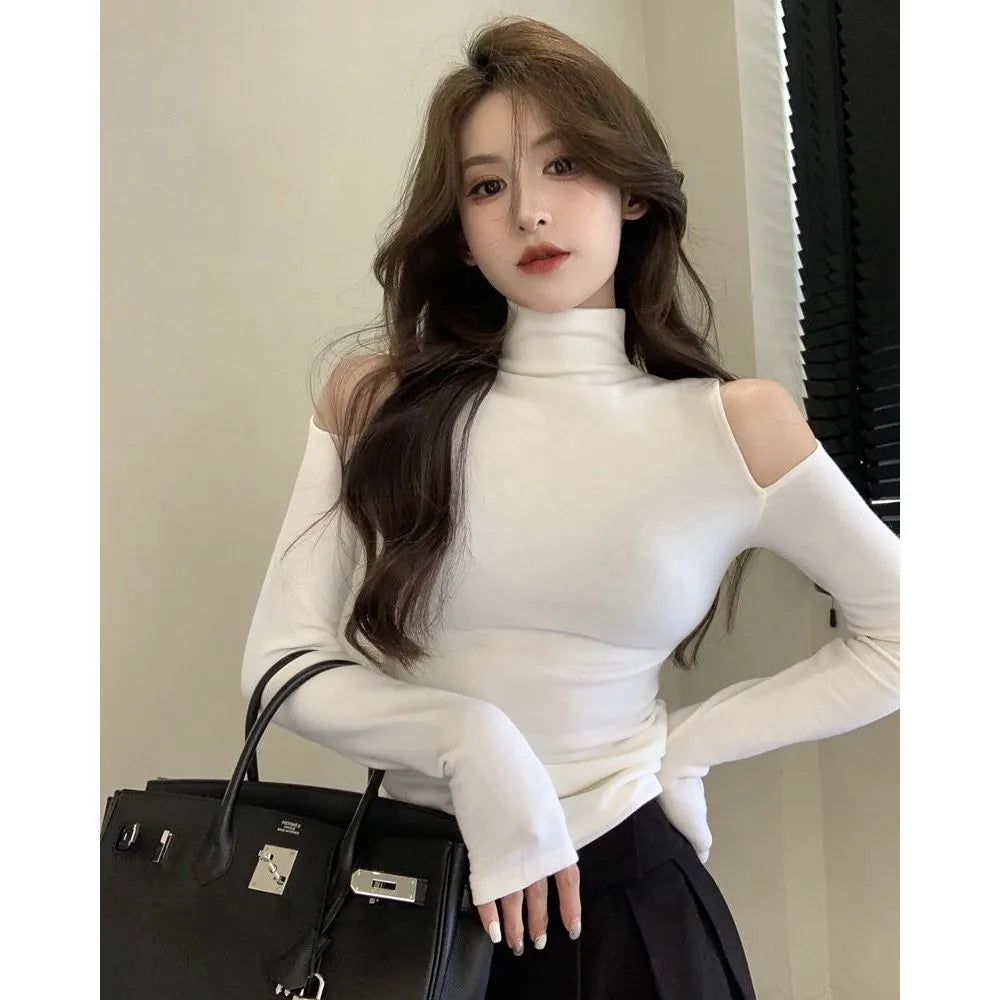 T-shirts à col roulé unis, épaules dénudées, blancs, sexy, coupe slim, style Kpop emo, hauts tendance pour femmes, magnifiques t-shirts XXL