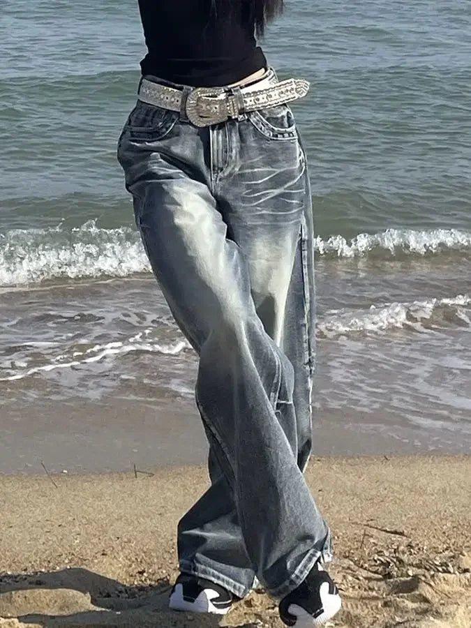 Getadme 미국 스타일 트렌디 남성 및 여성 하이 스트리트 스트레이트 레그 와이드 레그 청바지 여성 루즈 드레이프 플로어 드래깅 레트로 롱 팬츠