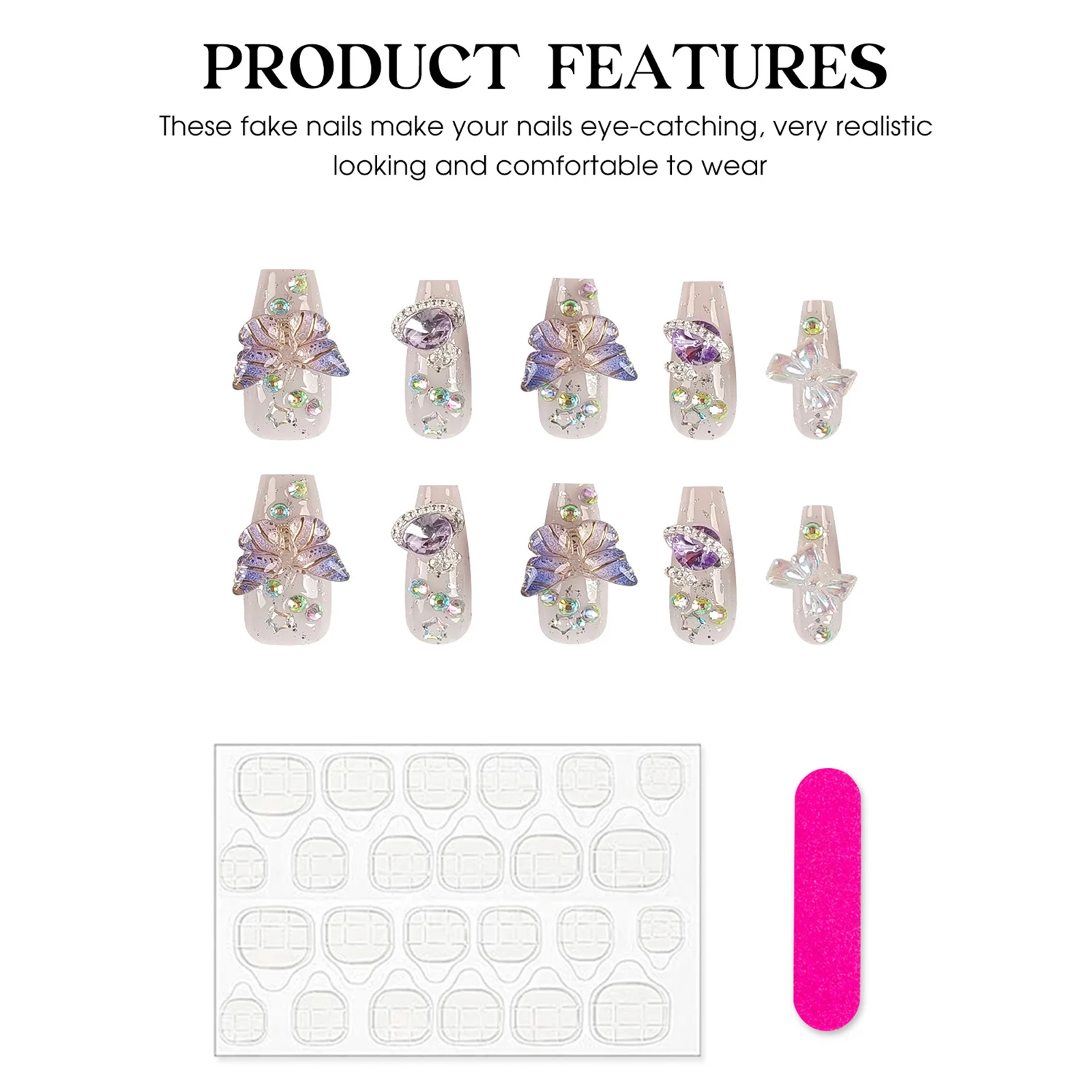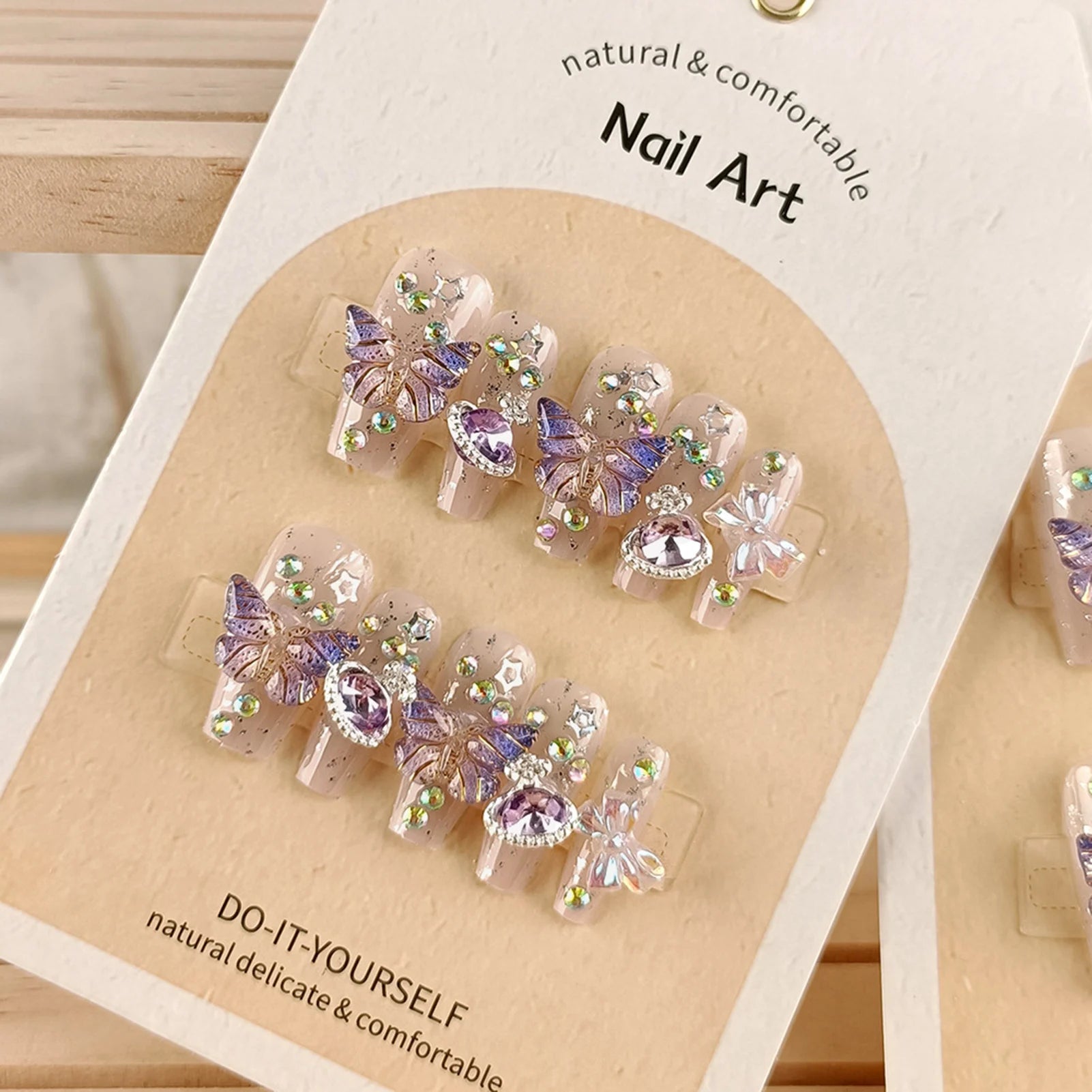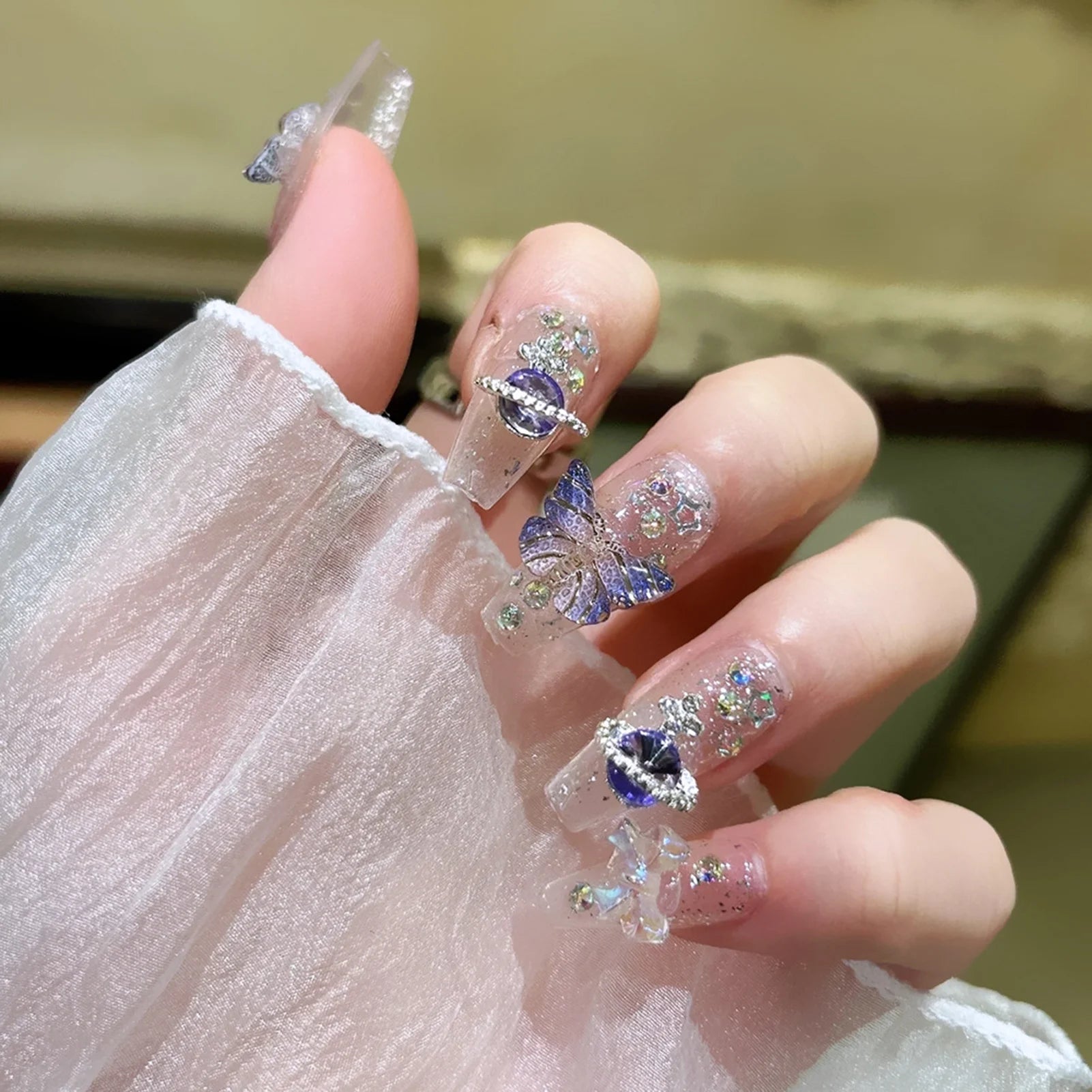 GETADME 10개 수제 가짜 손톱 라인스톤 투명 스팽글 롱 프레스 온 네일 팁 3D 나비 장식 가짜 손톱 고품질