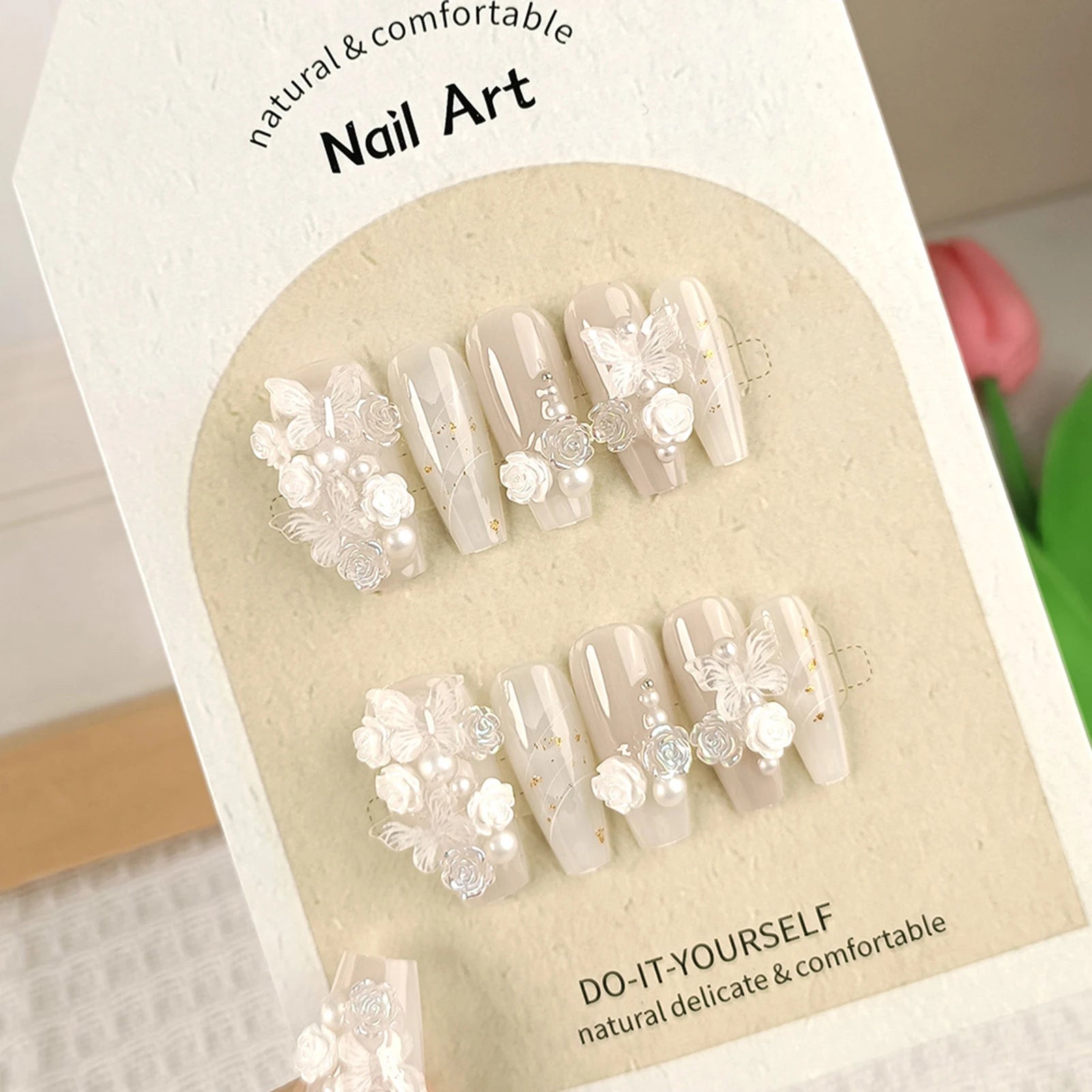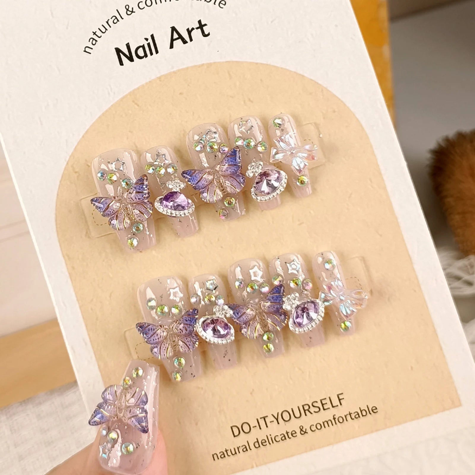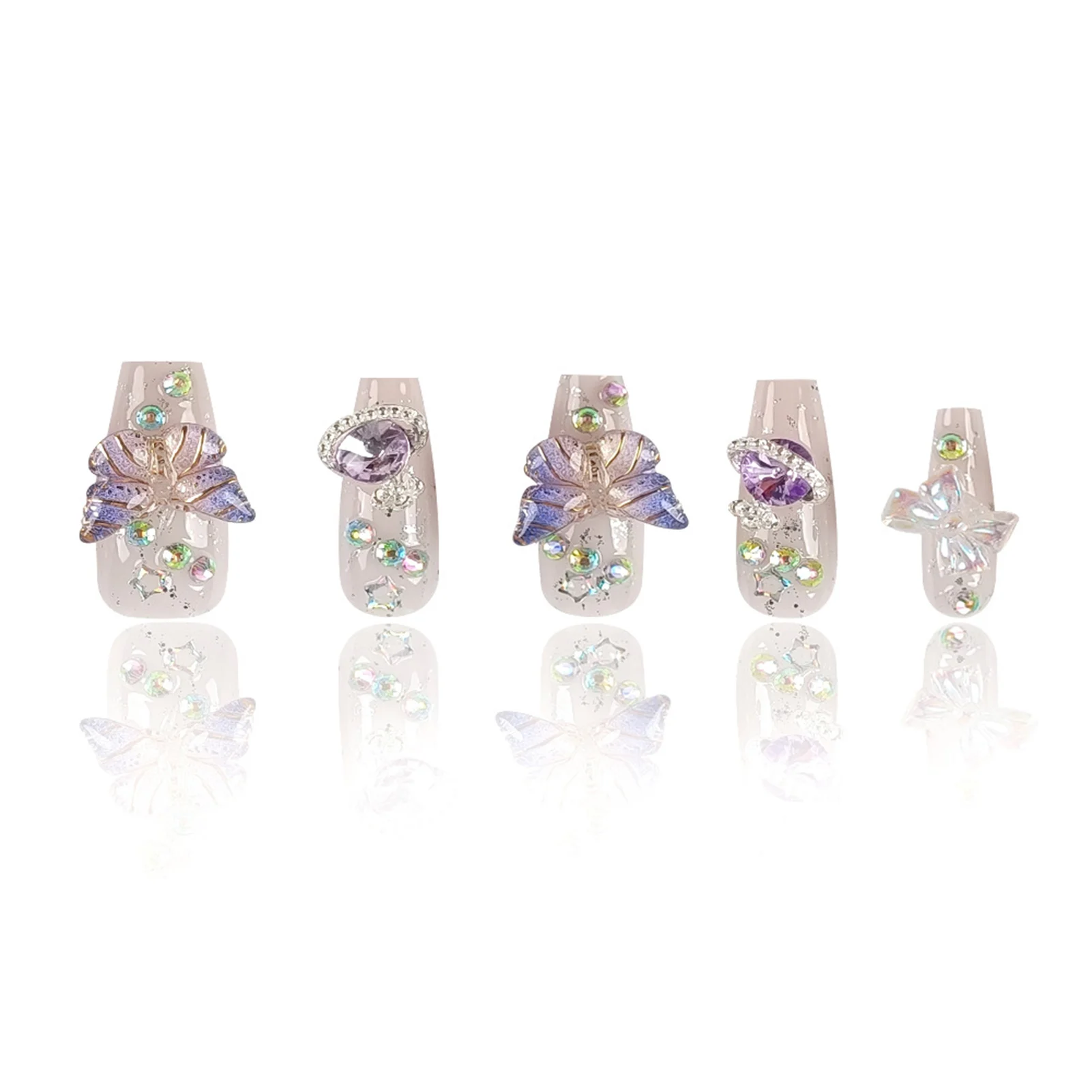GETADME 10개 수제 가짜 손톱 라인스톤 투명 스팽글 롱 프레스 온 네일 팁 3D 나비 장식 가짜 손톱 고품질