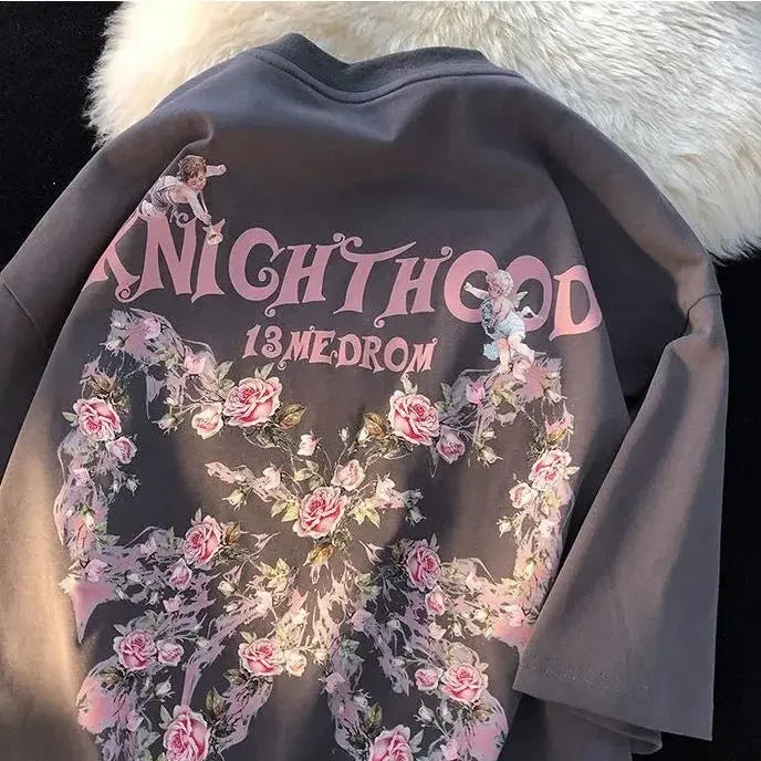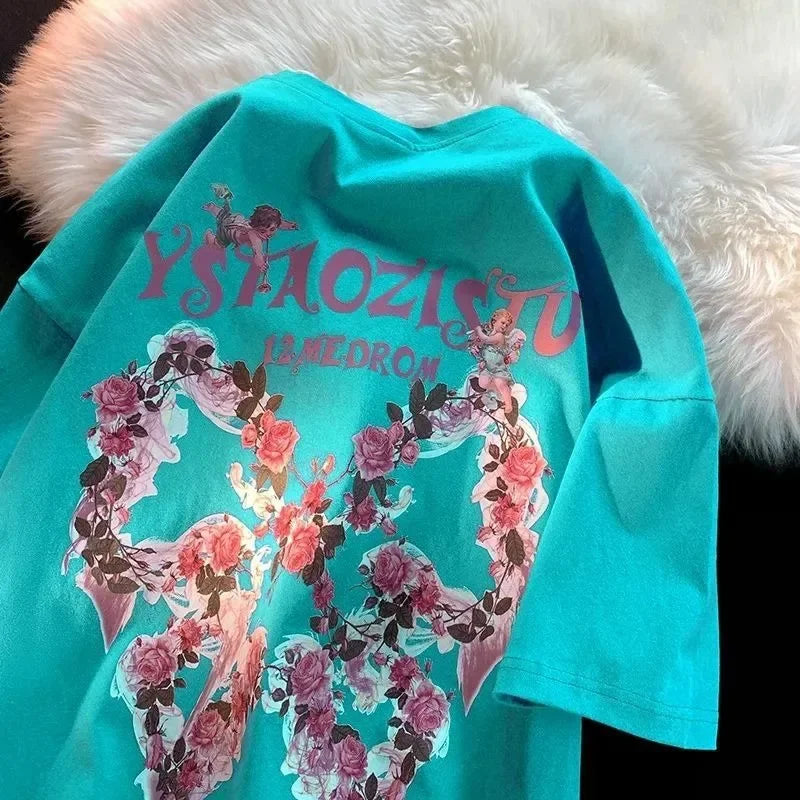Getadme 아메리칸 스타일 레트로 루즈 로즈 버터플라이 엔젤 프린팅 반팔 티셔츠 남녀 연인 여름 루즈 캐주얼 탑