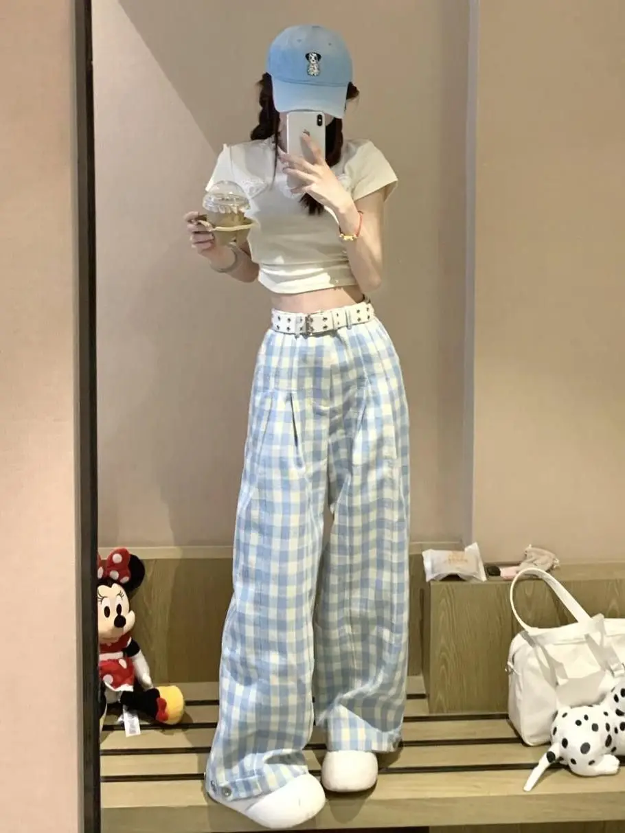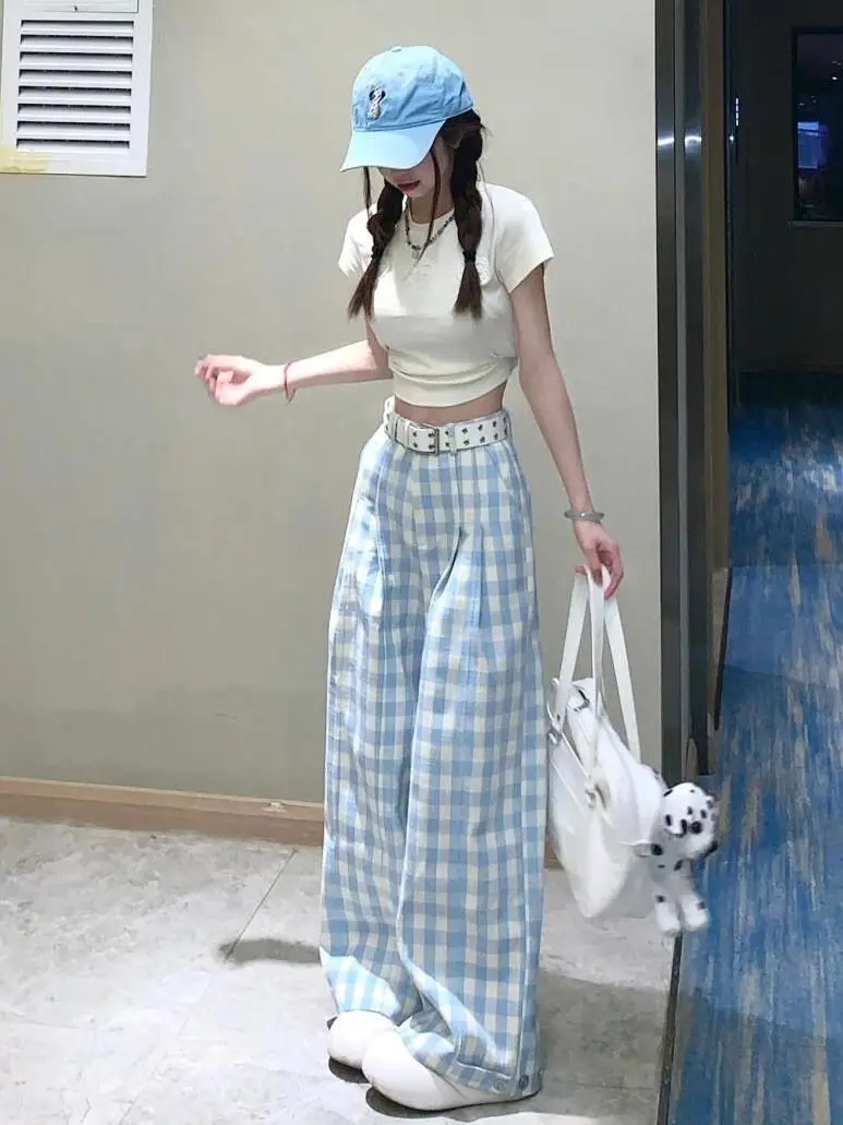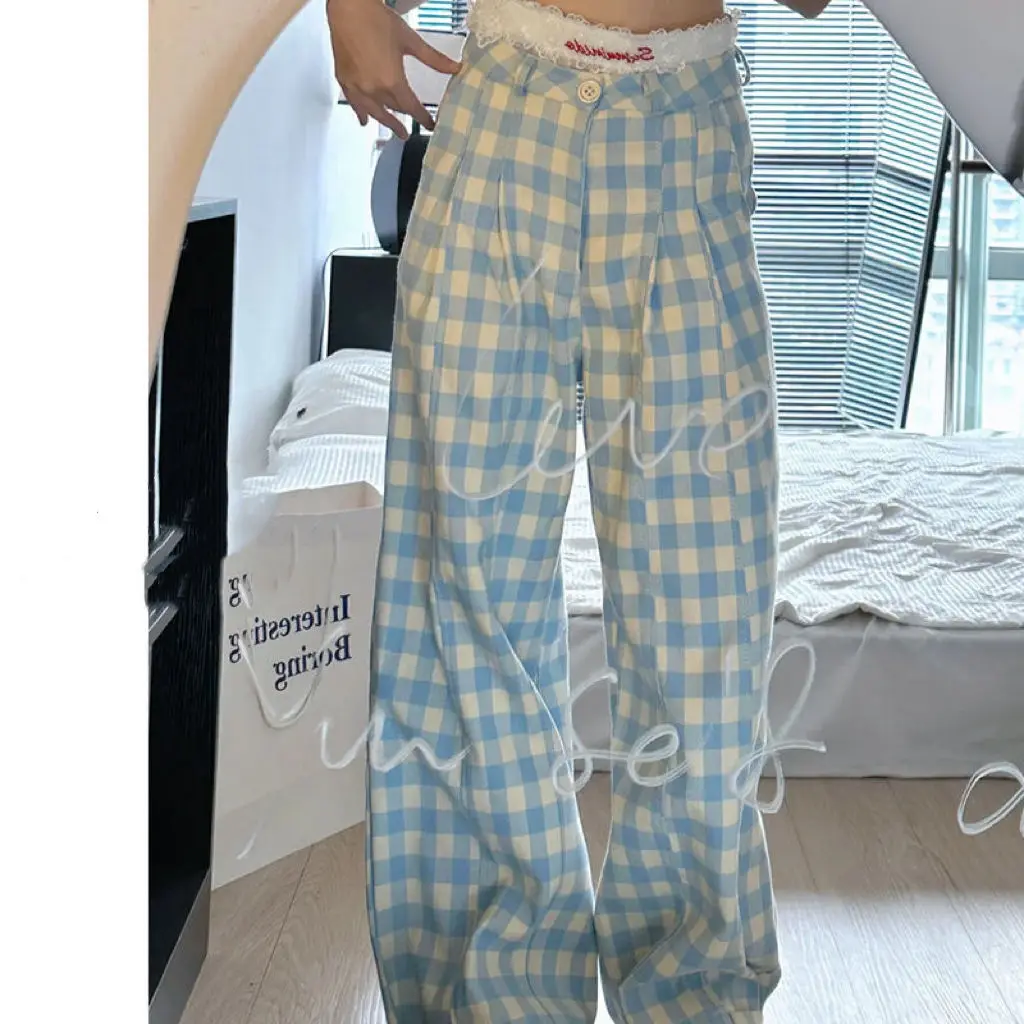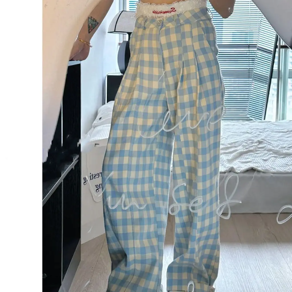 GETADME 블루 앤 화이트 플레드 와이드 레그 팬츠 여성용 초가을 디자인 감각 하이웨이스트 루즈 드레이프 작고 상큼한 캐주얼 슬림 팬츠.