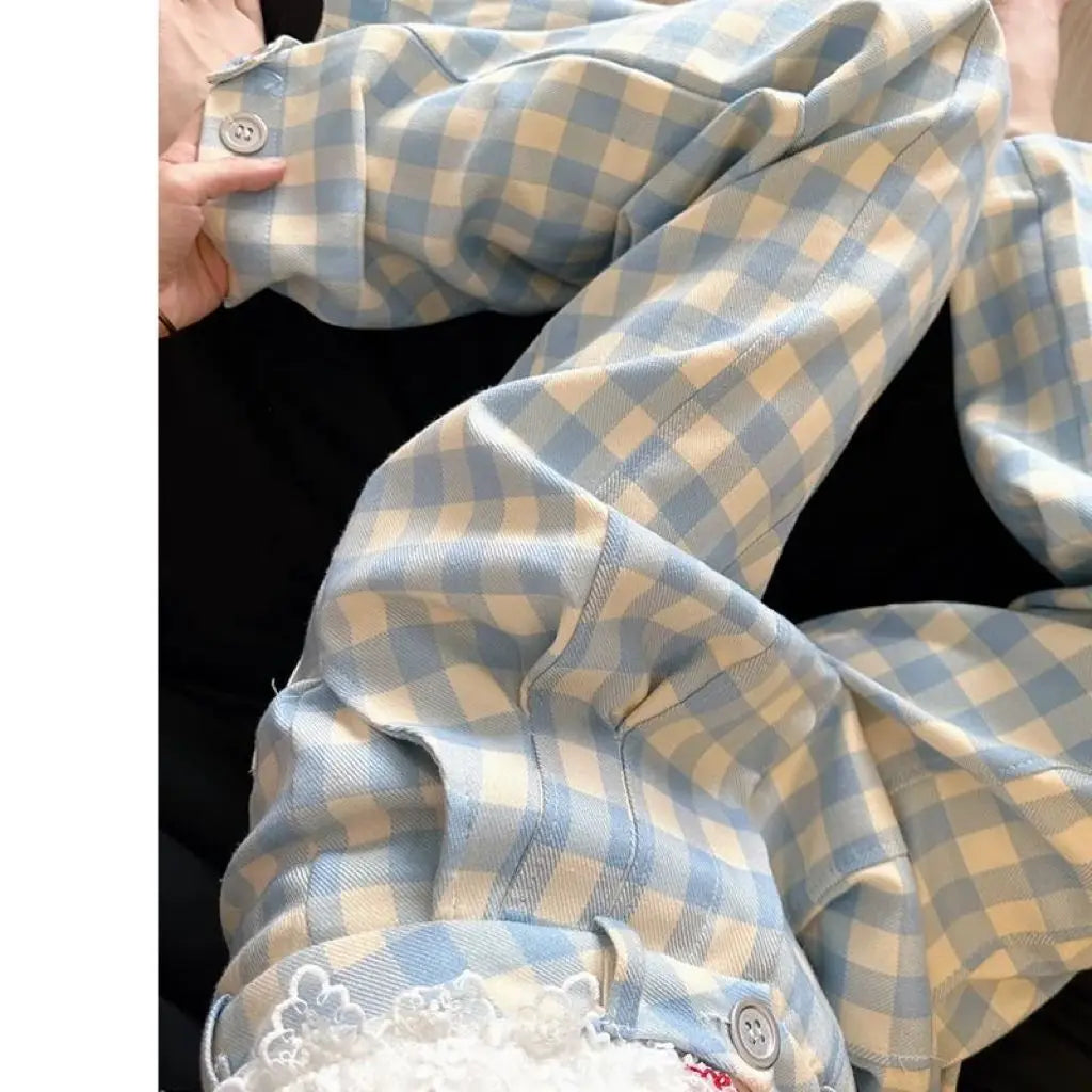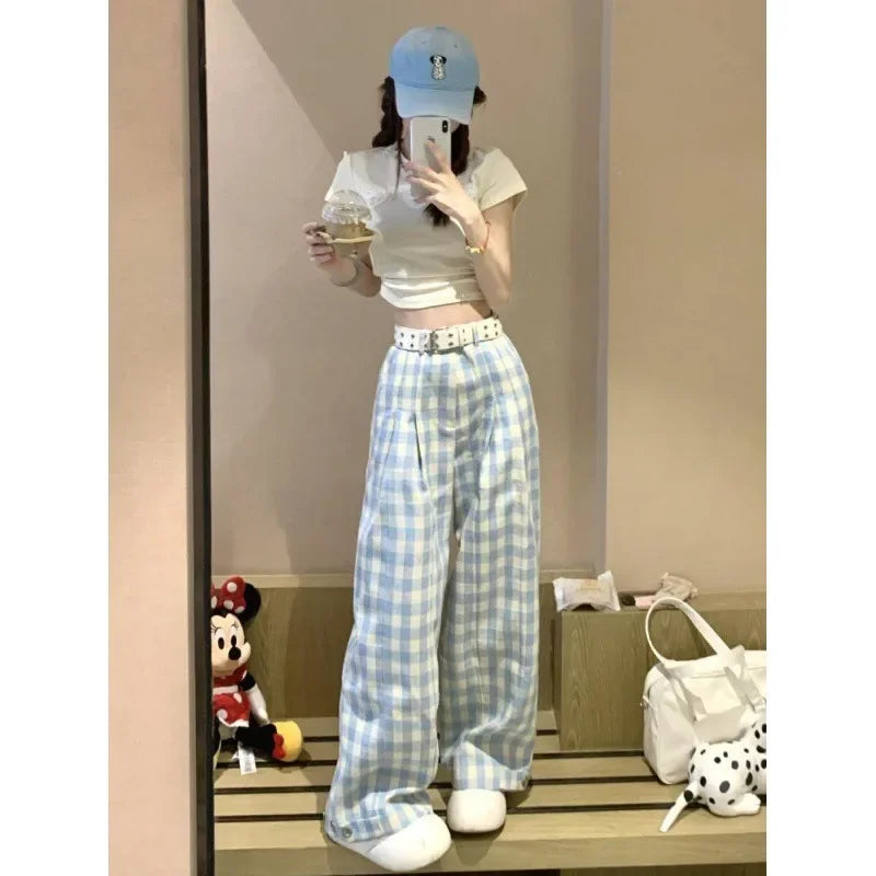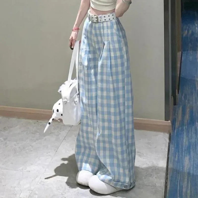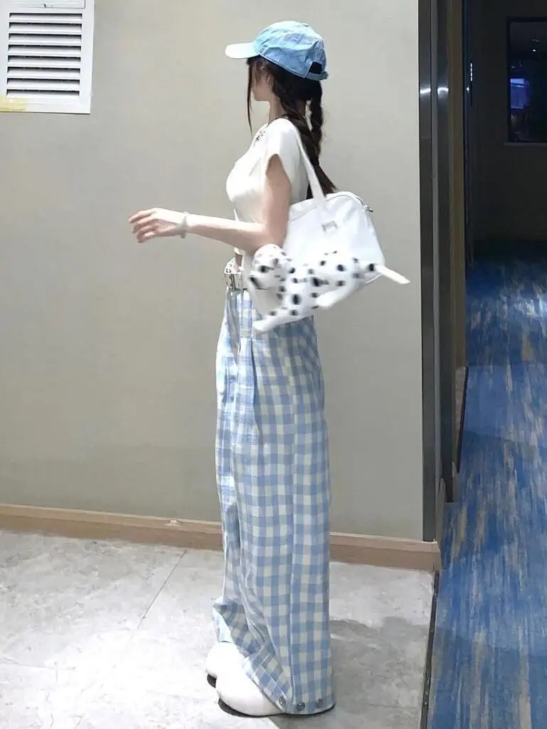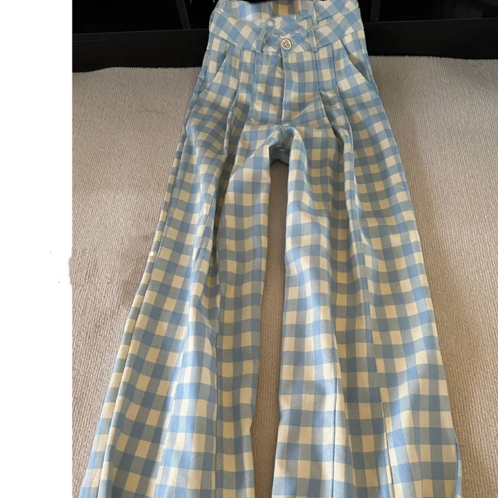 GETADME 블루 앤 화이트 플레드 와이드 레그 팬츠 여성용 초가을 디자인 감각 하이웨이스트 루즈 드레이프 작고 상큼한 캐주얼 슬림 팬츠.