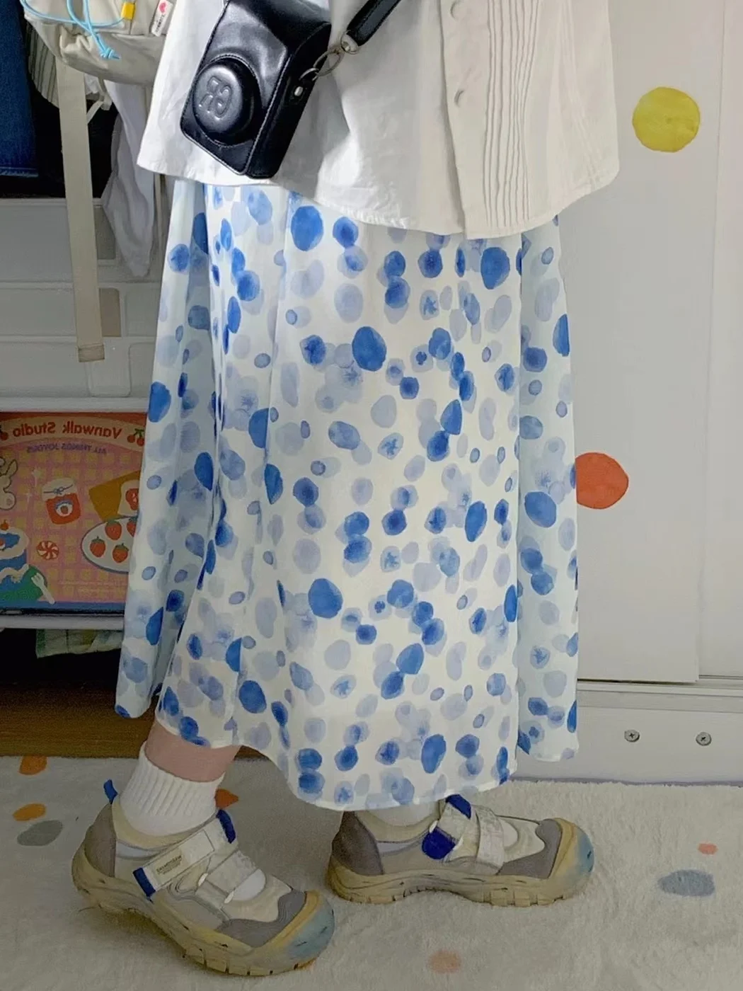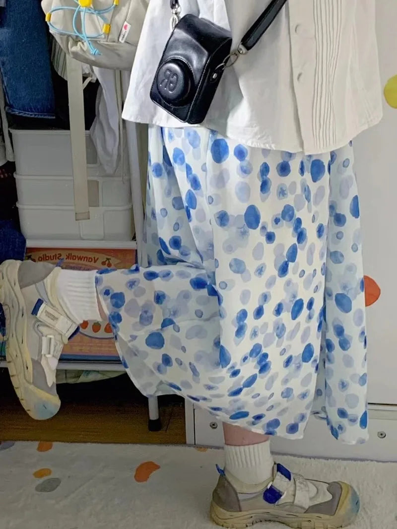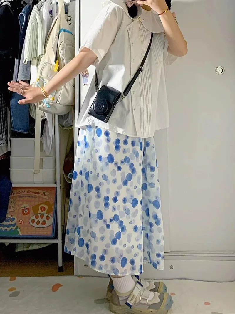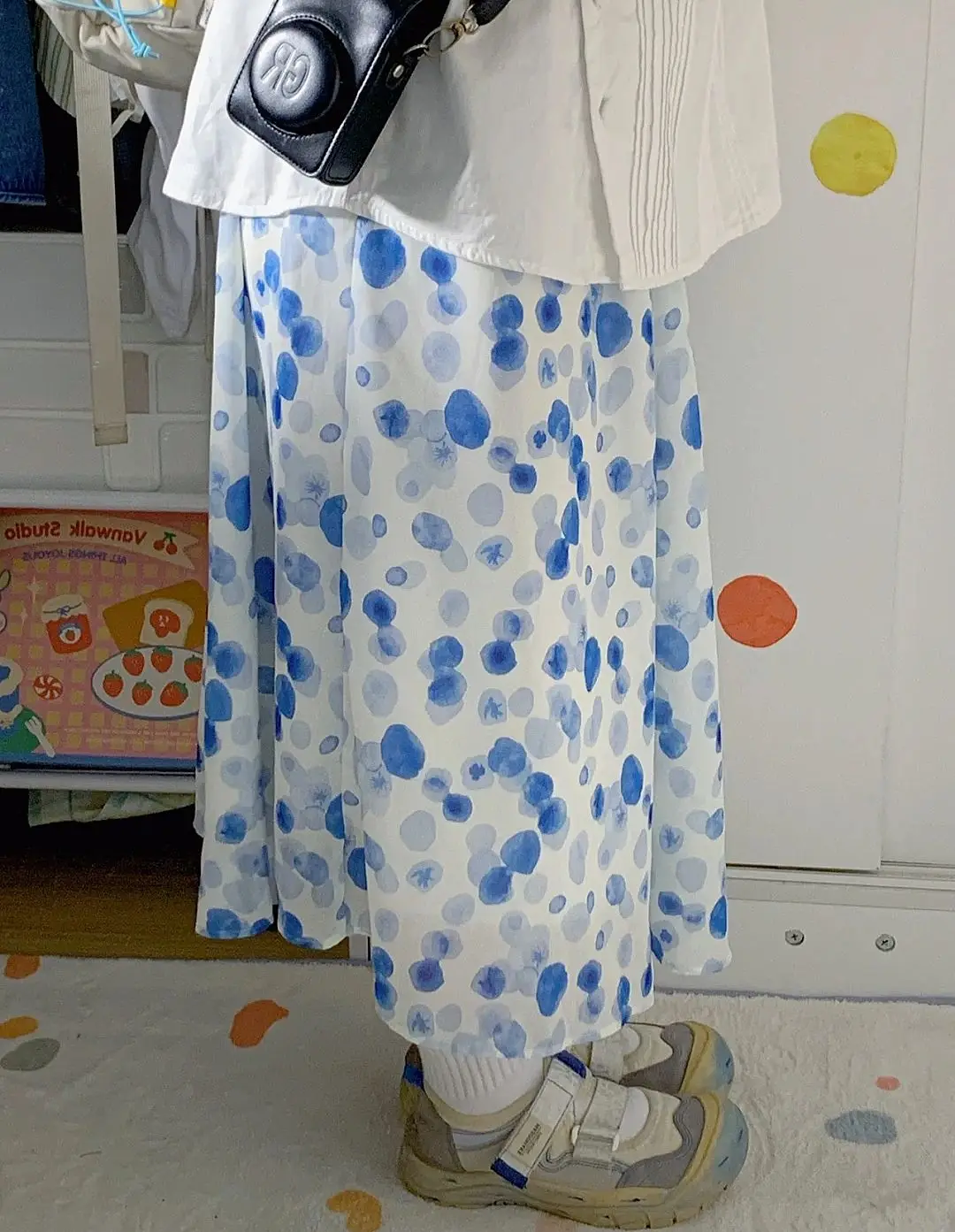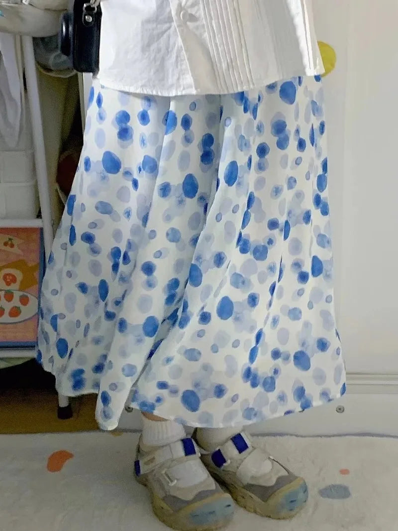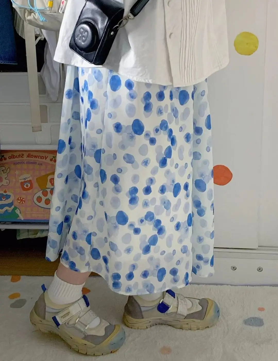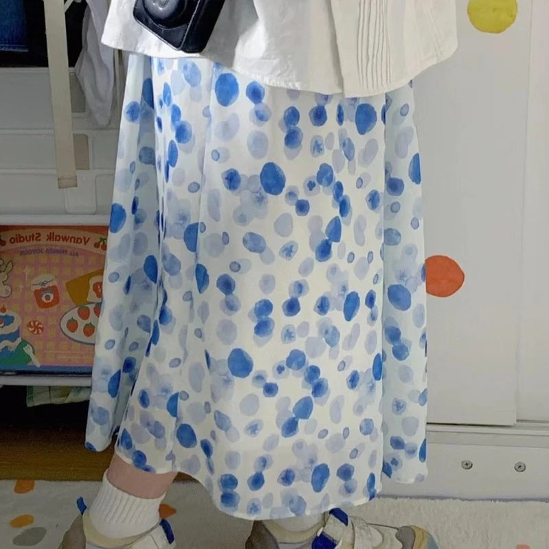 GETADME 블루 일본 하라주쿠 스위트 블렌드 폴카 도트 프린트 하프 스커트 루즈 미디 길이 A라인 여름 스커트 롱 스커트 여성용