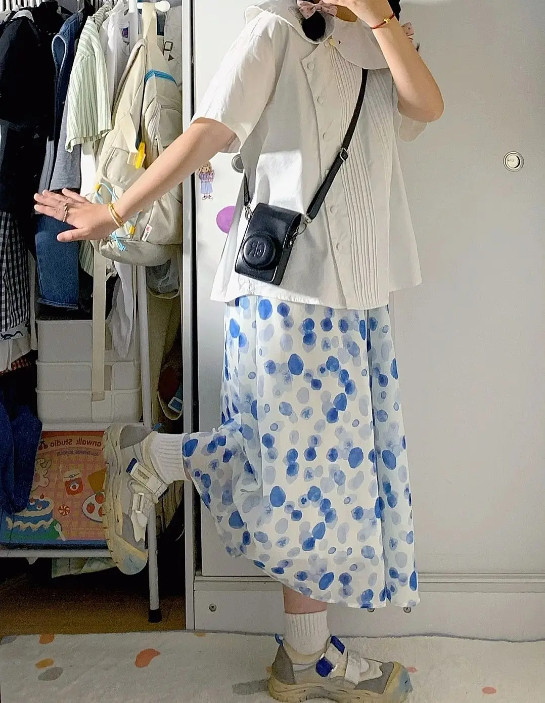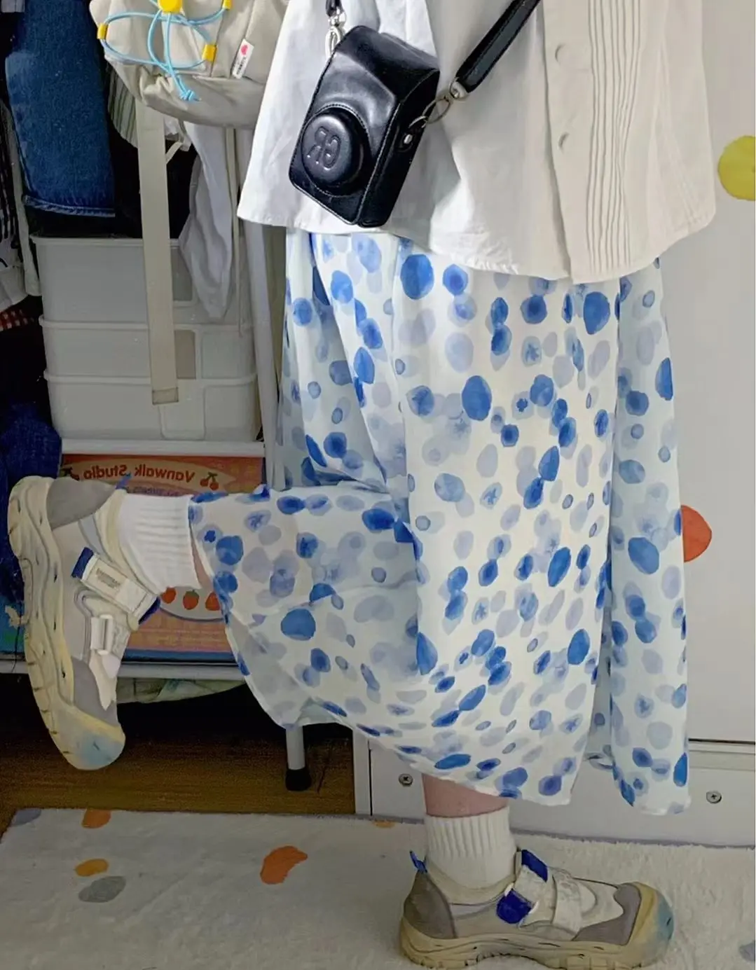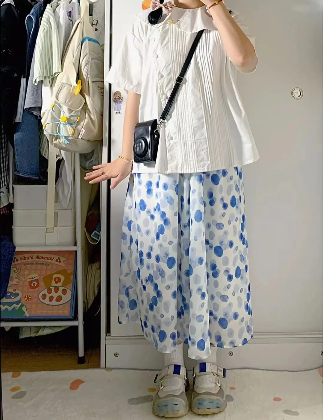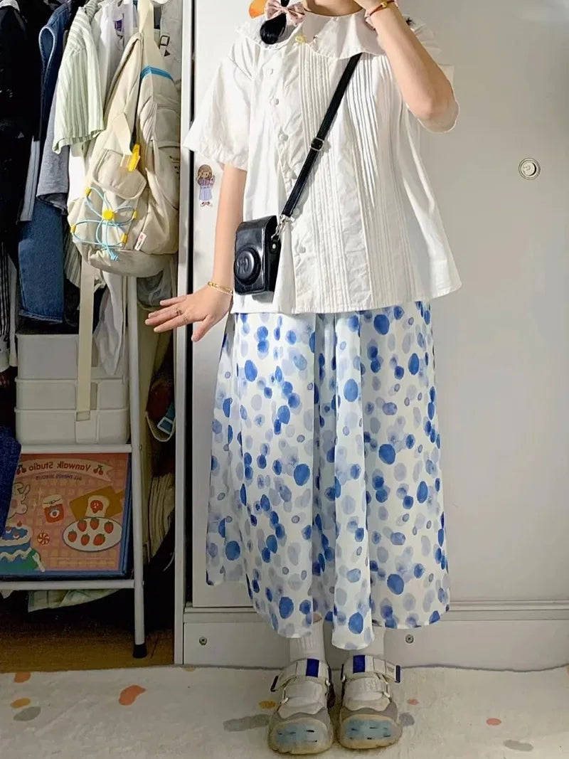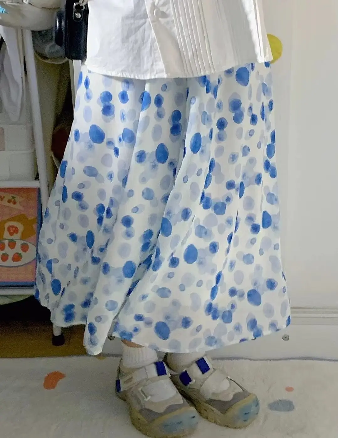 GETADME 블루 일본 하라주쿠 스위트 블렌드 폴카 도트 프린트 하프 스커트 루즈 미디 길이 A라인 여름 스커트 롱 스커트 여성용
