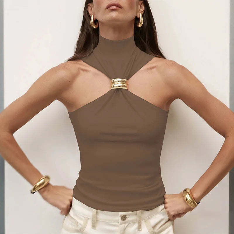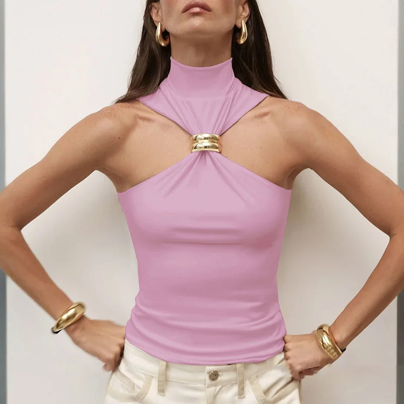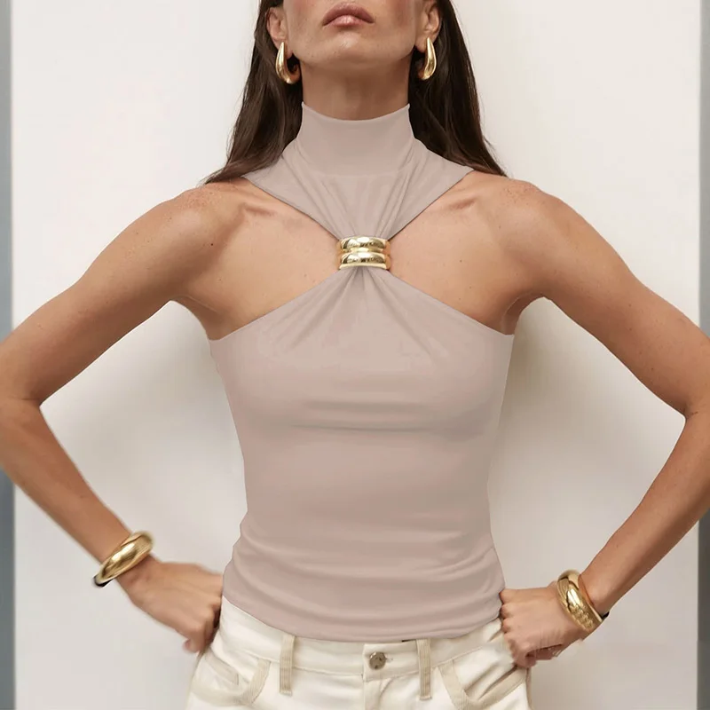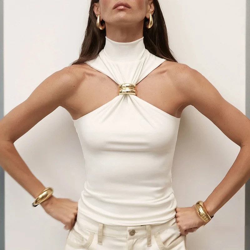 GETADME 캐주얼 골든 버클 하이 스트리트 쿨 탑 여름 심플 솔리드 홀로우 슬리브리스 블라우스 레이디 섹시 터틀넥 슬림 통근 셔츠