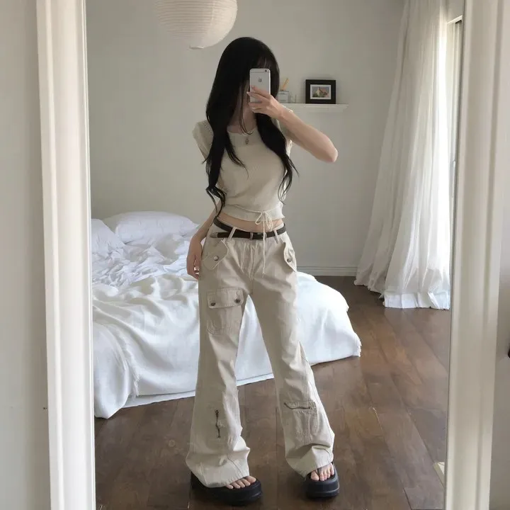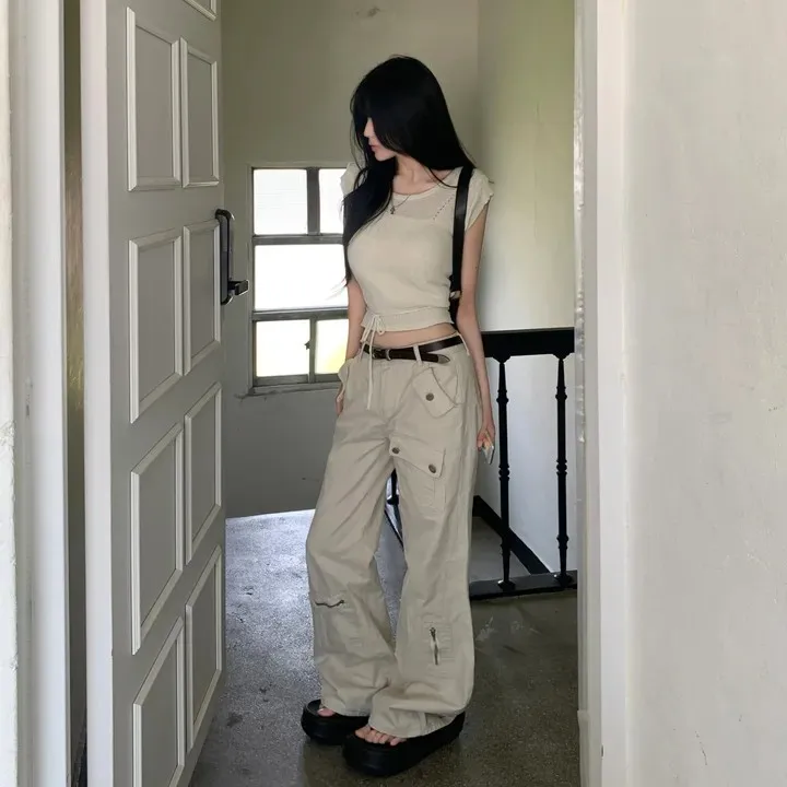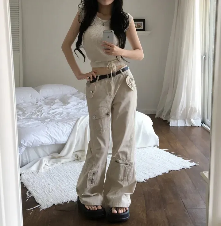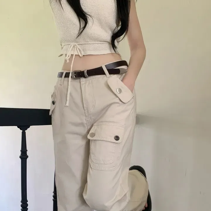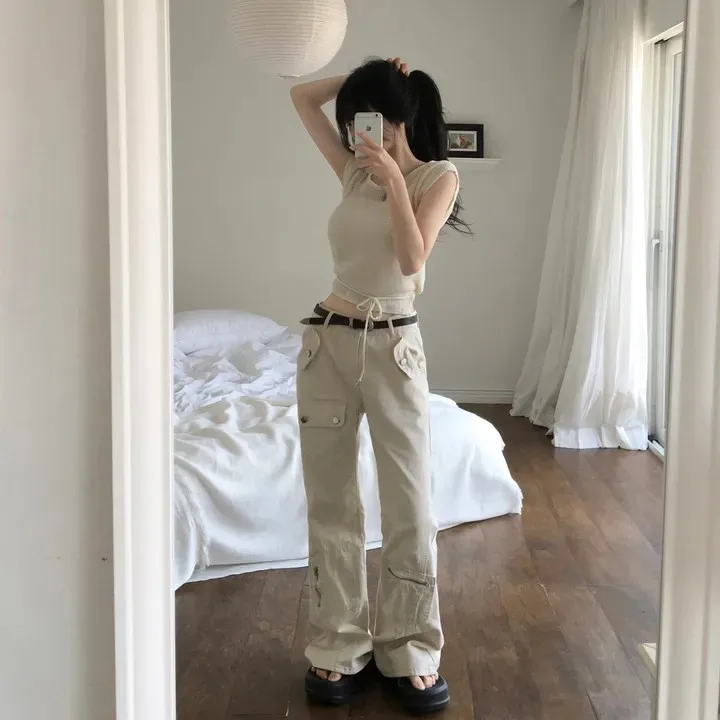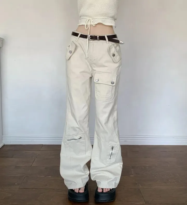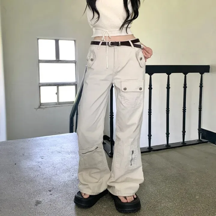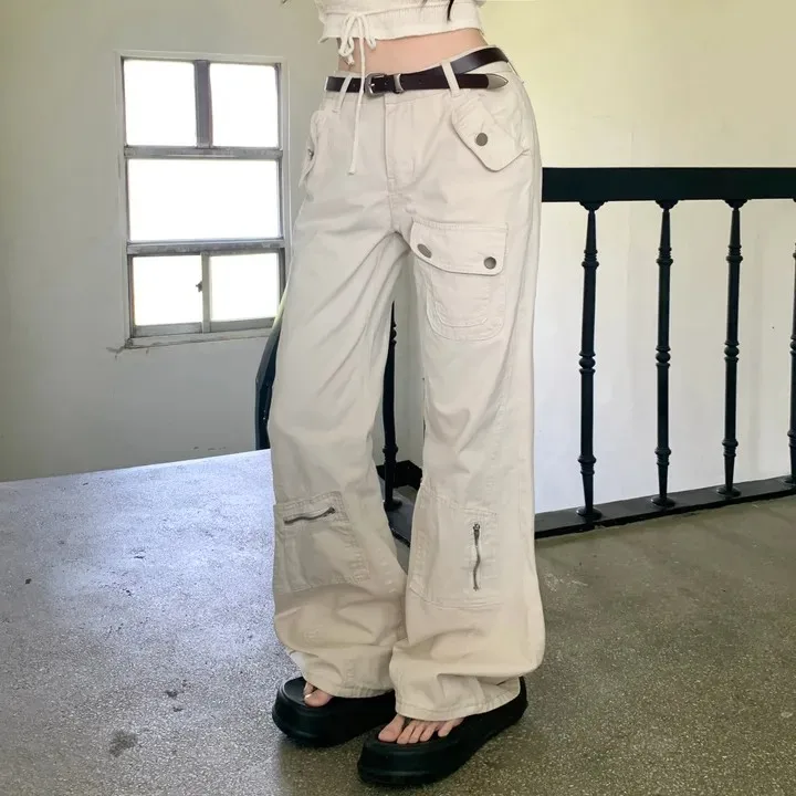 GETADME 시크 하이웨이스트 와이드 레그 카고 팬츠 여성용 스트레이트 컷 롱 진 멀티플 킷 아메리칸 스트리트 슬레 레트로 디자인