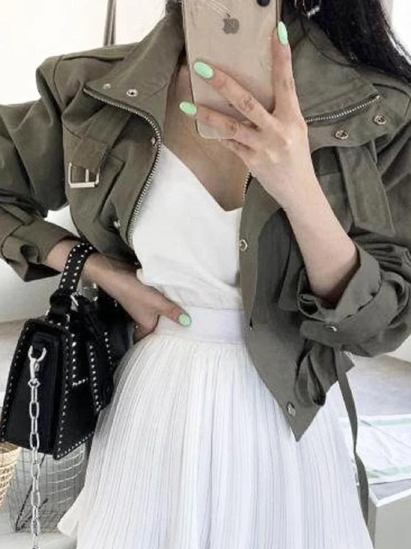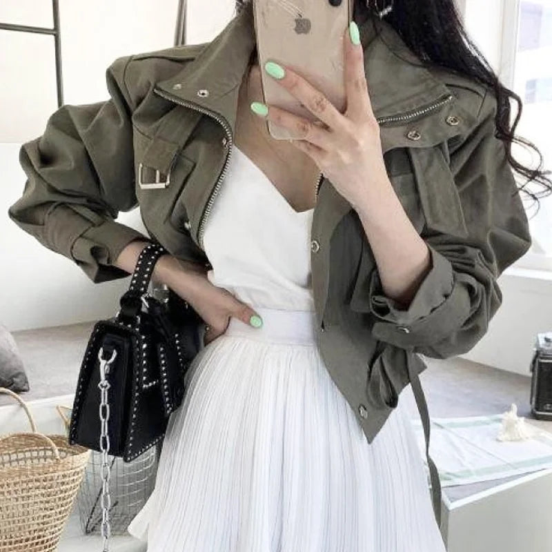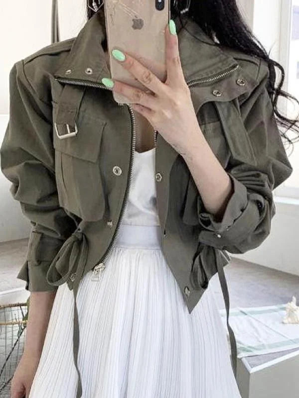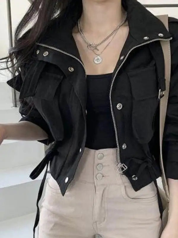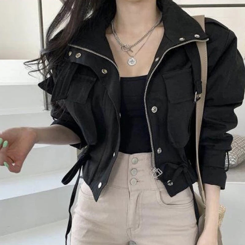 GETADME 시크 스트리트 슬로 오트 워크웨어 재트 여성용 지퍼 루즈핏 더블 켓 D스트링 허리 개인화 칼라 코트