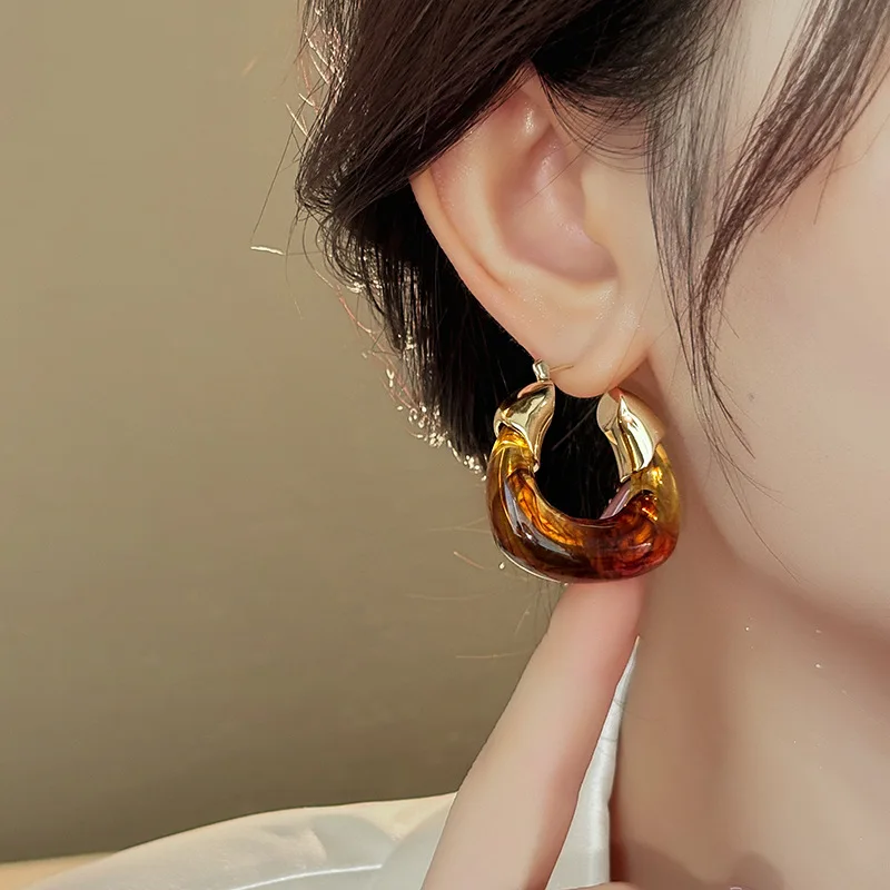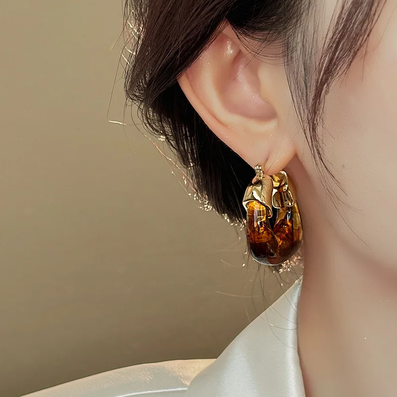 Getadme 유럽 및 미국 복고풍 갈색 수지 문자 U 자형 기하학적 후프 귀걸이 여성 패션 심플한 금속 보석 선물