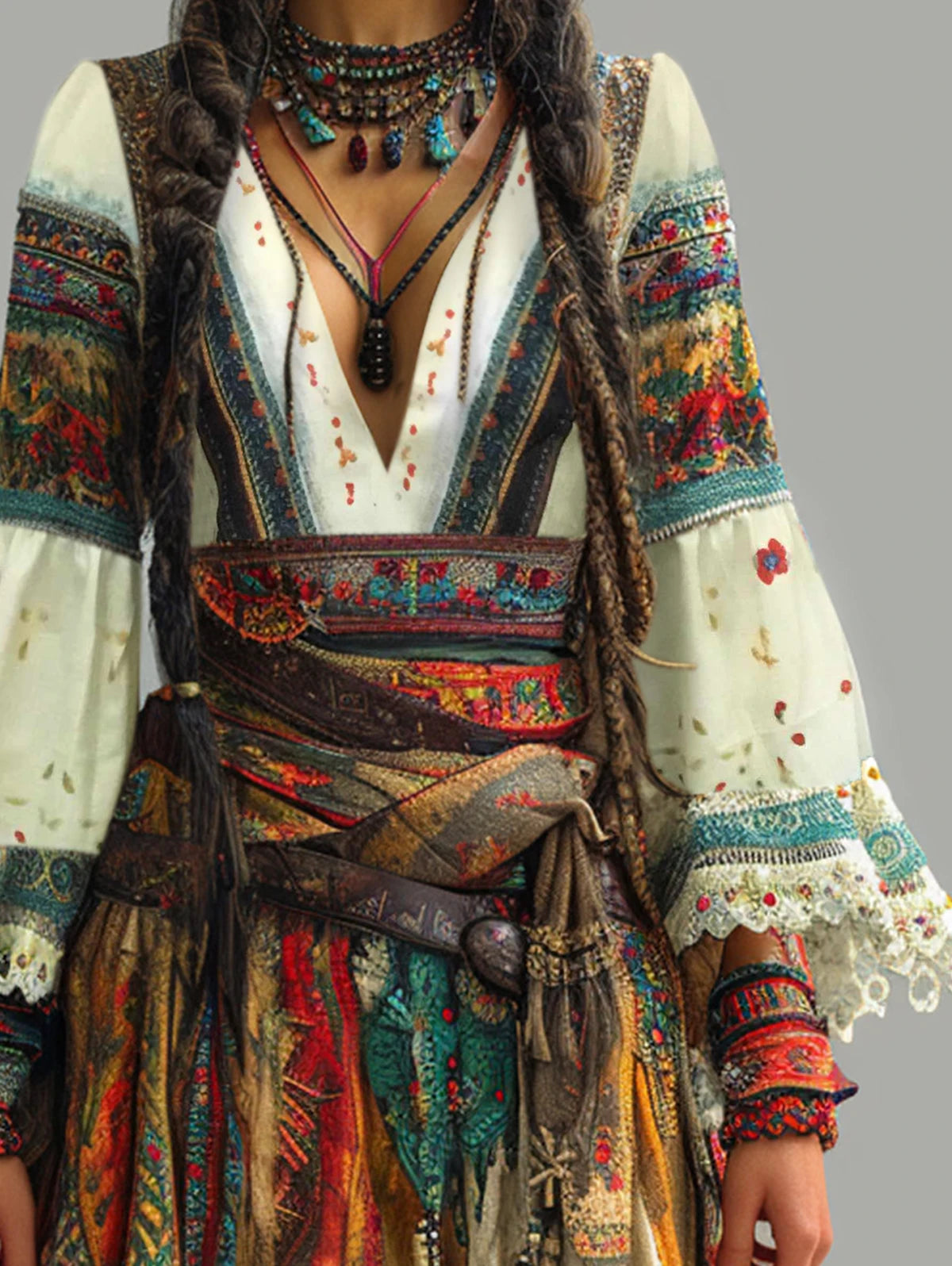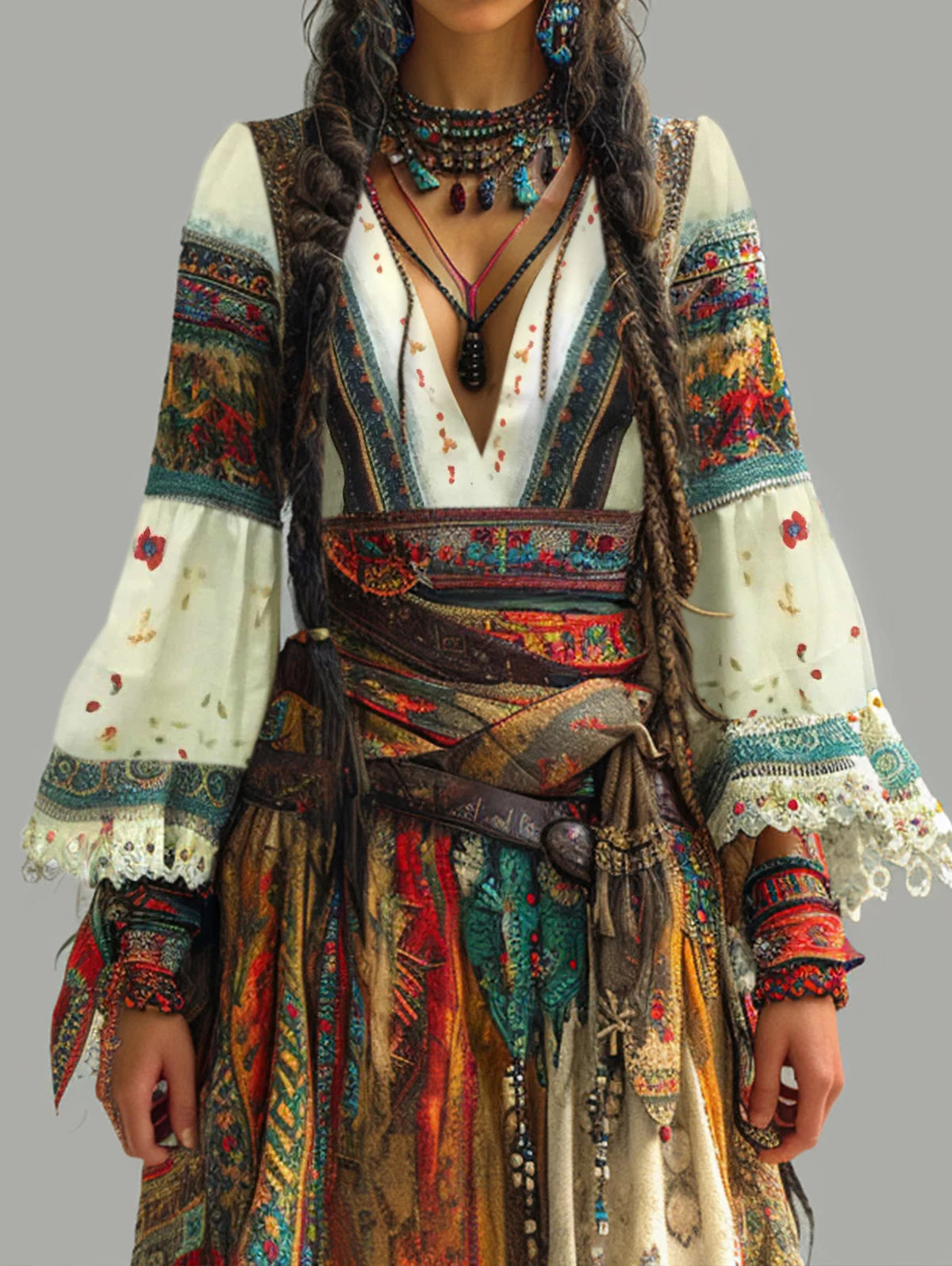 GETADME 플레어 슬리브 보헤미안 블라우스 플로럴 패턴 딥 V넥 레이스 패치워크 에스닉 스타일 여성 상의 봄 여름 가을 시크 블라우스