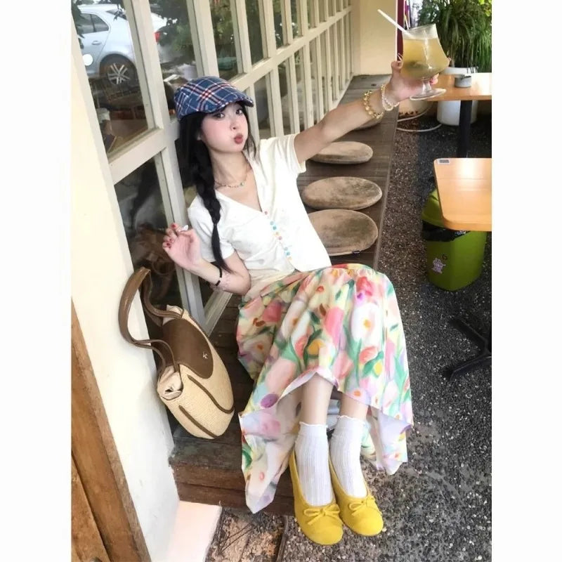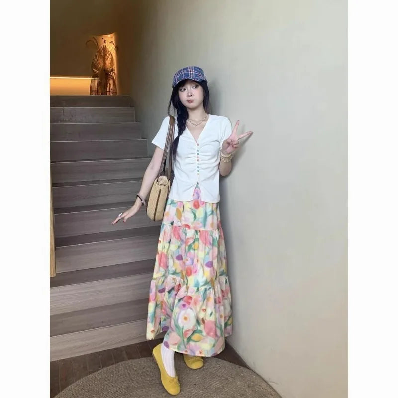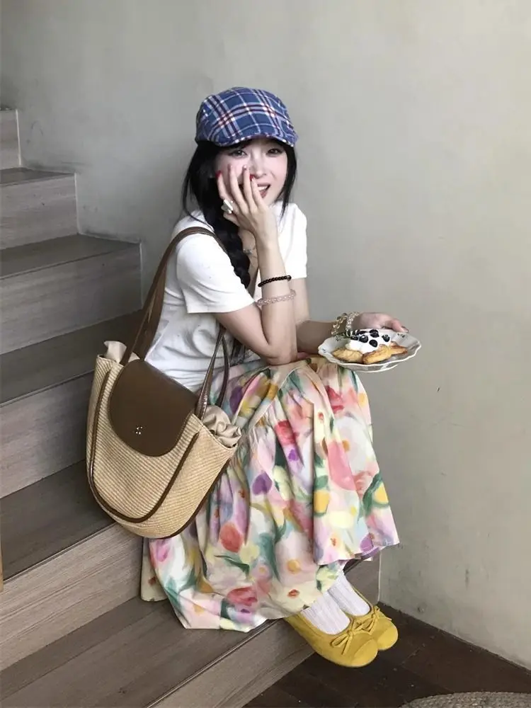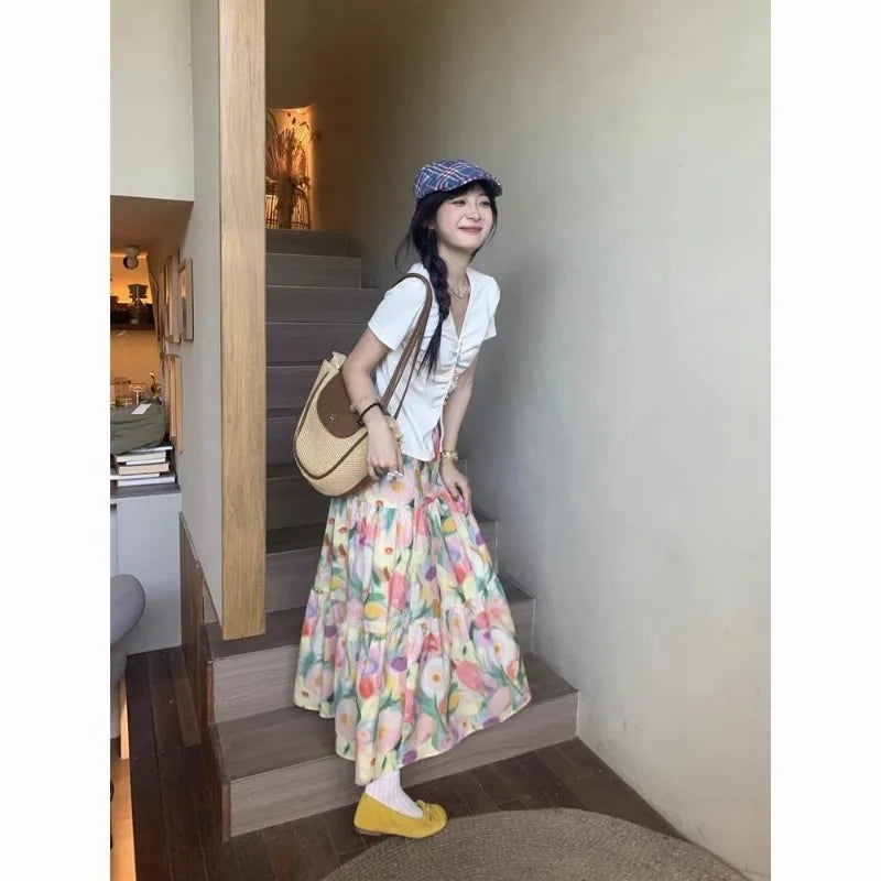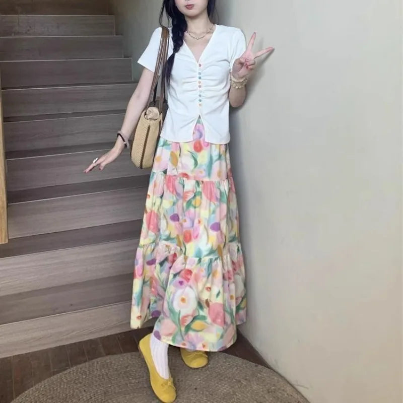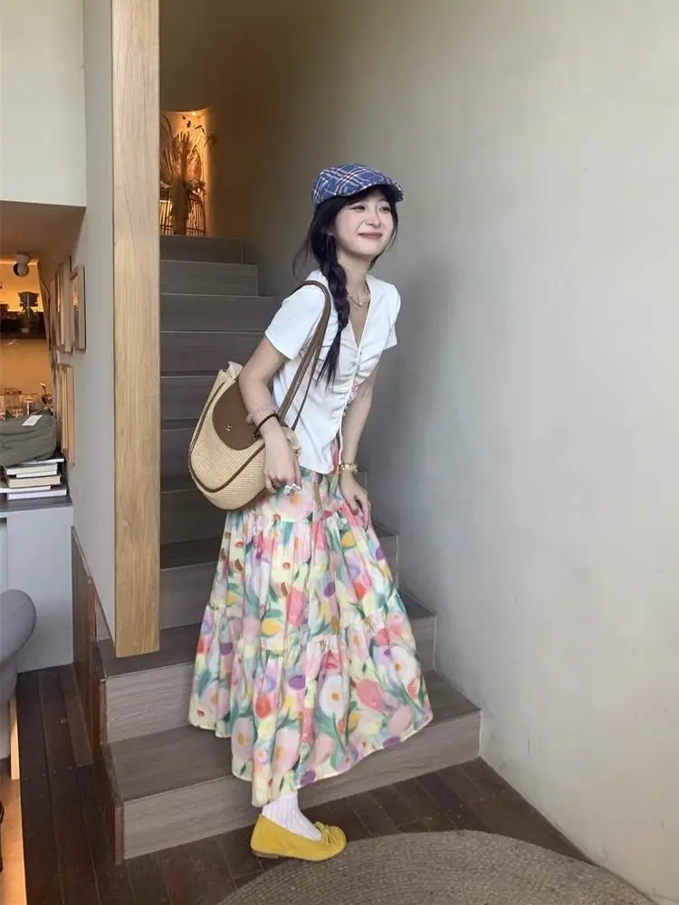 GETADME 플로럴 케이크 하와이안 스커트 유화 스타일 봄 여름 A라인 스커트 튤 스커트 한국 스트리트웨어 Y2K 롱 스커트 여성