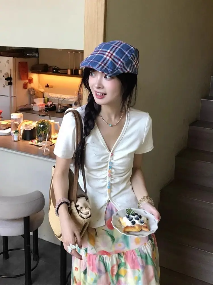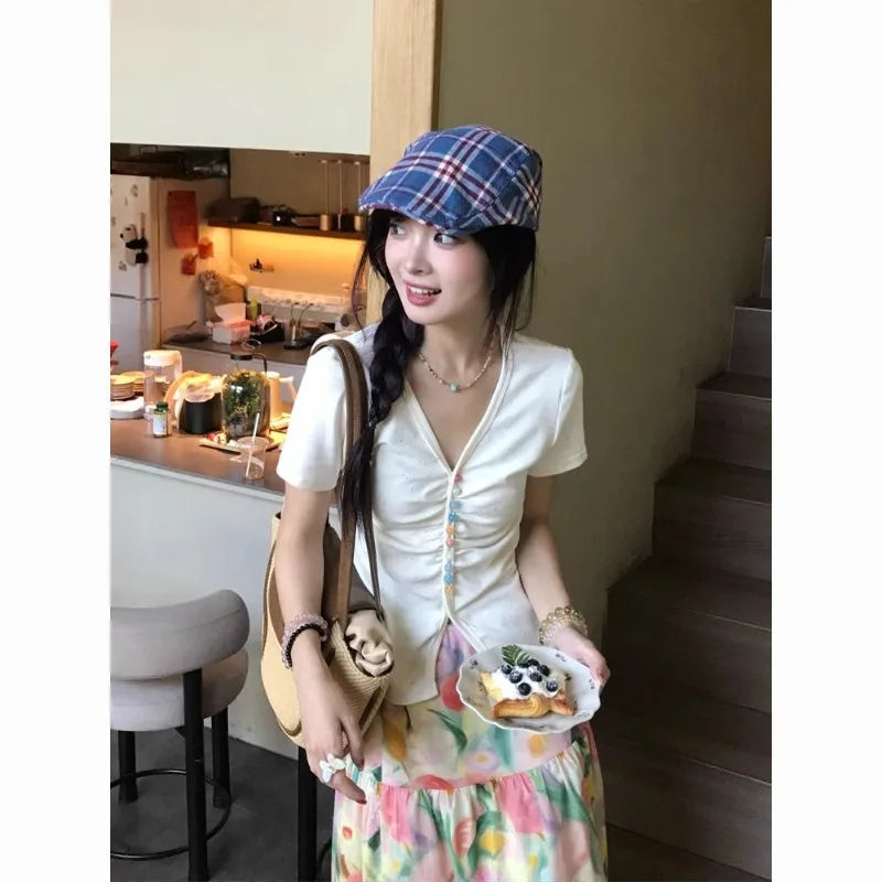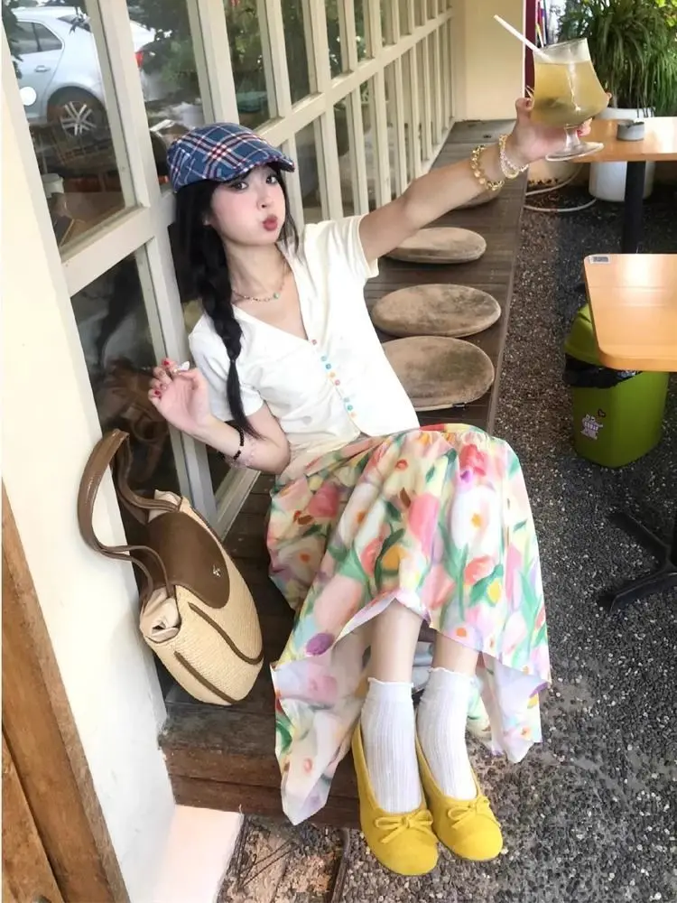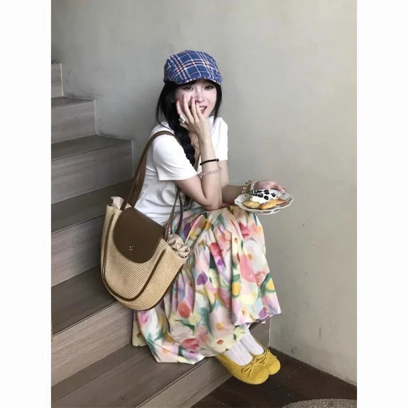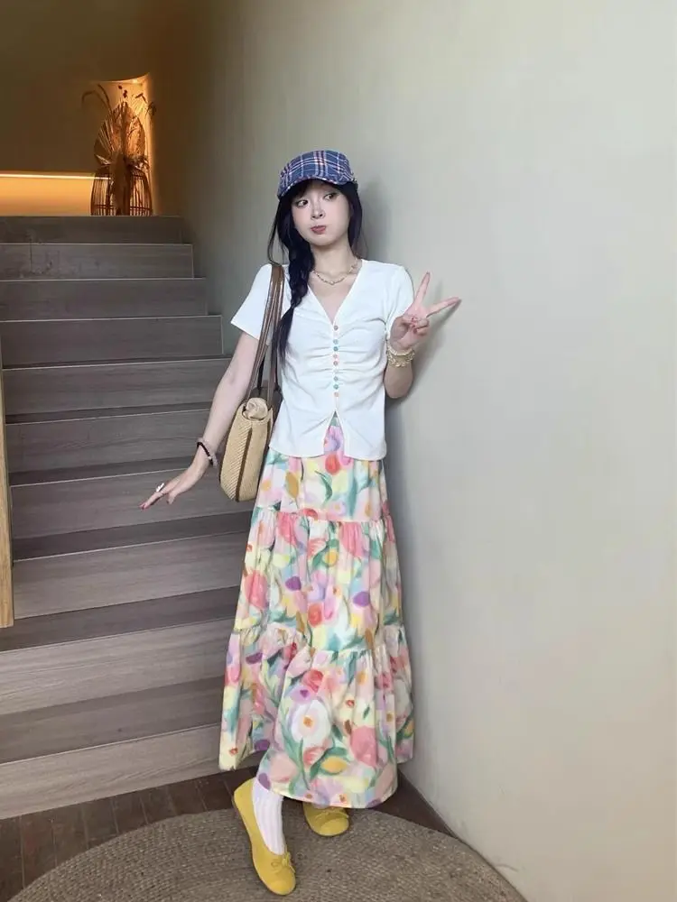 GETADME 플로럴 케이크 하와이안 스커트 유화 스타일 봄 여름 A라인 스커트 튤 스커트 한국 스트리트웨어 Y2K 롱 스커트 여성