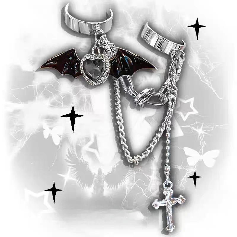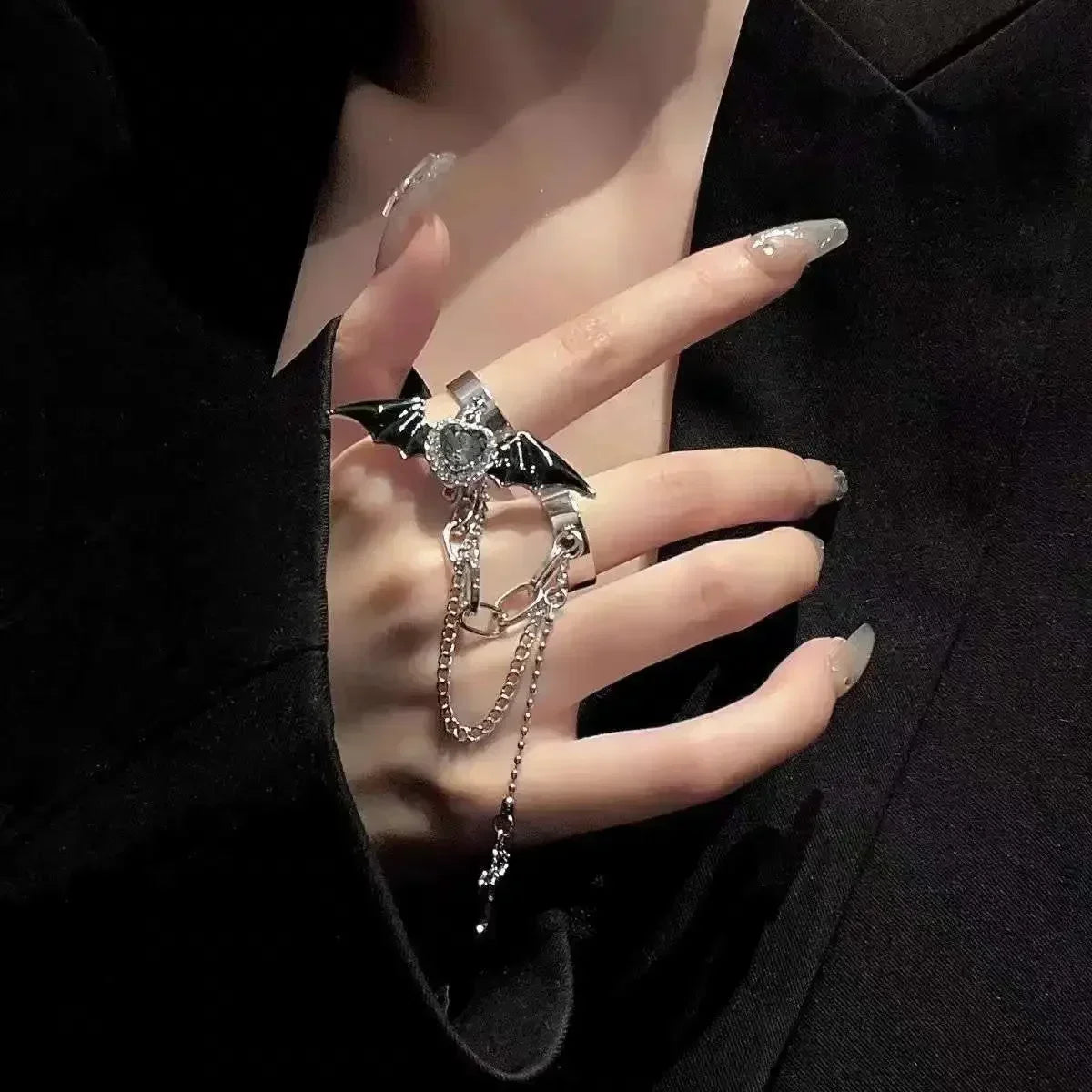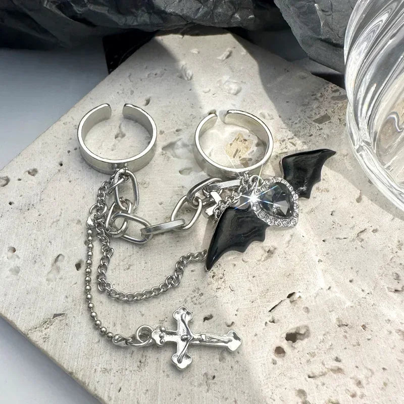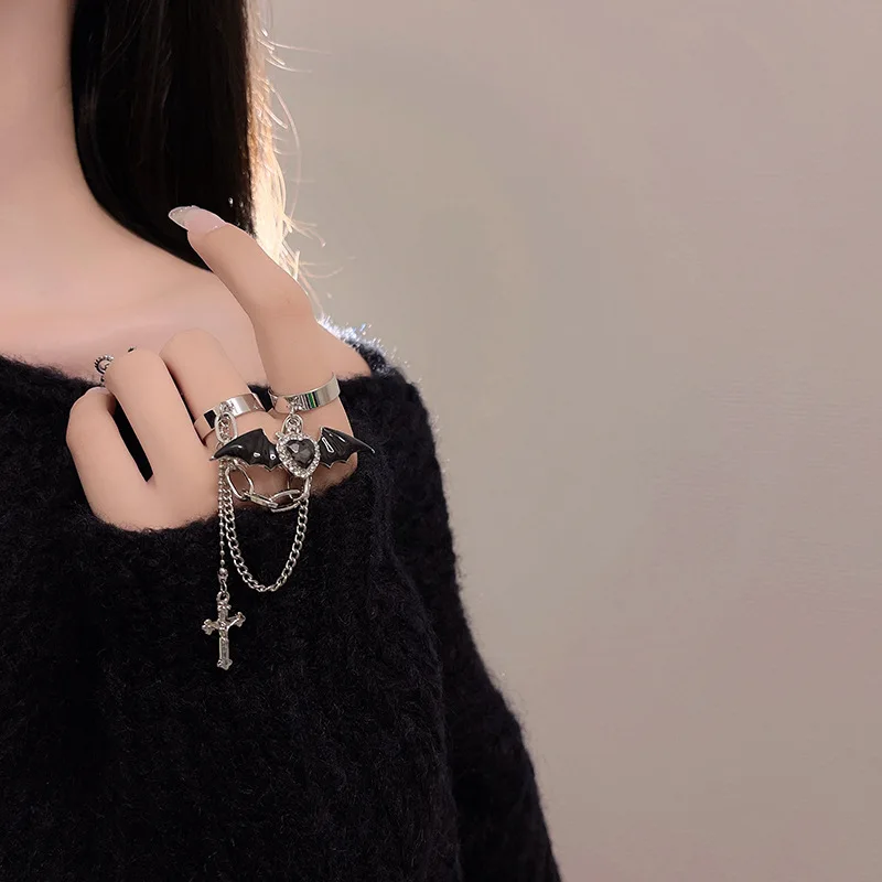GETADME 여성용 고딕 악마 날개 반지 Y2K 러브 크리스탈 리본 크로스 더블 핑거 펑크 스테인리스 스틸 패션 주얼리