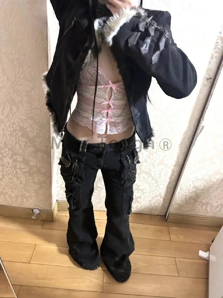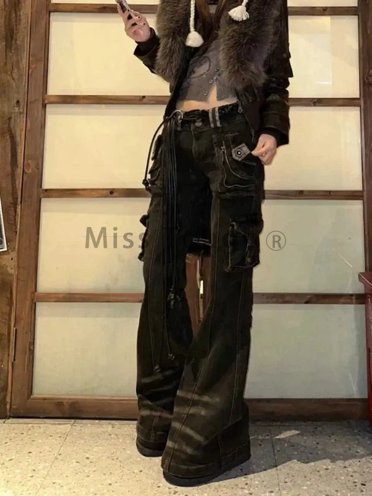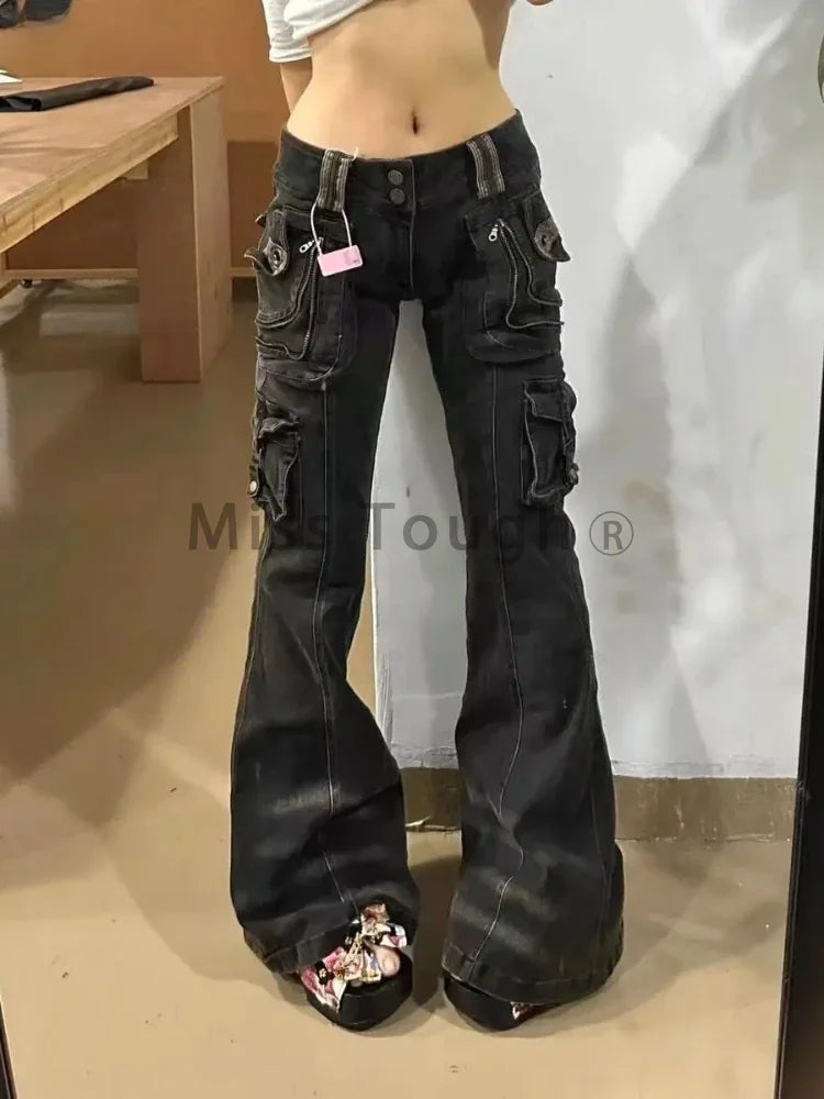 GETADME 그런지 일본 패션 시크 청바지 여성 하라주쿠 갸루 Y2K 데님 슬림 카고 팬츠 사이버 펑크 힙합 2000년대 미학 톰보이 신상품