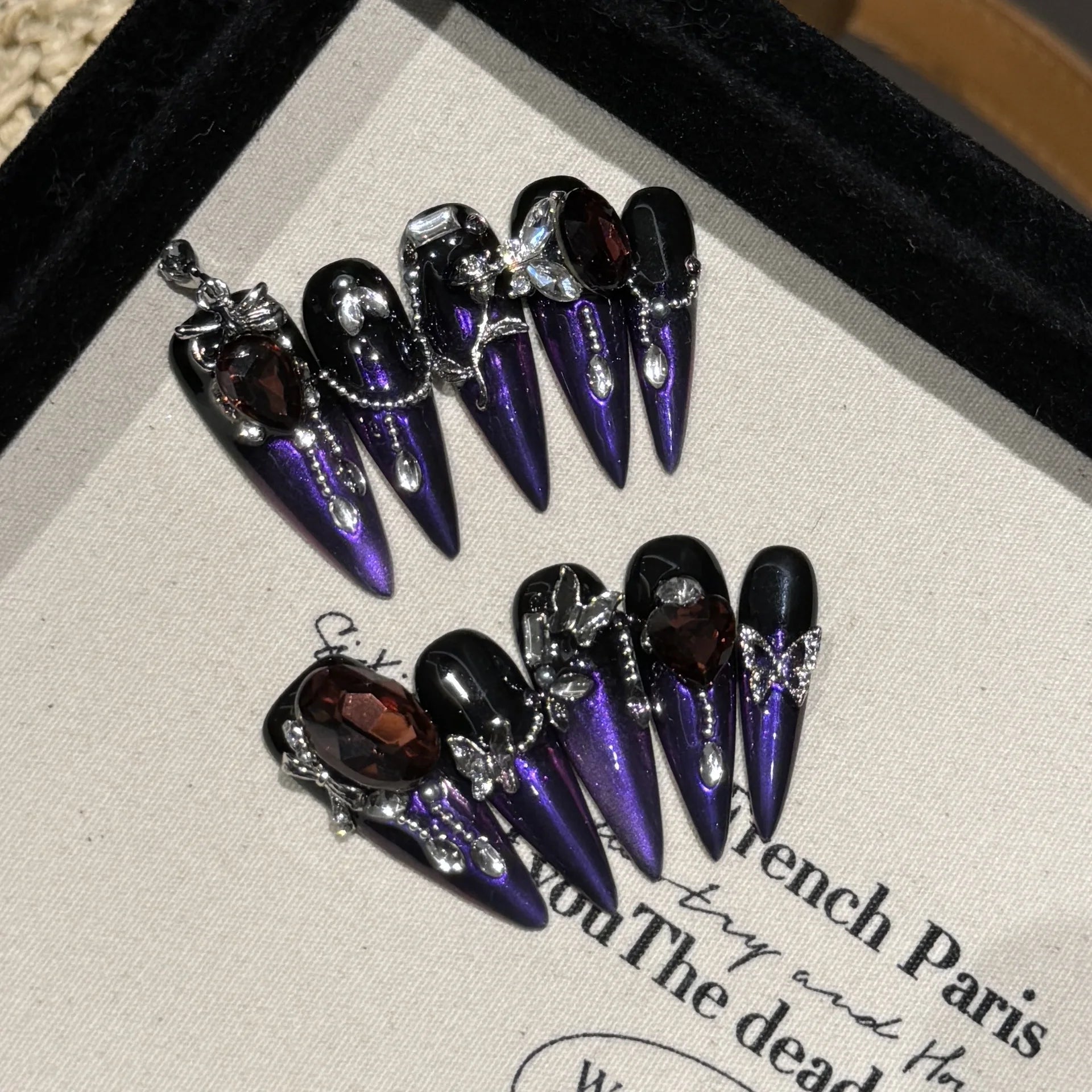 GETADME 핸드메이드 프레스온 네일 샤이니 핑크 캣아이 가짜 네일 (여성용) 착용 가능한 글리터 풀 크리스탈 디자인 가짜 네일 팁