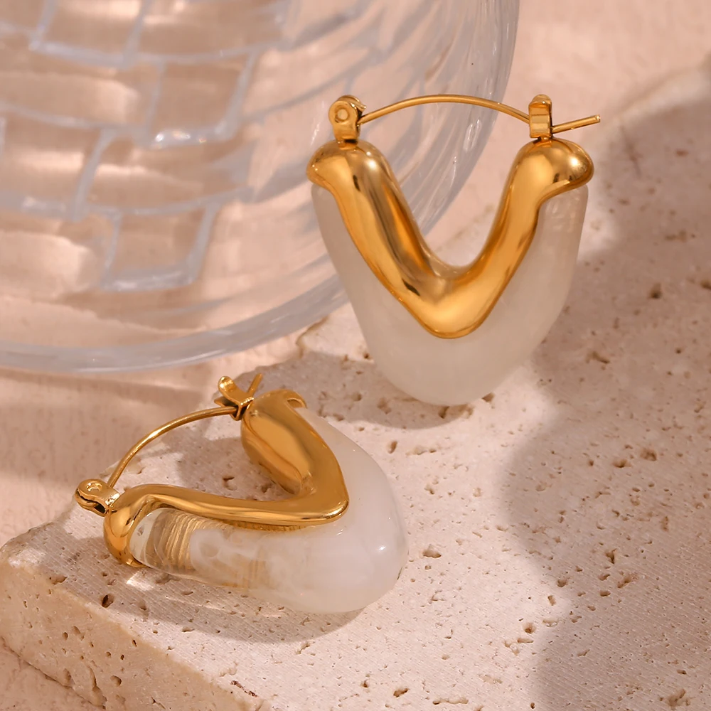GETADME Ins Blogger Style Fashion Textured Acrylic Amber Green White Gold Plated Steel V Shape Hoop Earrings zielone kolczyki damskie