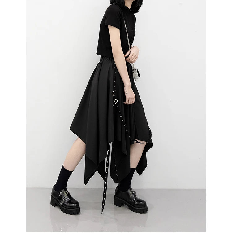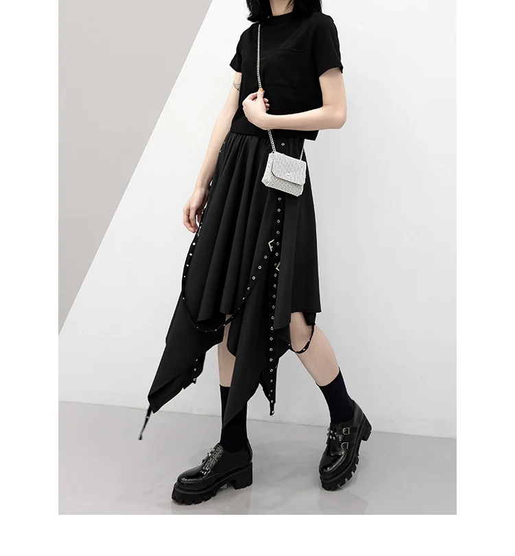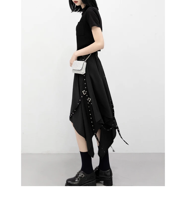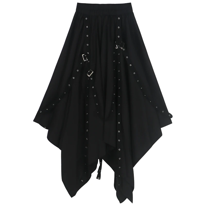 GETADME 이레귤러 스커트 여아용 신상 다크 타이 스트리트 펑크 윈드 위브 버클 미디엄 길이 Y2K 고딕 롱 스커트