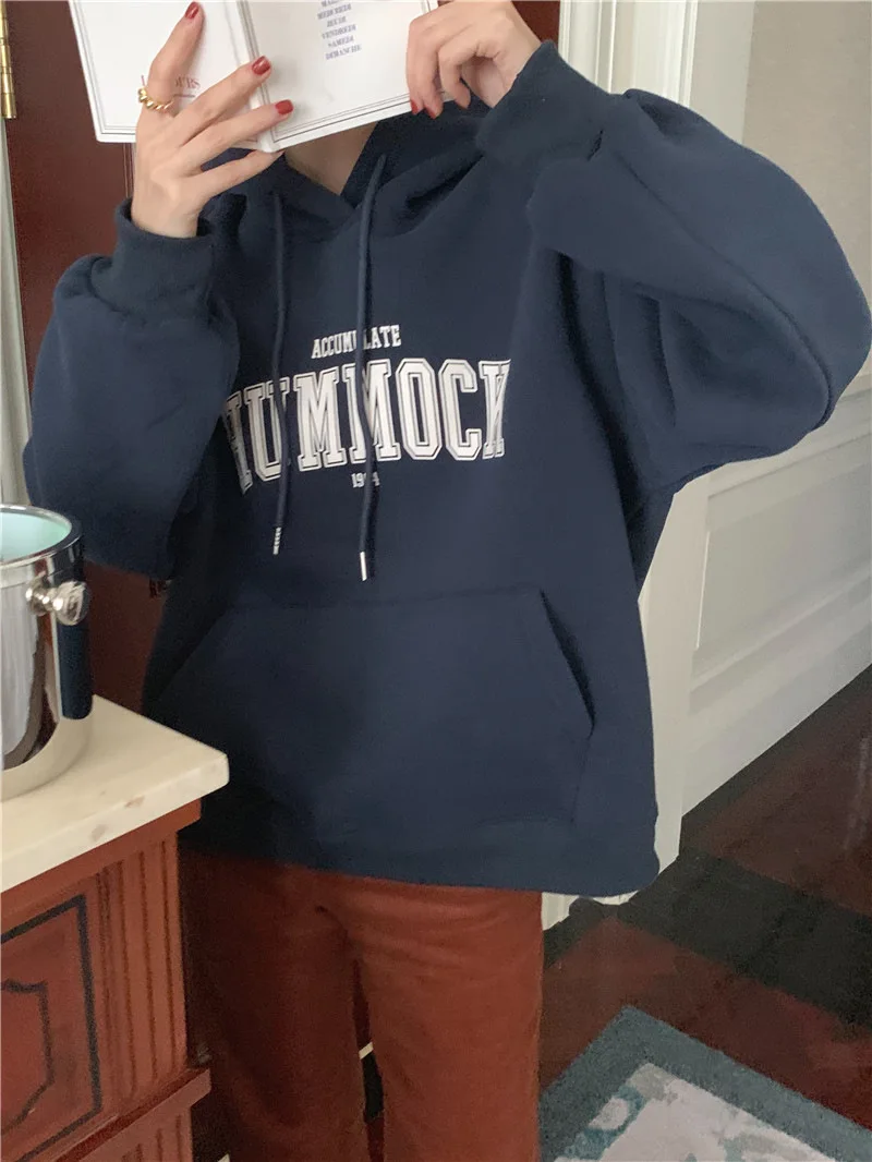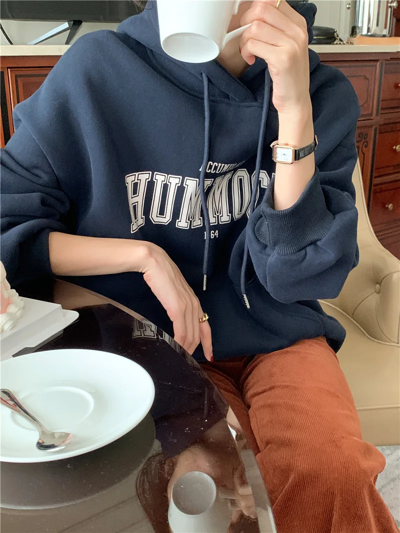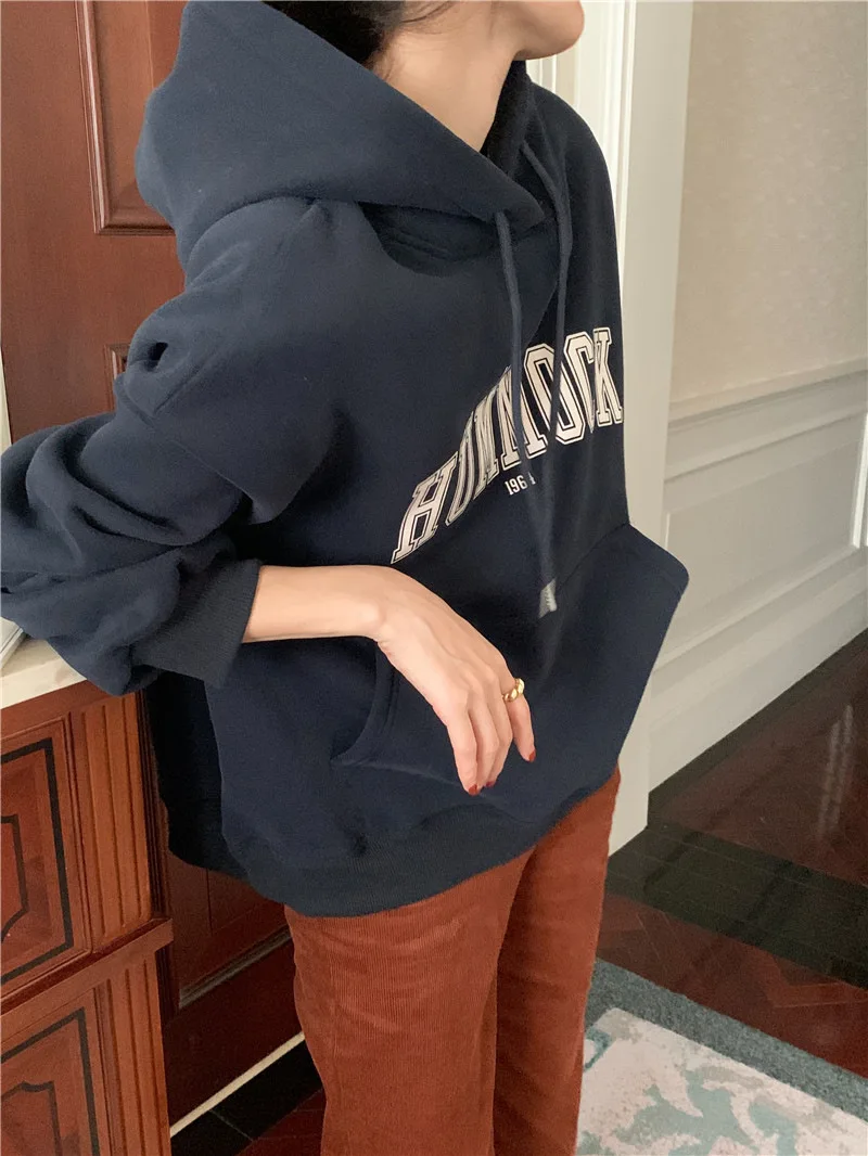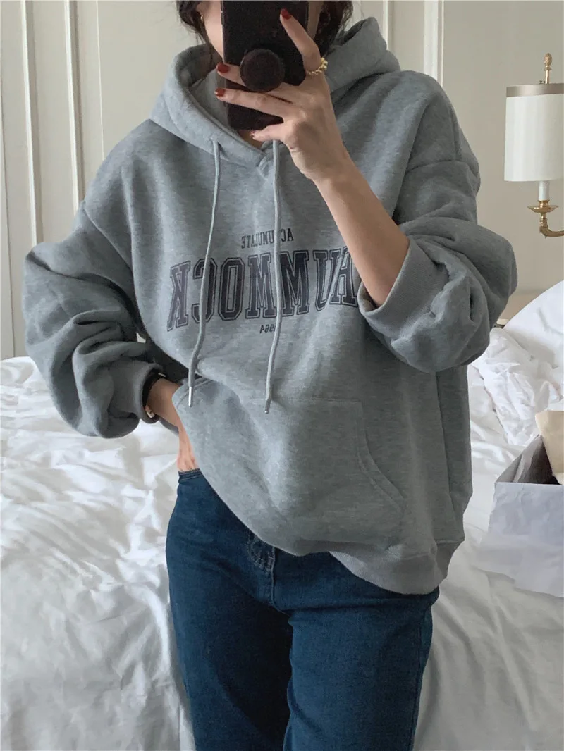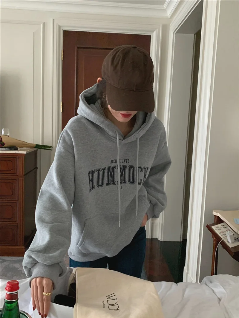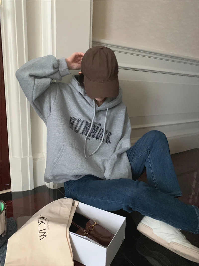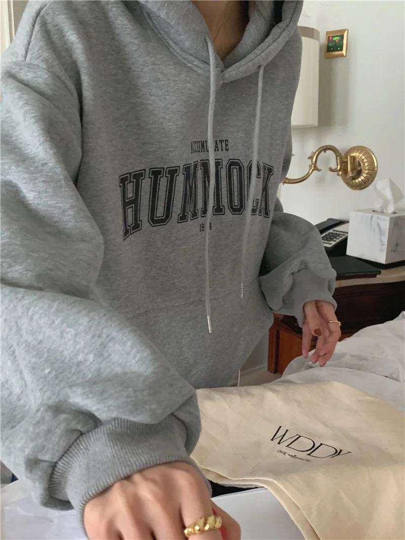 GETADME 한국식 루즈 후드 스타일 스타일리시한 중간 길이 후드 여성용 긴팔 레이지 스타일 레터 프린트 탑