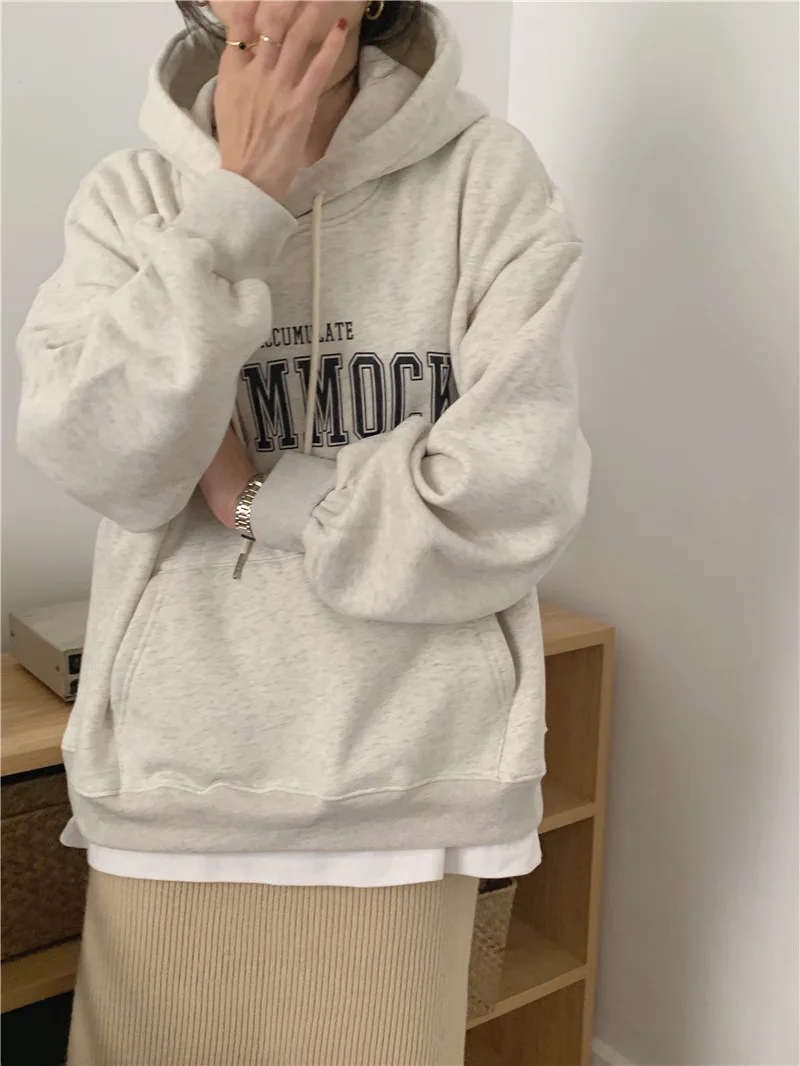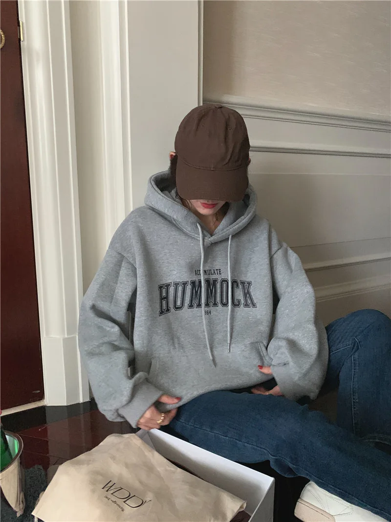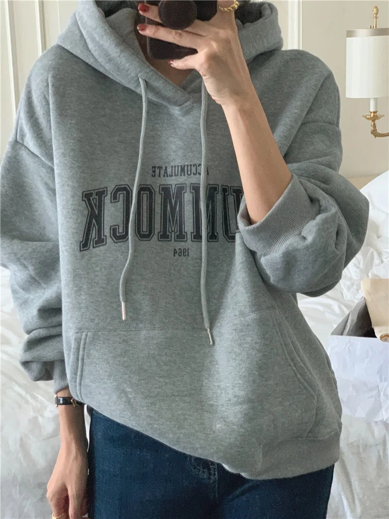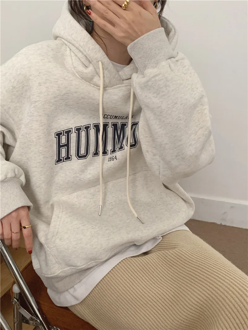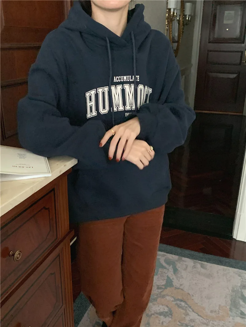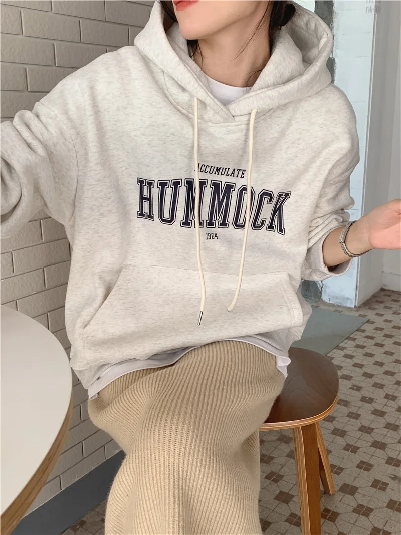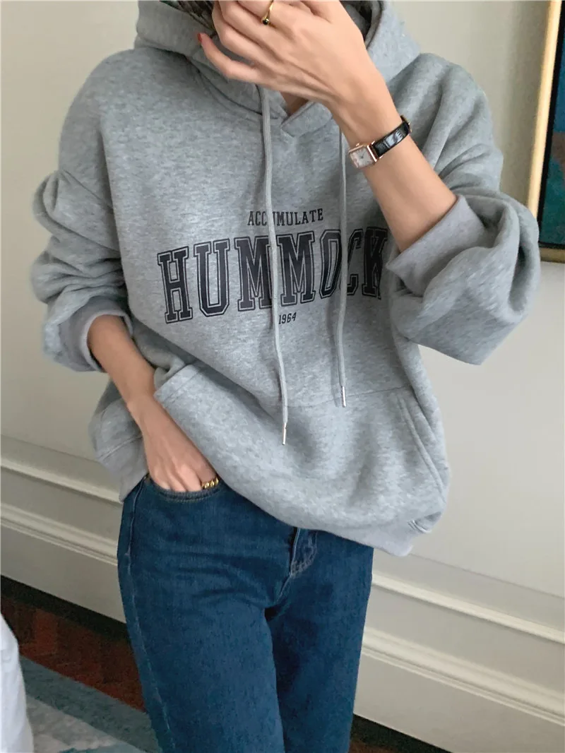 GETADME 한국식 루즈 후드 스타일 스타일리시한 중간 길이 후드 여성용 긴팔 레이지 스타일 레터 프린트 탑
