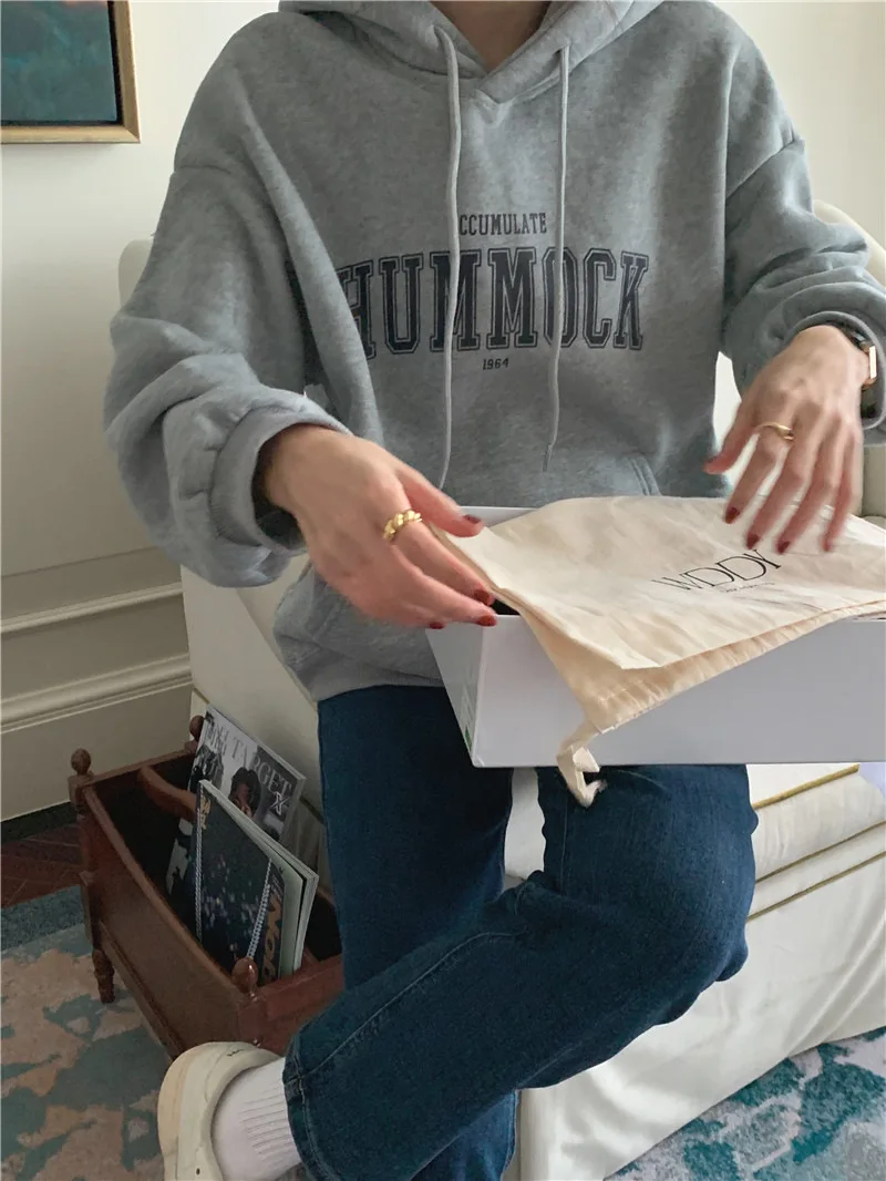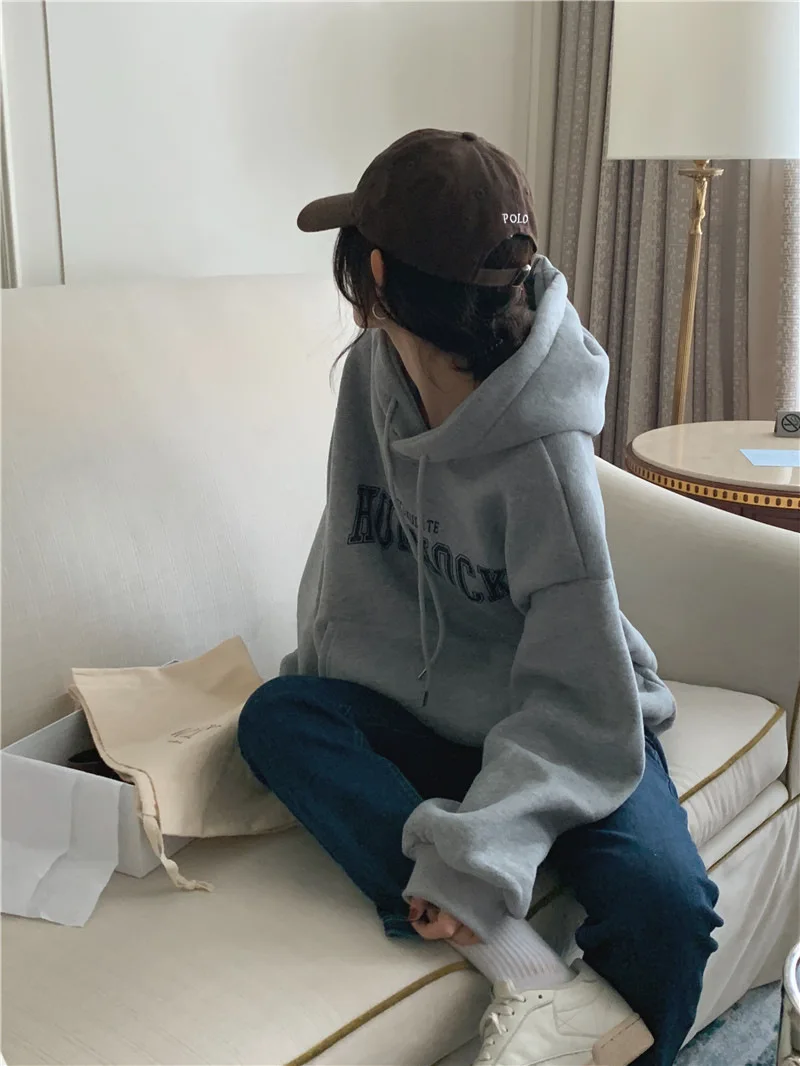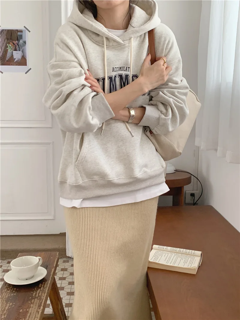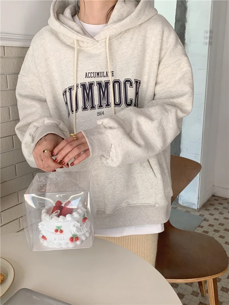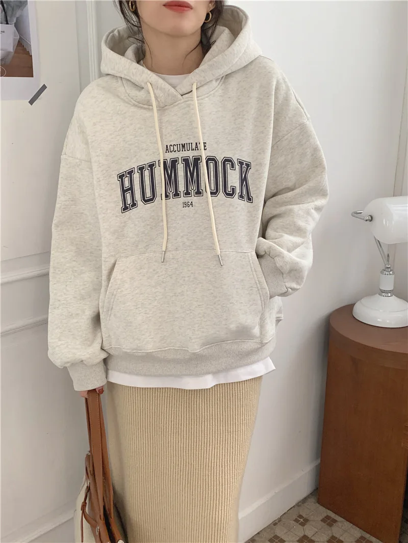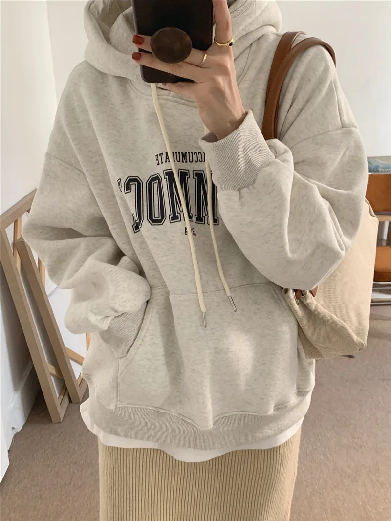 GETADME 한국식 루즈 후드 스타일 스타일리시한 중간 길이 후드 여성용 긴팔 레이지 스타일 레터 프린트 탑