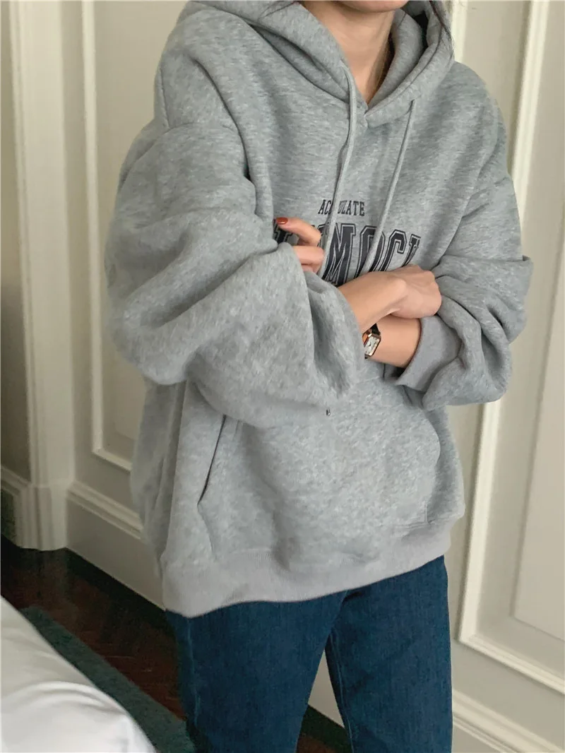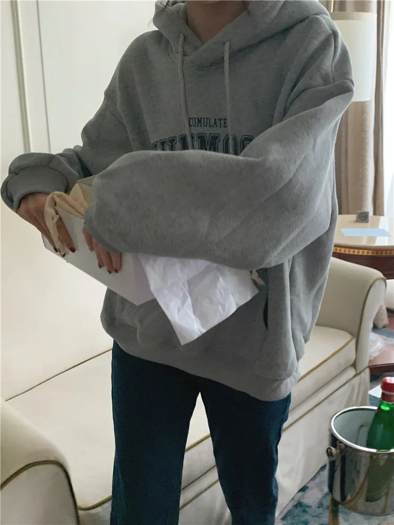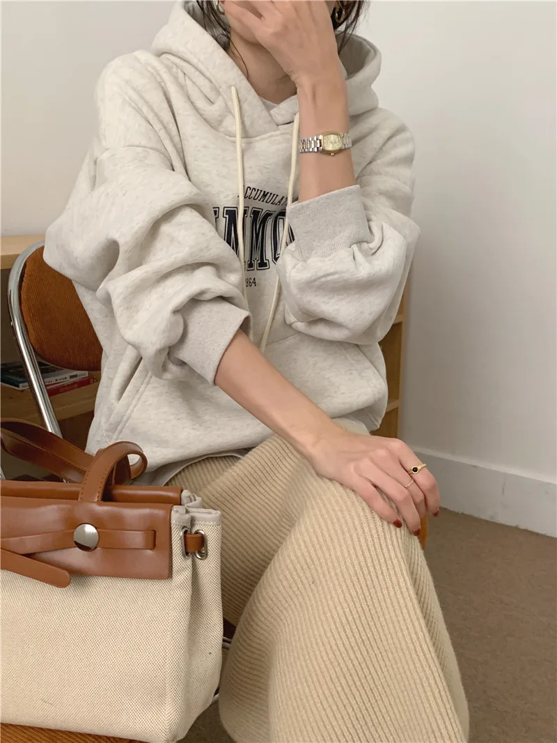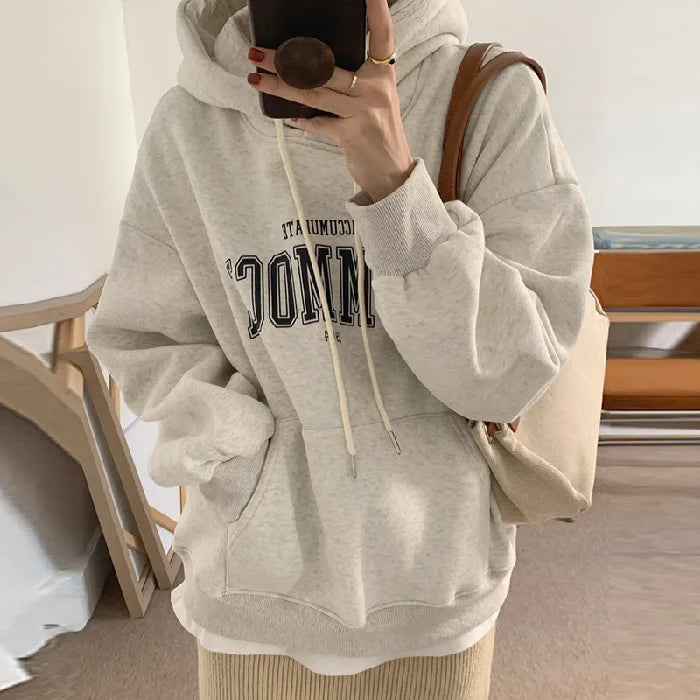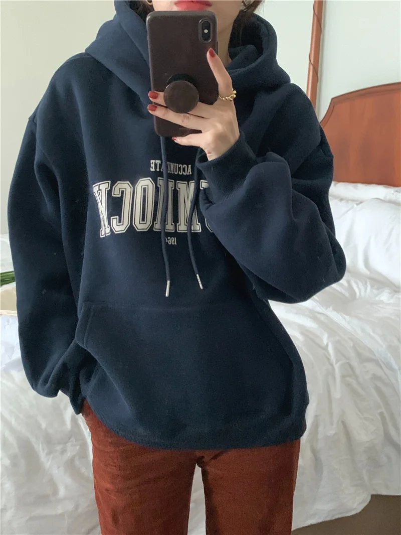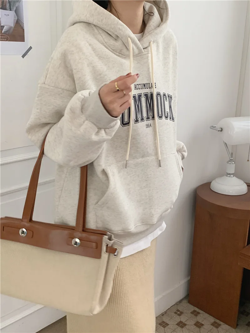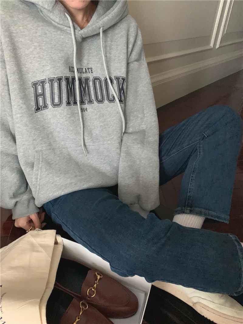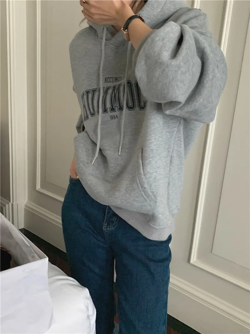 GETADME 한국식 루즈 후드 스타일 스타일리시한 중간 길이 후드 여성용 긴팔 레이지 스타일 레터 프린트 탑