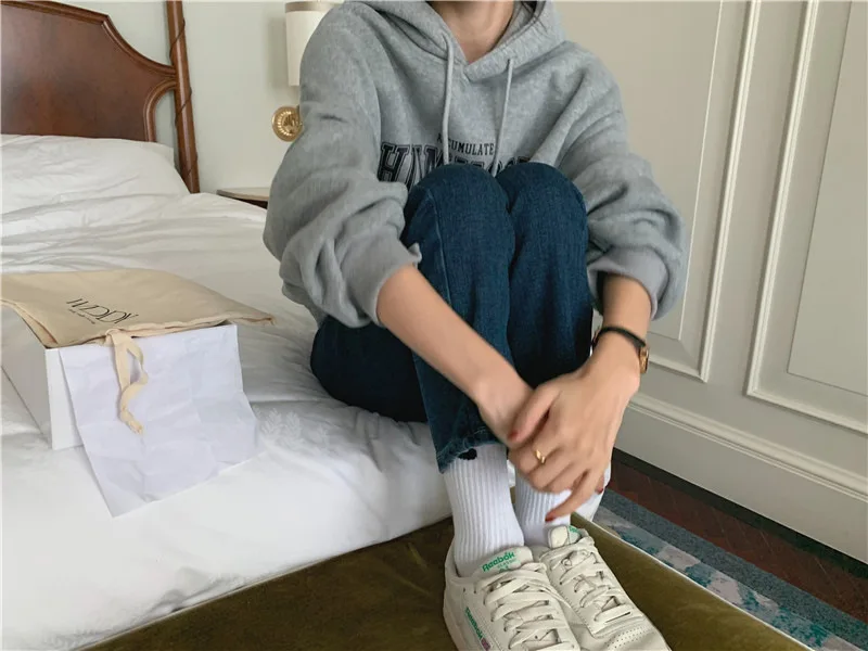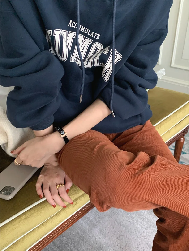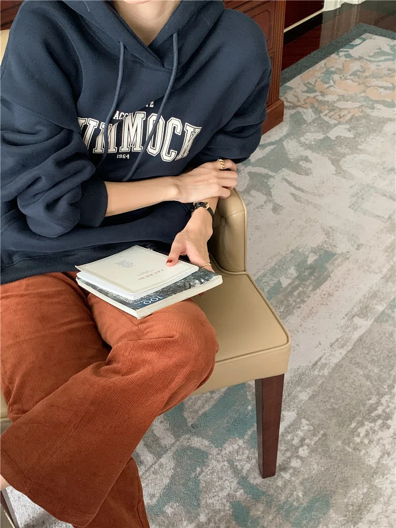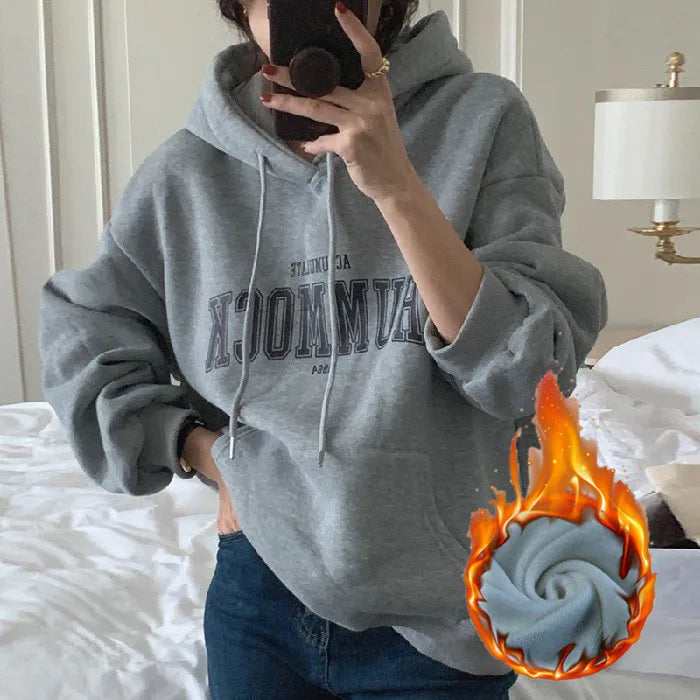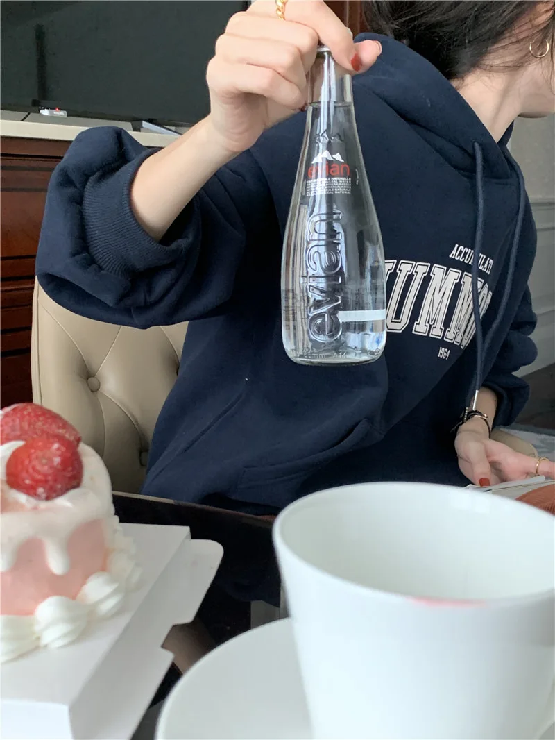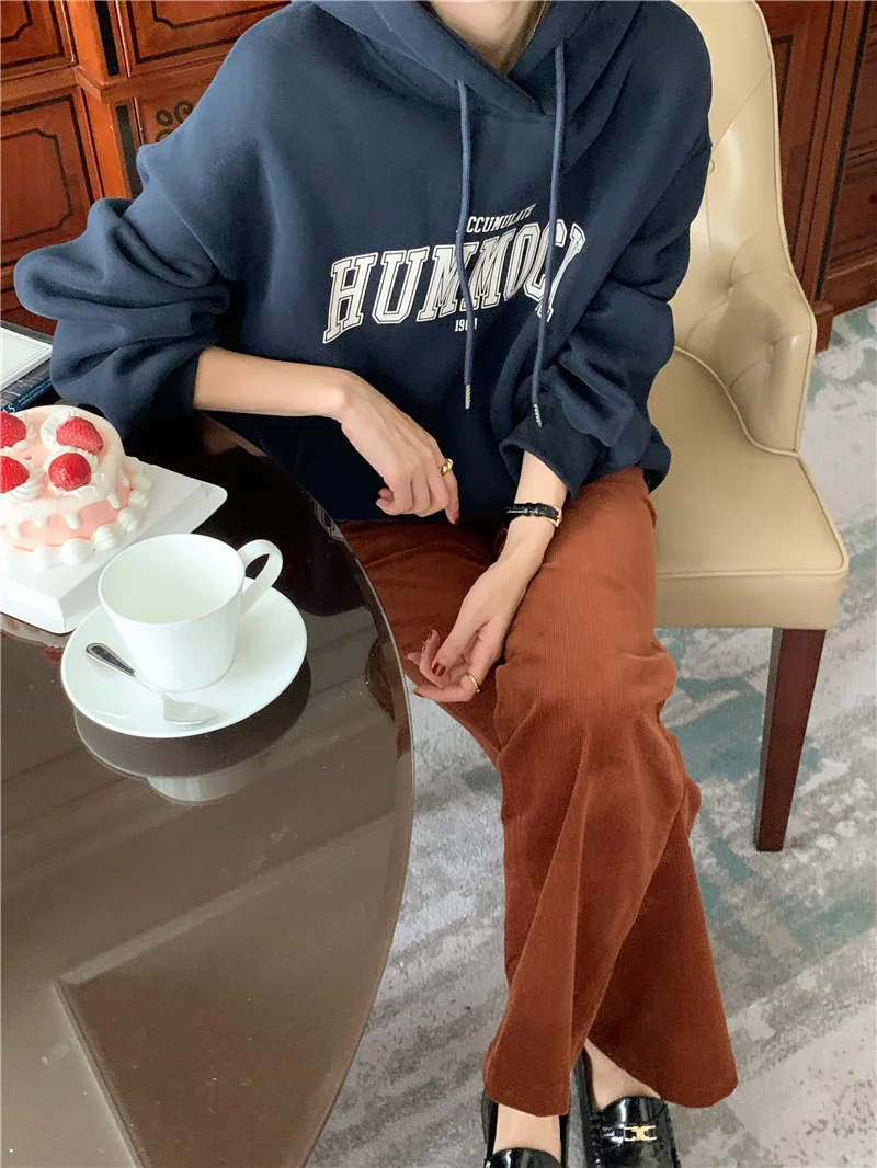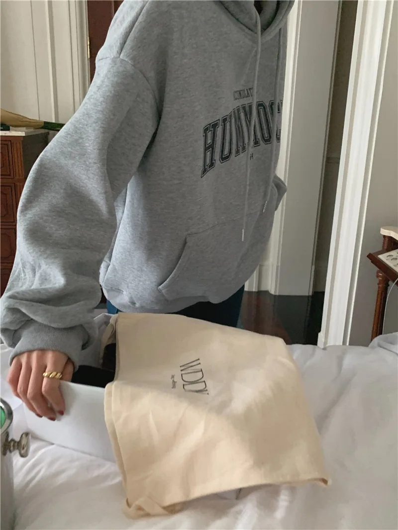 GETADME 한국식 루즈 후드 스타일 스타일리시한 중간 길이 후드 여성용 긴팔 레이지 스타일 레터 프린트 탑