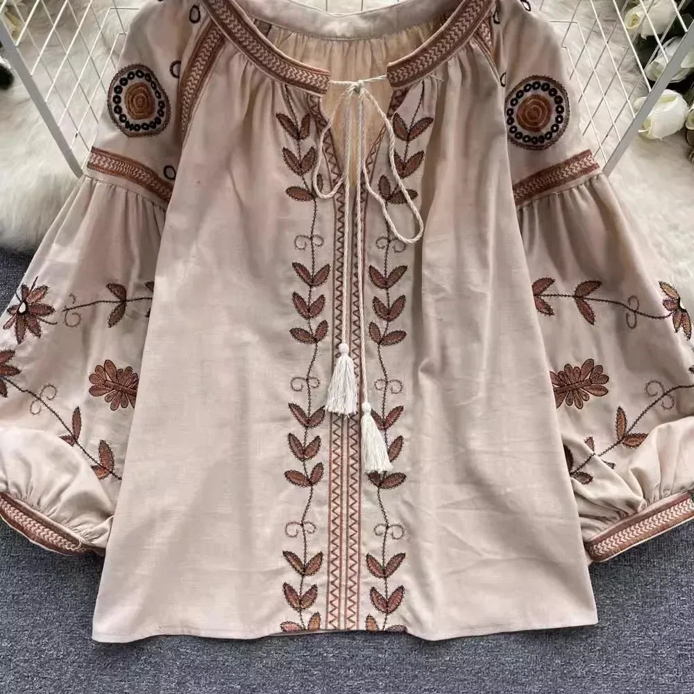 GETADME Neploe 여성 O넥 퍼프 슬리브 프린트 헤비 셔츠 패널 레이스업 올매치 자수 내셔널 스타일 블라우스 새로운 태슬 탑