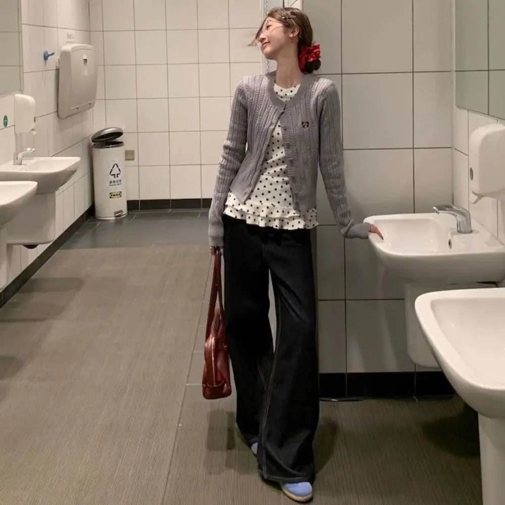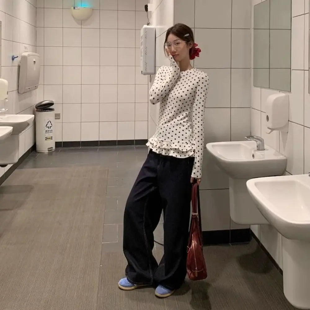 GETADME 새로운 러플 트림 긴팔 티셔츠 물방울 무늬 얇은 내부 탑 스위트 베로 모다