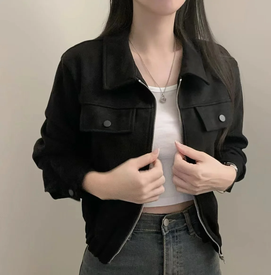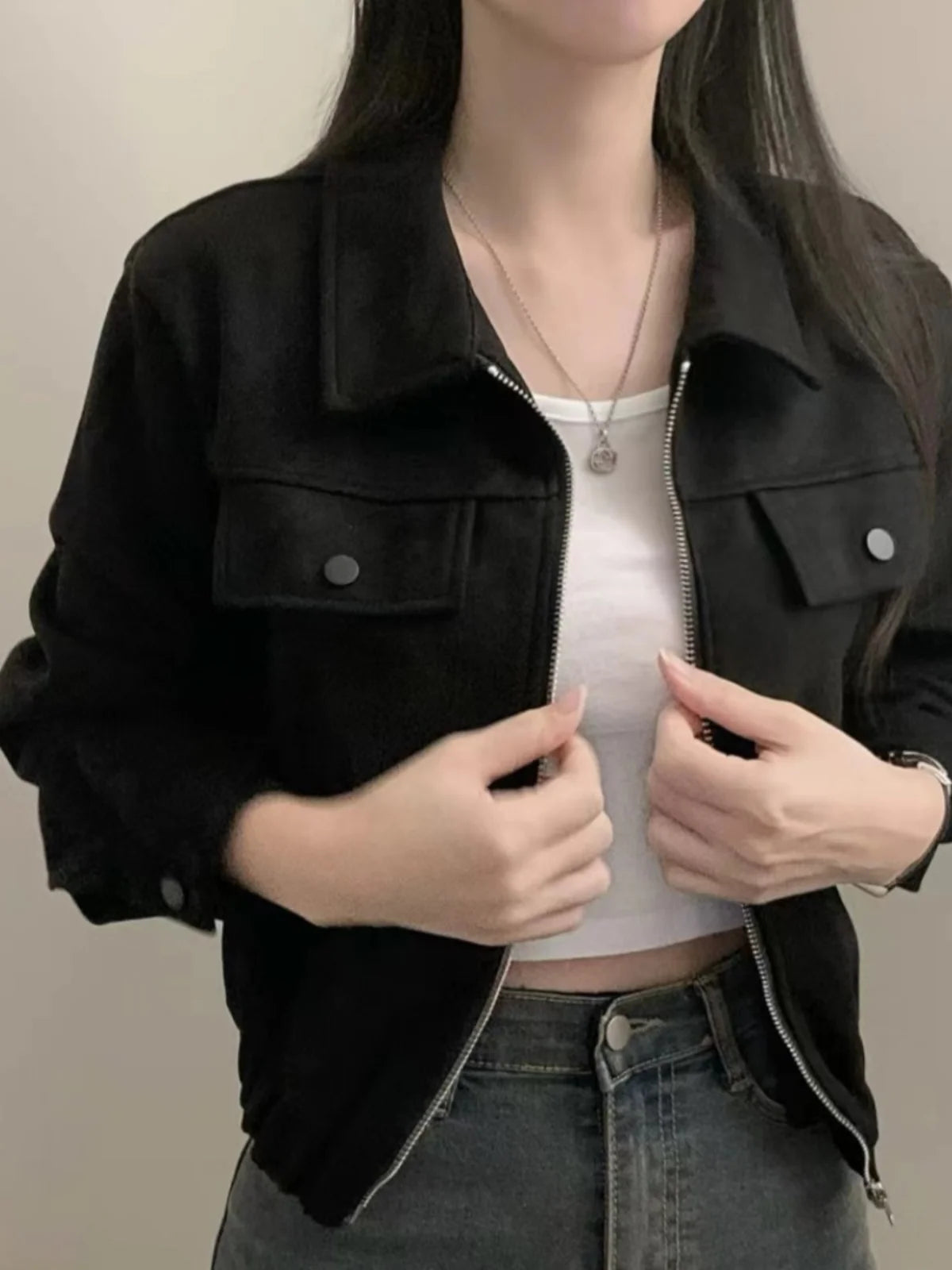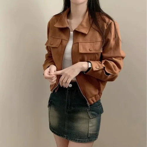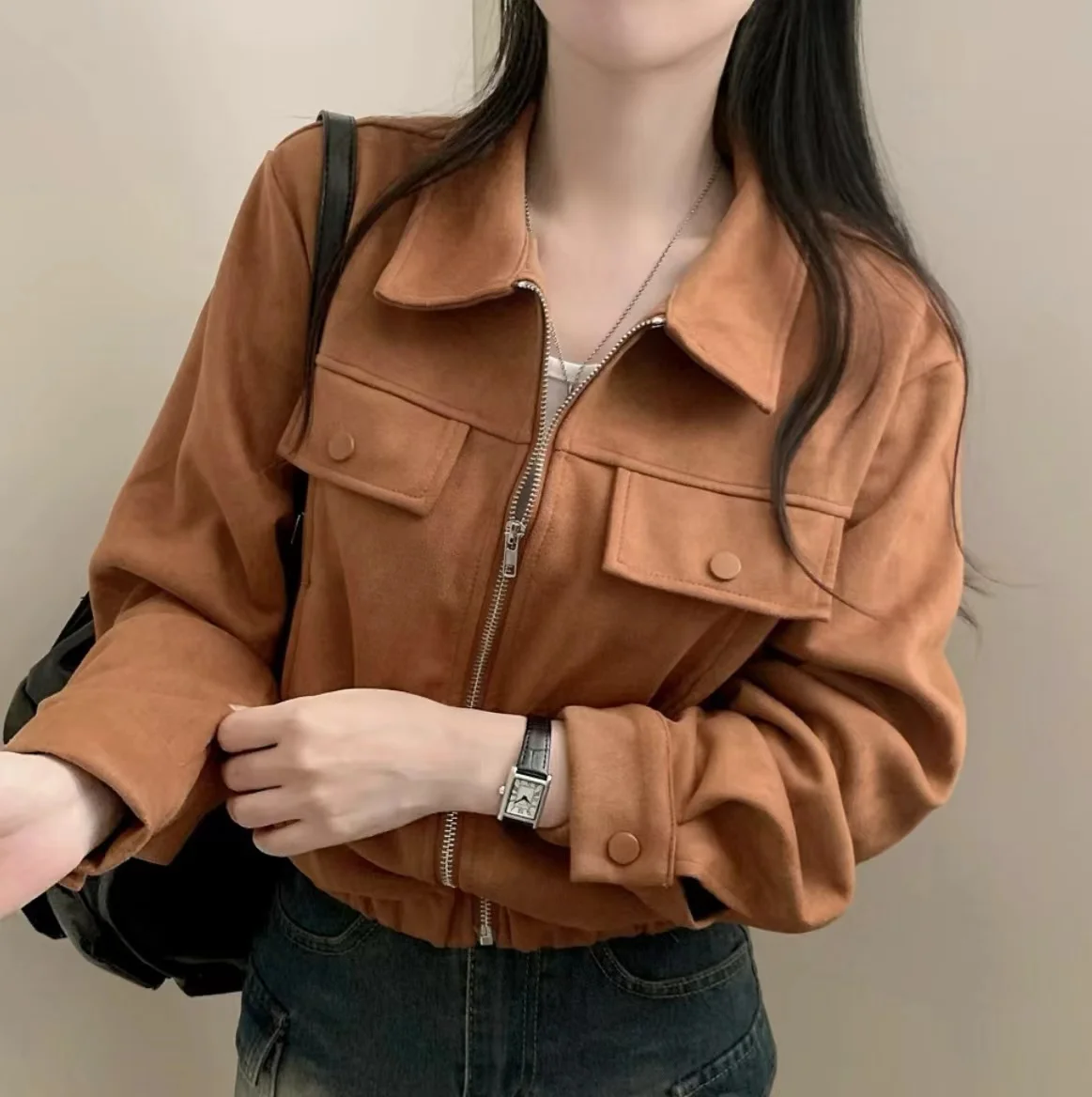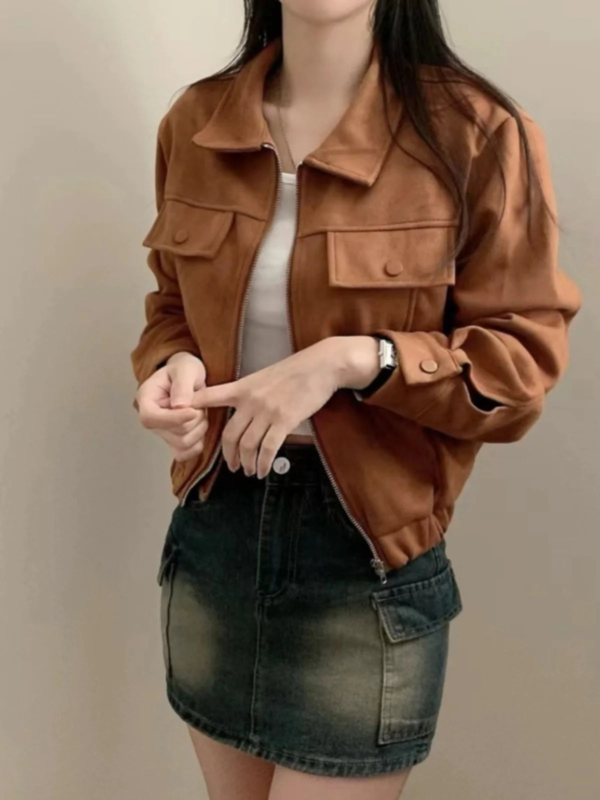 GETADME 레트로 라펠 모터사이클 재킷 여성용 스웨이드 롱 스웨이드 루즈핏 슬릿 지퍼 디자인 가을 아우터웨어 Faionable