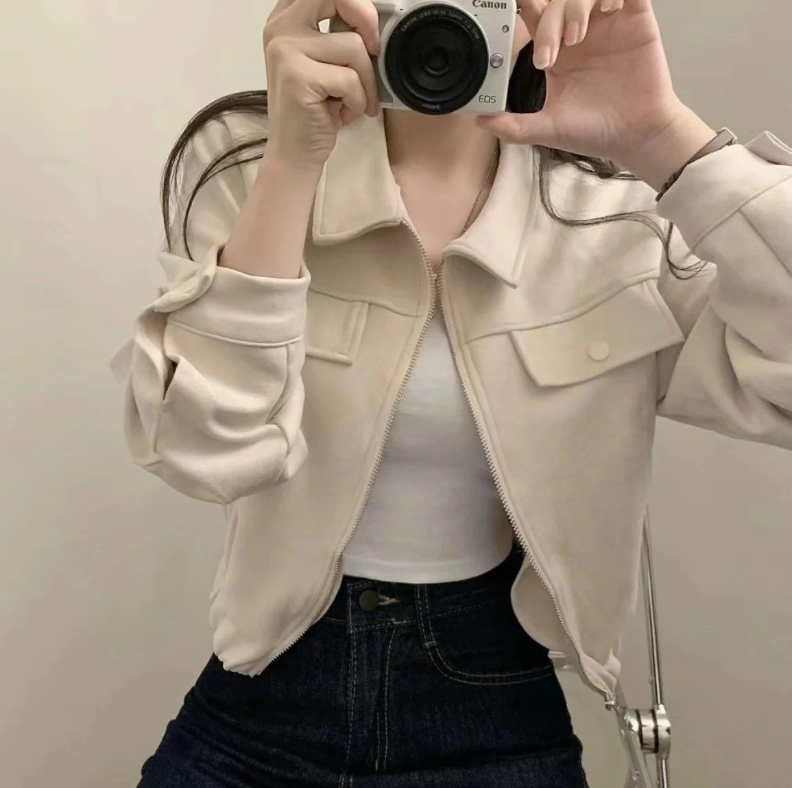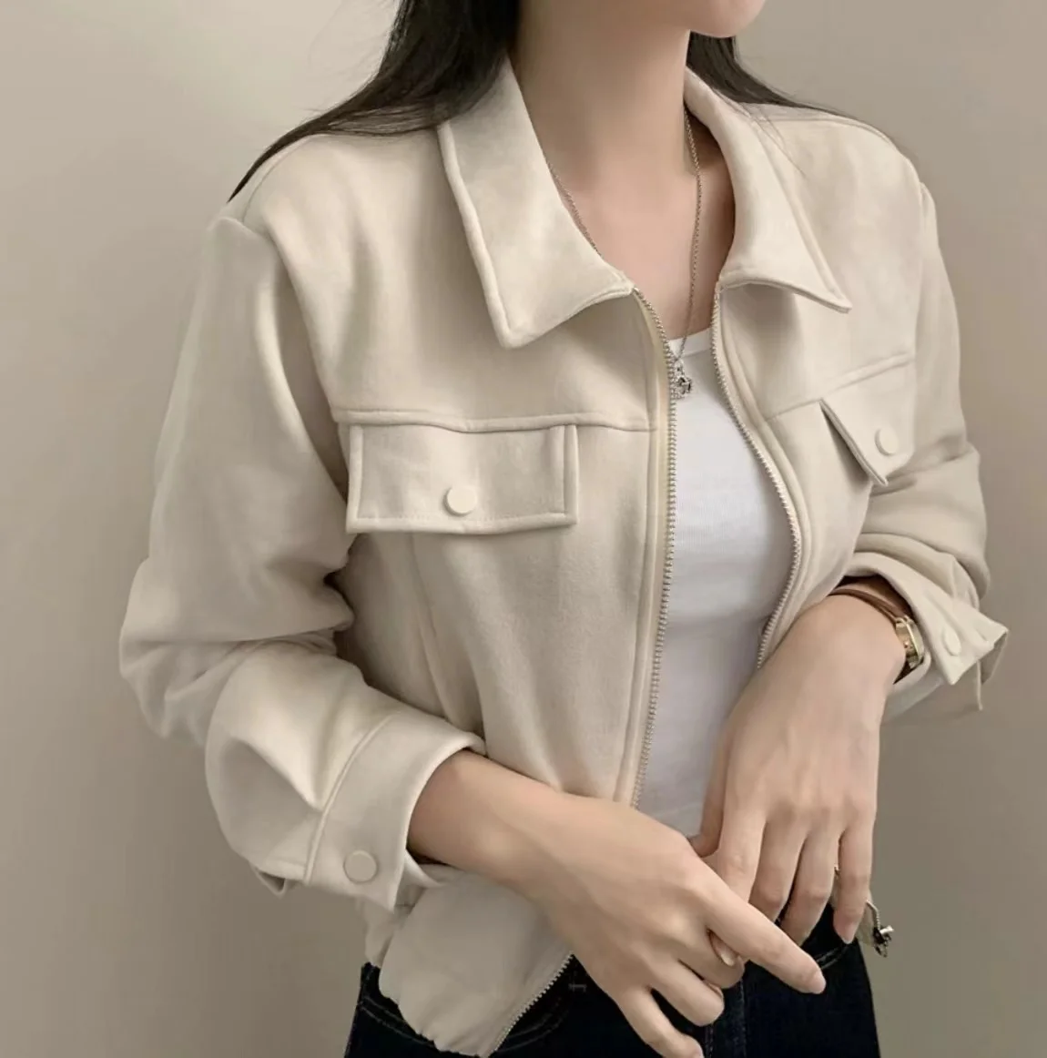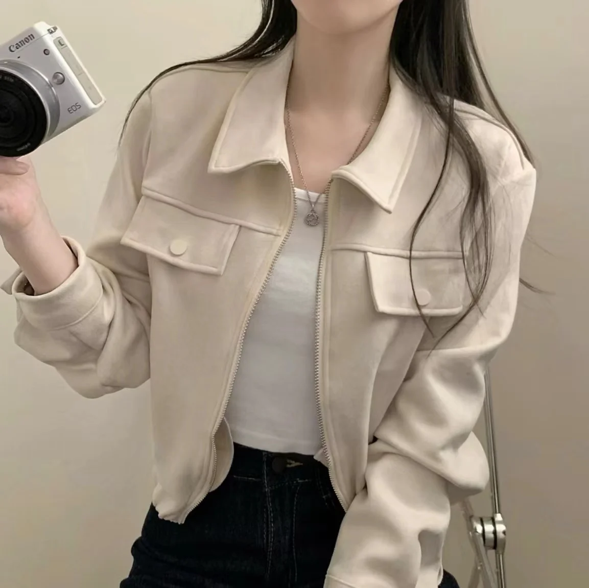 GETADME 레트로 라펠 모터사이클 재킷 여성용 스웨이드 롱 스웨이드 루즈핏 슬릿 지퍼 디자인 가을 아우터웨어 Faionable
