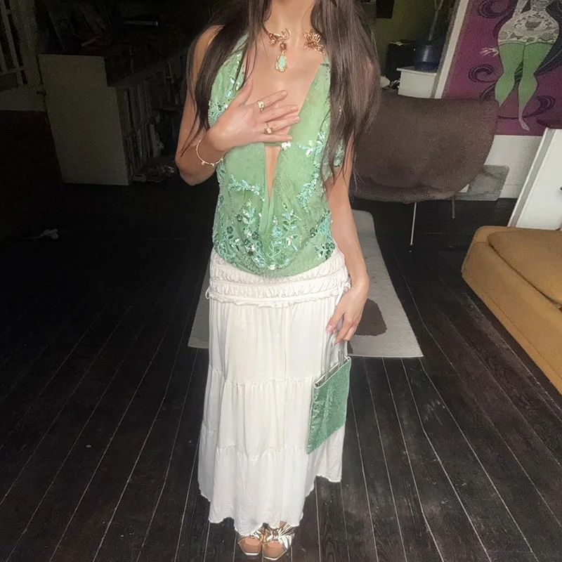 GETADME 섹시 홀터넥 딥 V 스팽글 클럽 파티 탑 여름 할로우 아웃 슬리브리스 스트리트 여성 블라우스 패션 백리스 프린트 슬림 셔츠