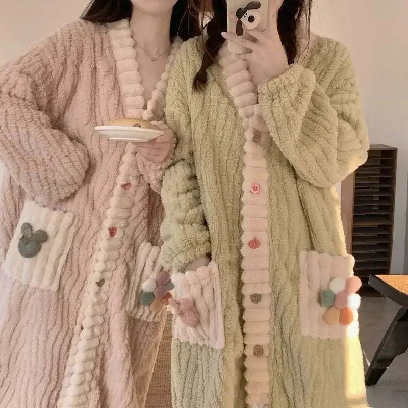 GETADME 겨울 신상품 산호색 플리스 나이트가운 여성 싱글 브레스티드 V넥 따뜻하고 달콤한 잠옷 여성 롱 플란넬 홈 퍼 여성 가운
