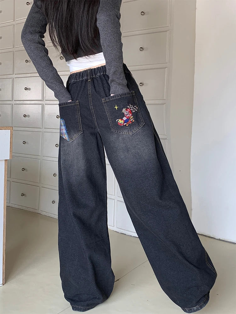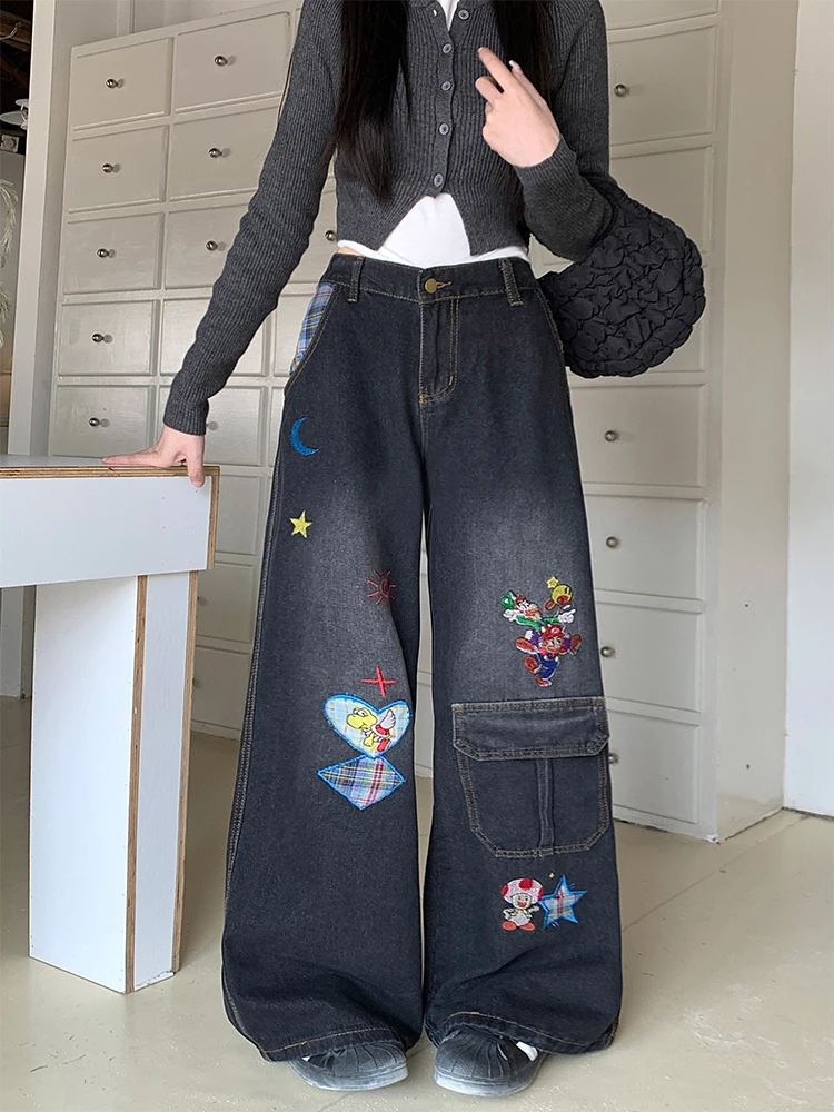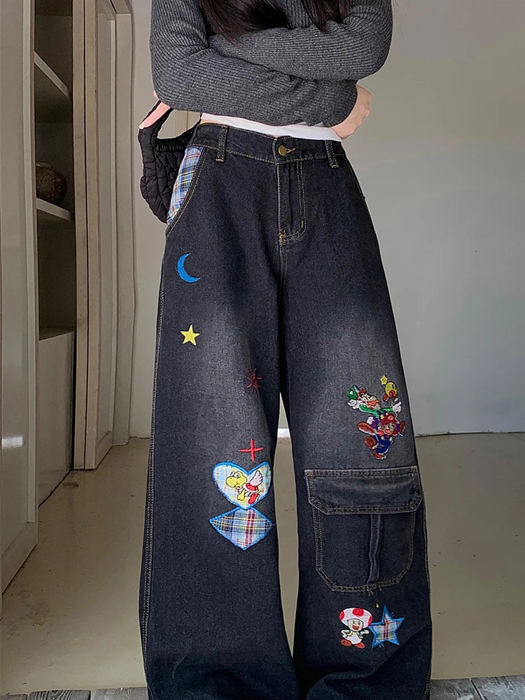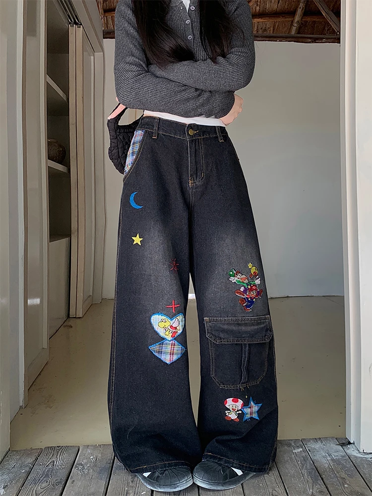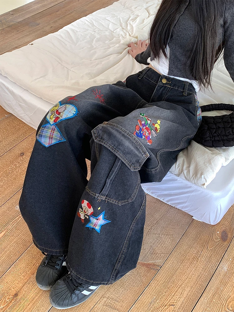 GETADME 여성 소녀 애니메이션 자수 청바지 귀여운 코어 로우 라이즈 그런지 일본 하라주쿠 갸루 Y2K 데님 팬츠 힙합 2000년대 미학 새 상품