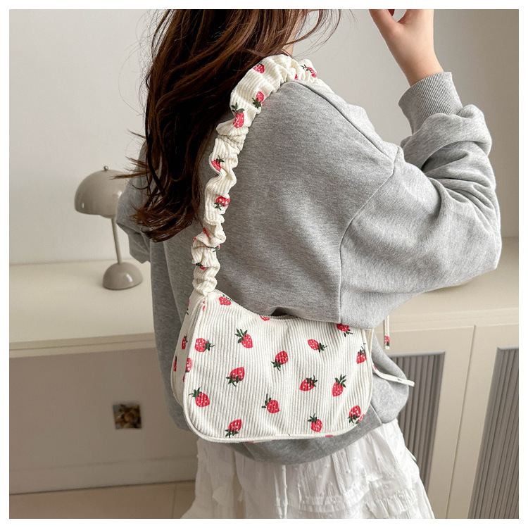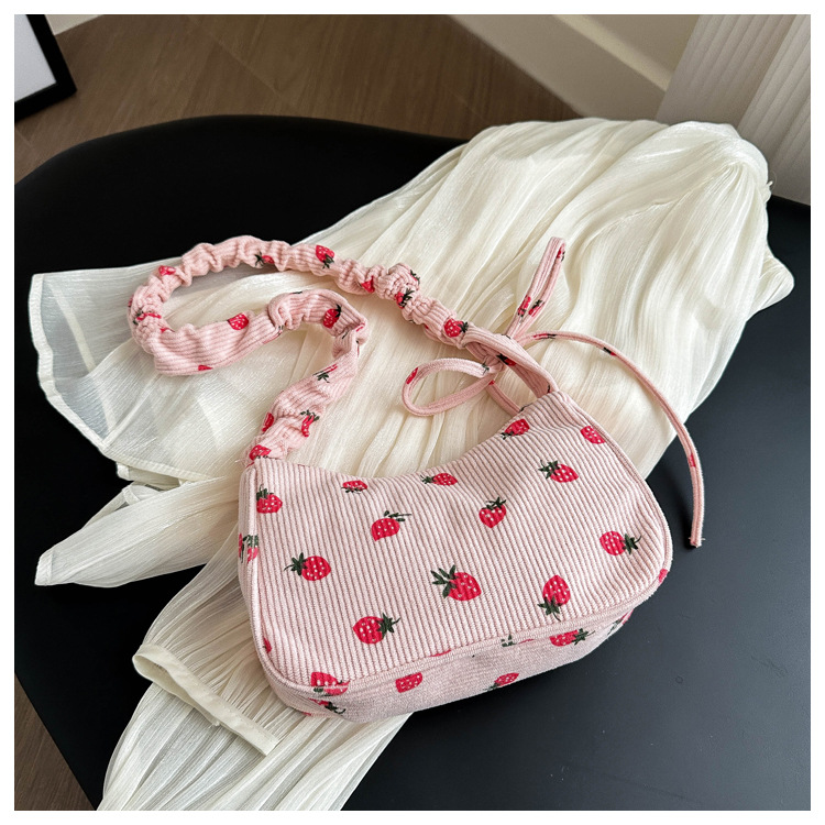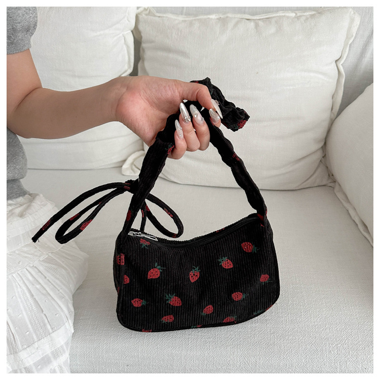 GETADME 여성 소형 겨드랑이 가방 코듀로이 핸드백 귀여운 딸기 프린트 작은 토트백 반달 디자인 에코 천 지갑 미니 숄더백