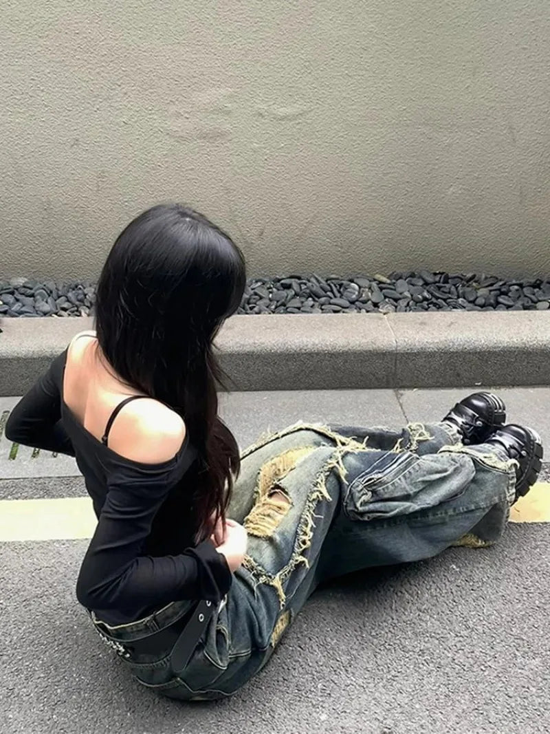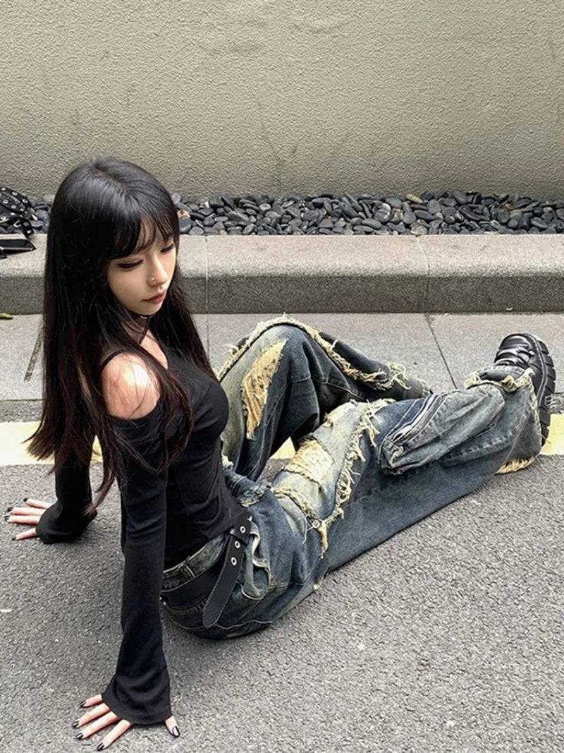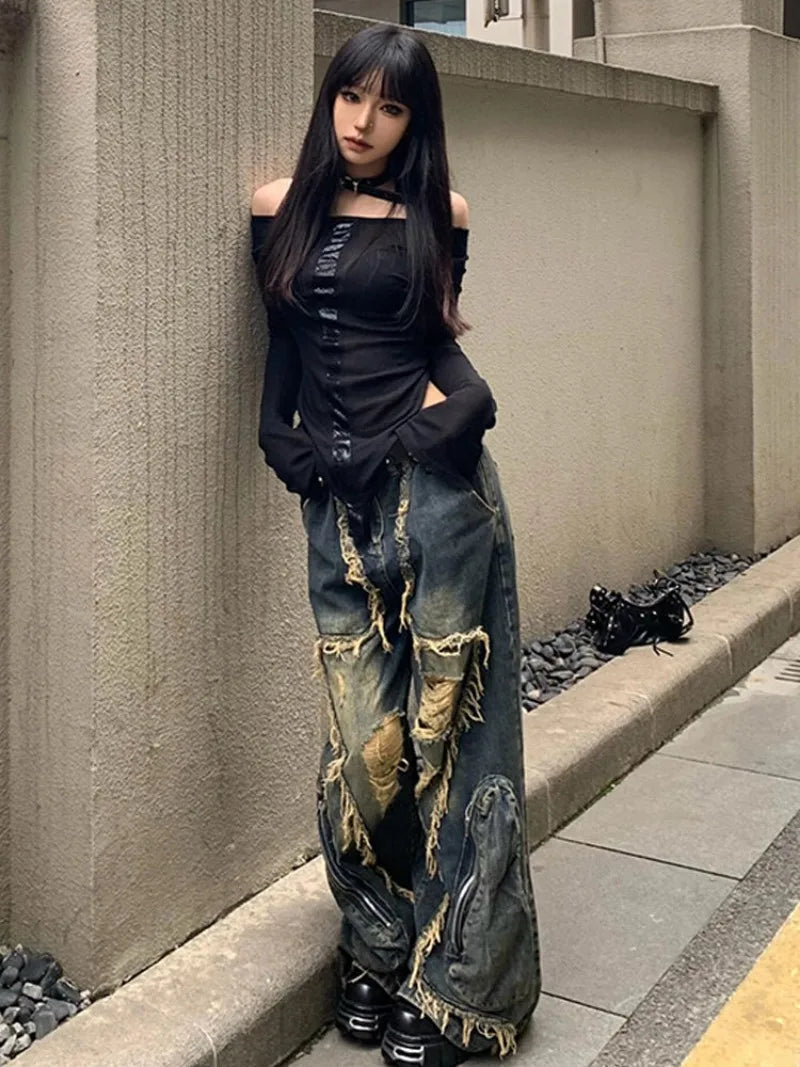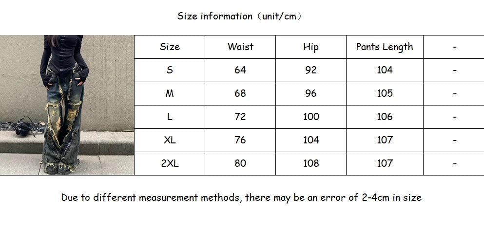 GETADME Y2K 하이 스트리트 찢어진 태슬 워시드 배기 진 여성 레트로 스트리트 힙합 루즈 올드 패션 캐주얼 하이 웨이스트 와이드 레그 진