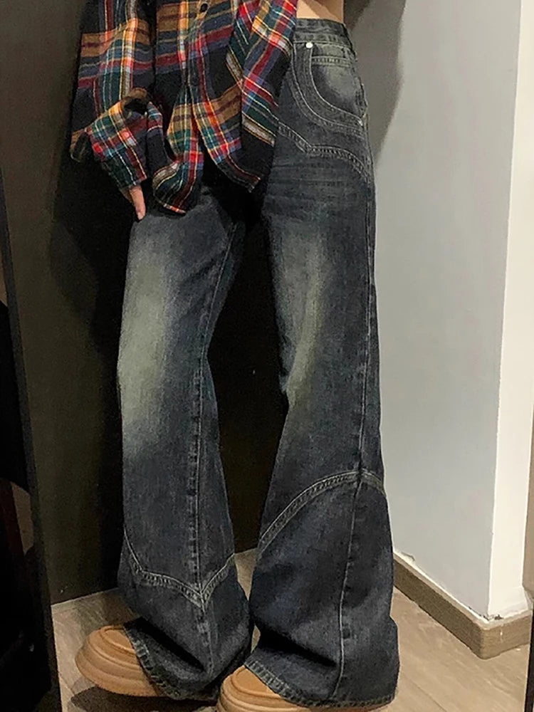 GETADME Y2K 스파이시 걸 다크 시리즈 와이드 레그 진 여성용 신상품 하이 스트리트 스플라이싱 루즈 하이 웨이스트 슬리밍 플레어 팬츠