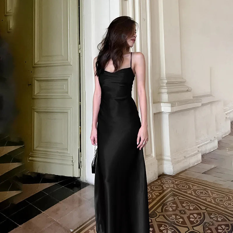 Getadme-봄과 여름 새로운 섹시한 여성용 롱 드레스 슬림 서스펜더 새틴 A-펄스 백리스 드레스 클럽 의류 베스티도