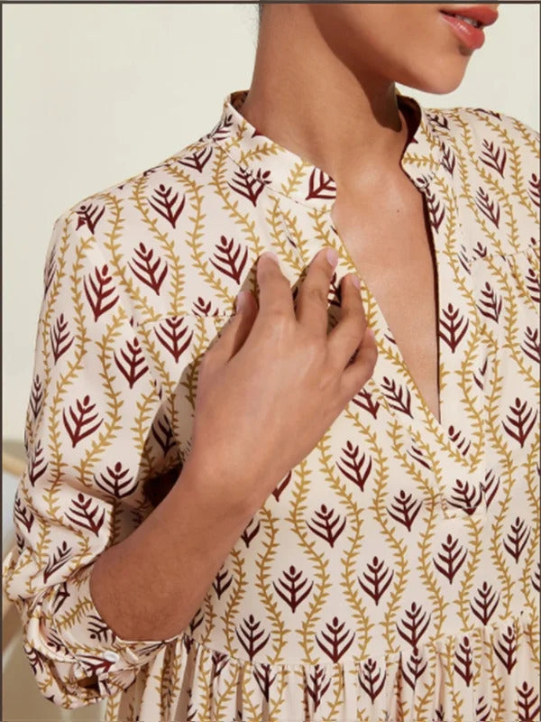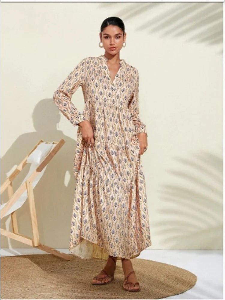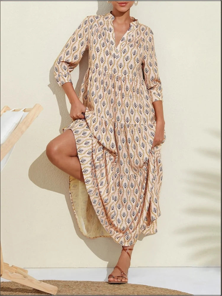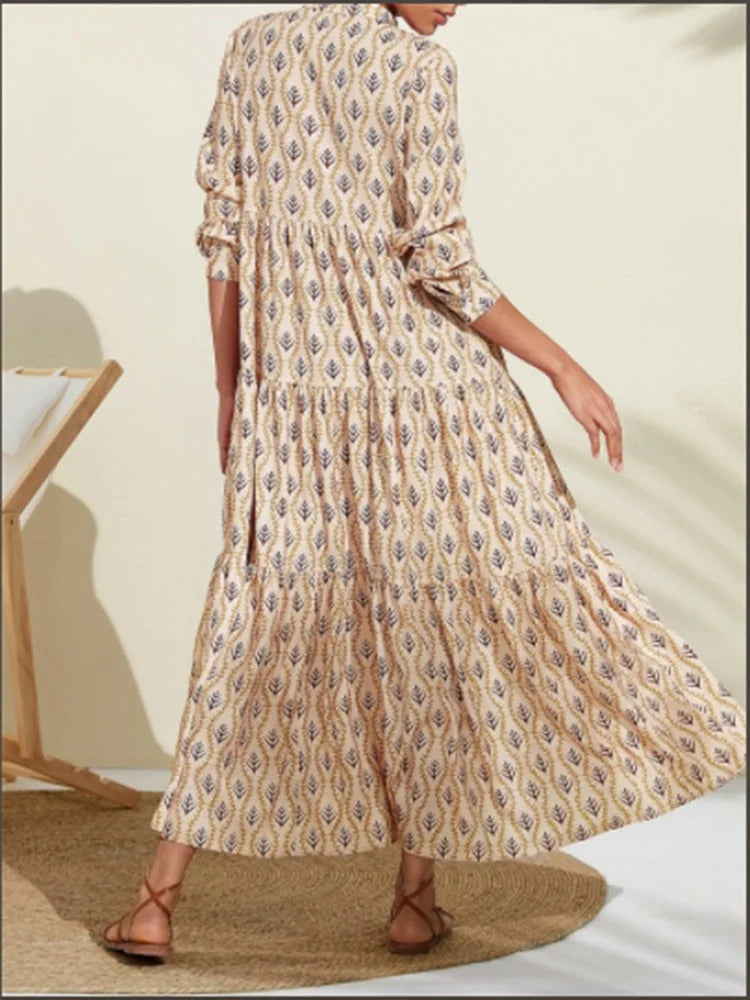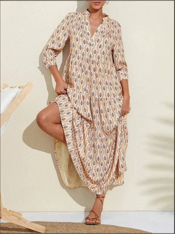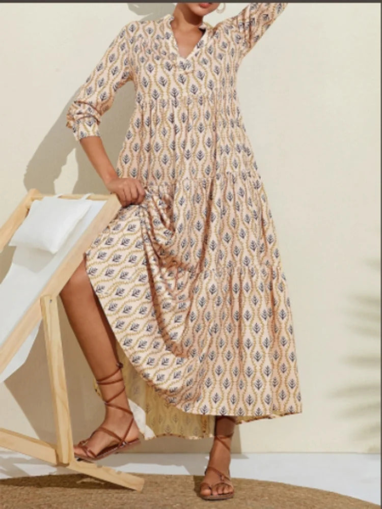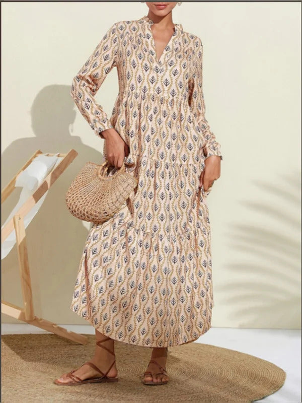 가을 루즈 드레스 V넥 프린트 긴팔 드레스 여성용 우아한 휴가 파티 드레스 가운
