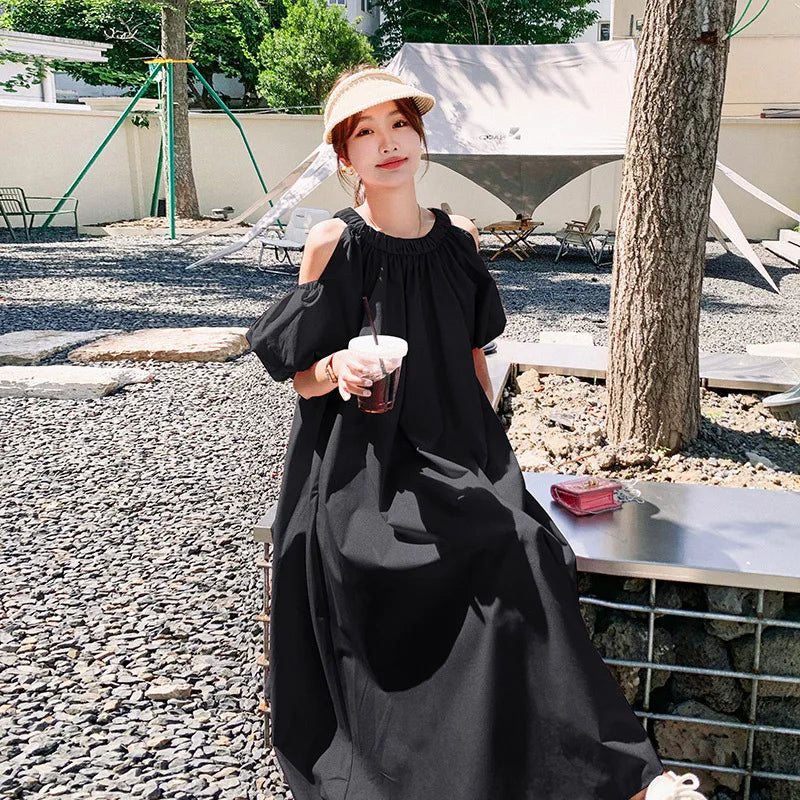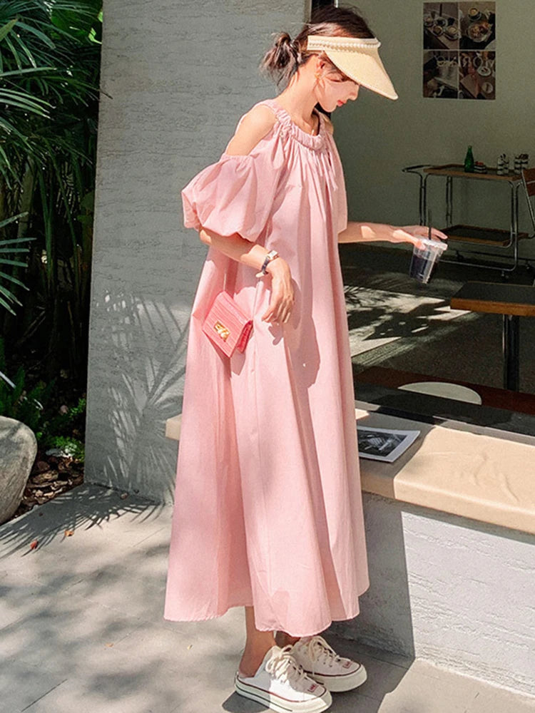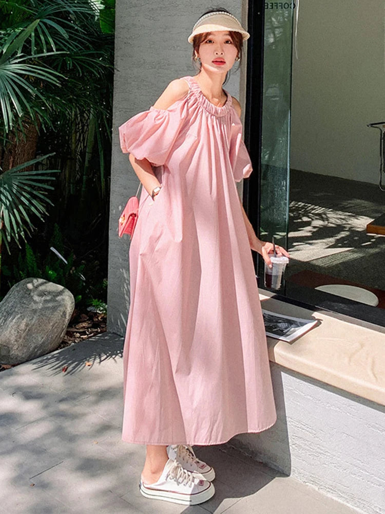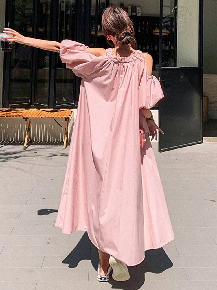 Getadme-캐주얼 루즈 여성 드레스 중공 소매 디자인 단색 A라인 롱 드레스 패션 2024 신상품 의류