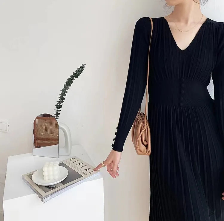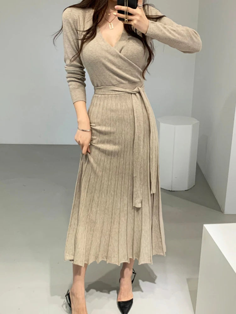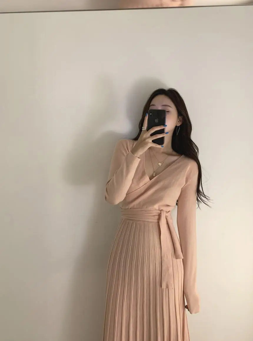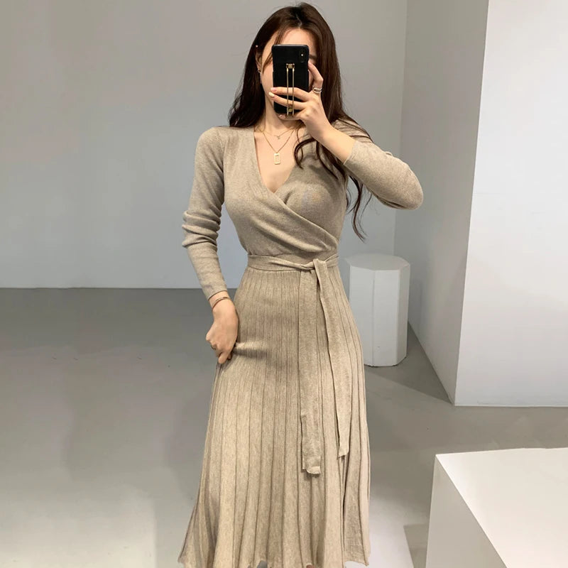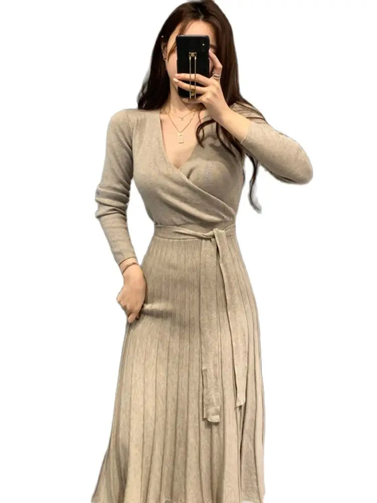 드레스 신축성 있는 여성 니트 바디콘 펜슬 드레스 가을 겨울 솔리드 베스디소 긴팔 V넥 슬림 레이디 시크 드레스