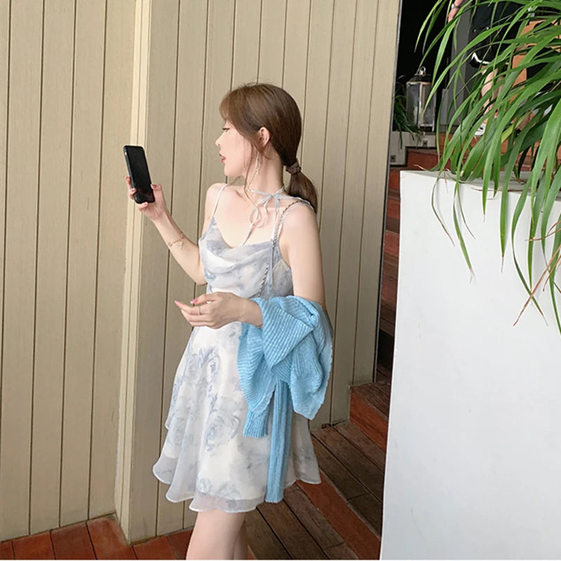 Getadme 패션 섹시 V넥 스파게티 스트랩 플로럴 얇은 쉬폰 드레스 여성 여름 백리스 신축성 하이웨이스트 파티 클럽 미니 드레스