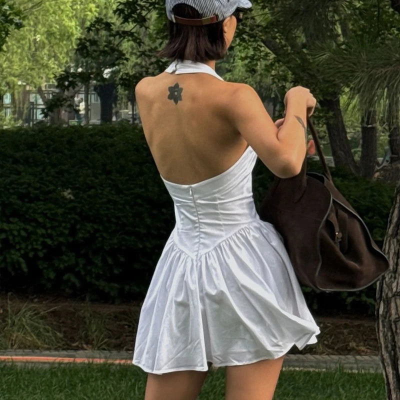 GETADME A라인 드레스 여성 여름 신상 화이트 패션 홀터넥 민소매 섹시 백리스 드레스 캐주얼 슬림 클럽 파티 우아한 레이디 드레스
